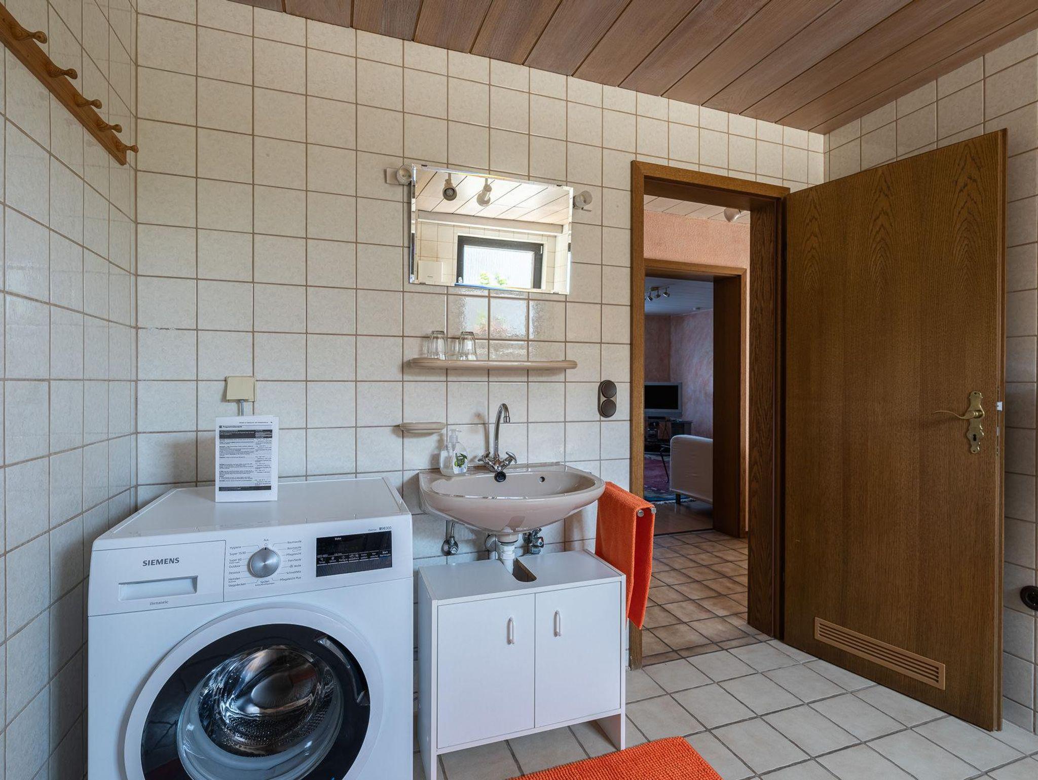 • Badezimmer mit Badewanne, Dusche, Waschmaschine und Haartrockner
