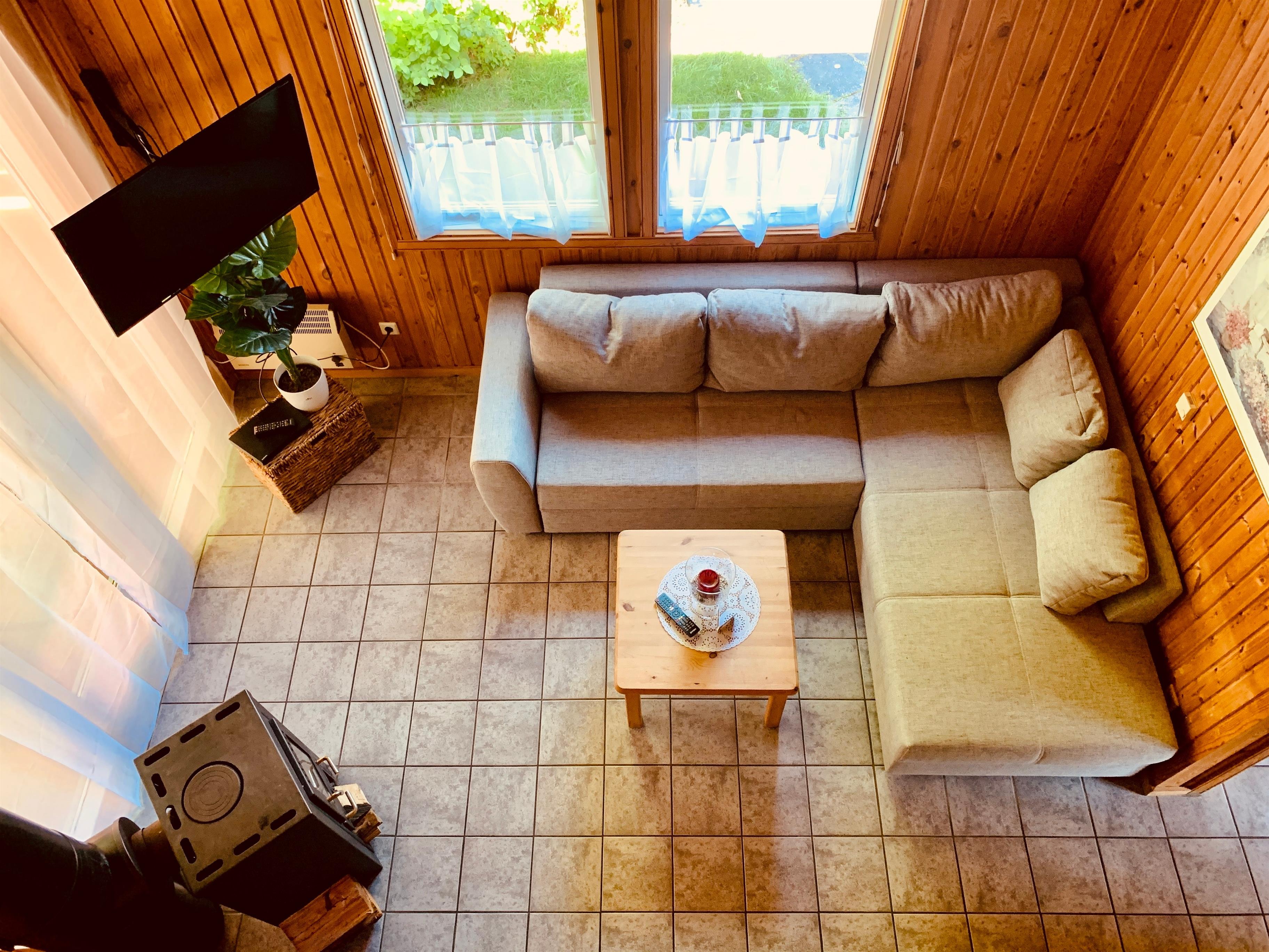 Der lichtdurchflutete Wohnraum lädt mit einer bequemen Sitzlandschaft, einem Essplatz für 5 Personen, großem Smart-TV und dem Kaminofen zu entspannten Stunden ein – perfekt nach einem erlebnisreichen Tag.