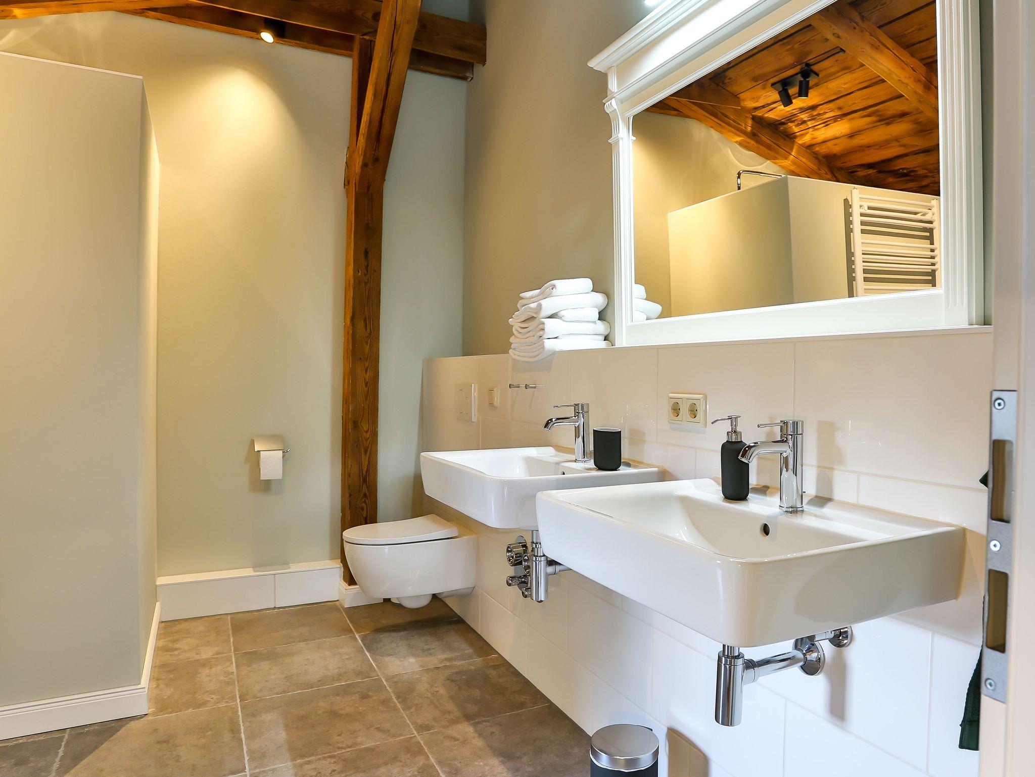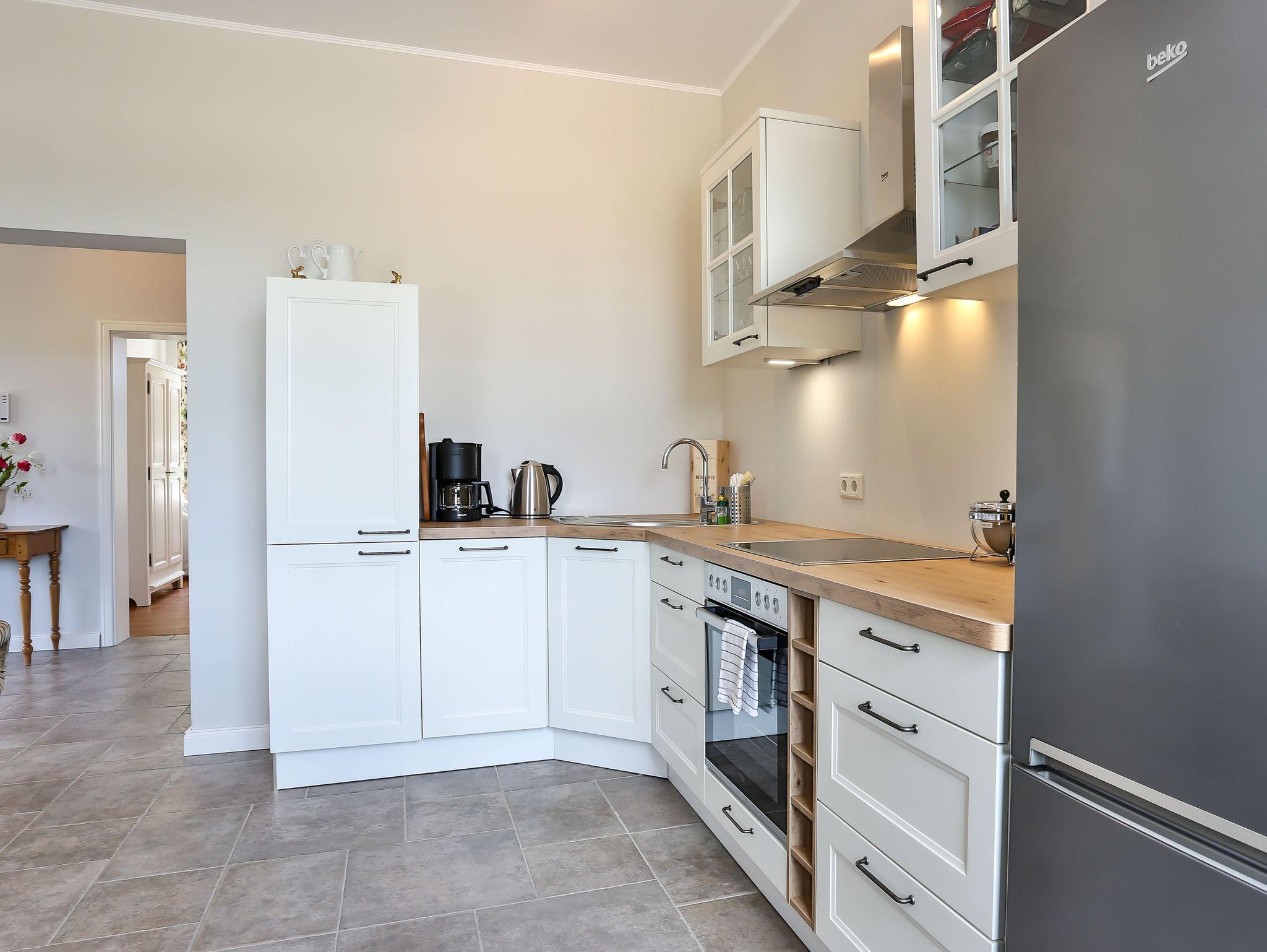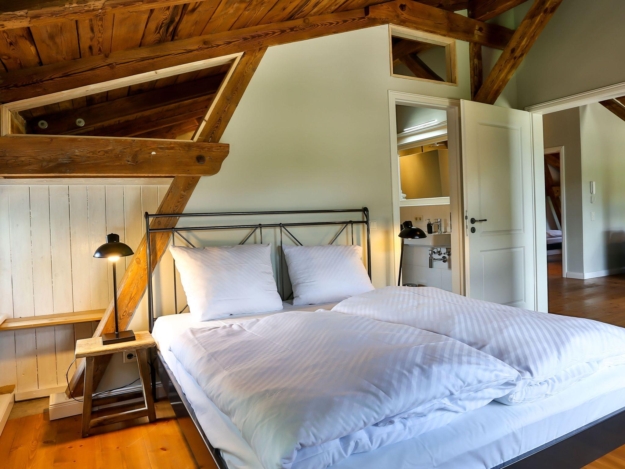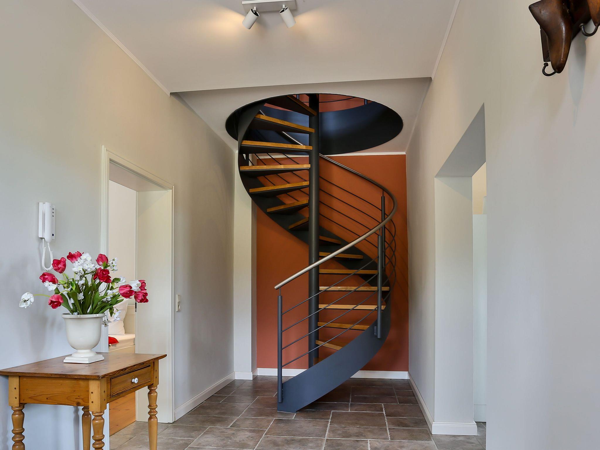 Die Ferienwohnung Fürstenberg hat eine Fläche von ca. 136 qm und erstreckt sich über zwei Etagen, verbunden durch eine coole Wendeltreppe. Die Räume sind sehr großzügig geschnitten. Im Erdgeschoß Küche, ein Schlafzimmer mit Doppelbett, Dusche/WC und eine schöne große Terrasse. Im Obergeschoß befindet sich ein großes Wohnzimmer mit Kamin und Balkon, ein Schlafzimmer mit Doppelbett und angegliedertem großzügigem Badezimmer mit Dusche/WC und einem weiteren Schlafraum als Einzelzimmer mit einem Bett 90/200. Belegung mit maximal 5 Personen, eine Aufbettung mit Zustellbett ist möglich.