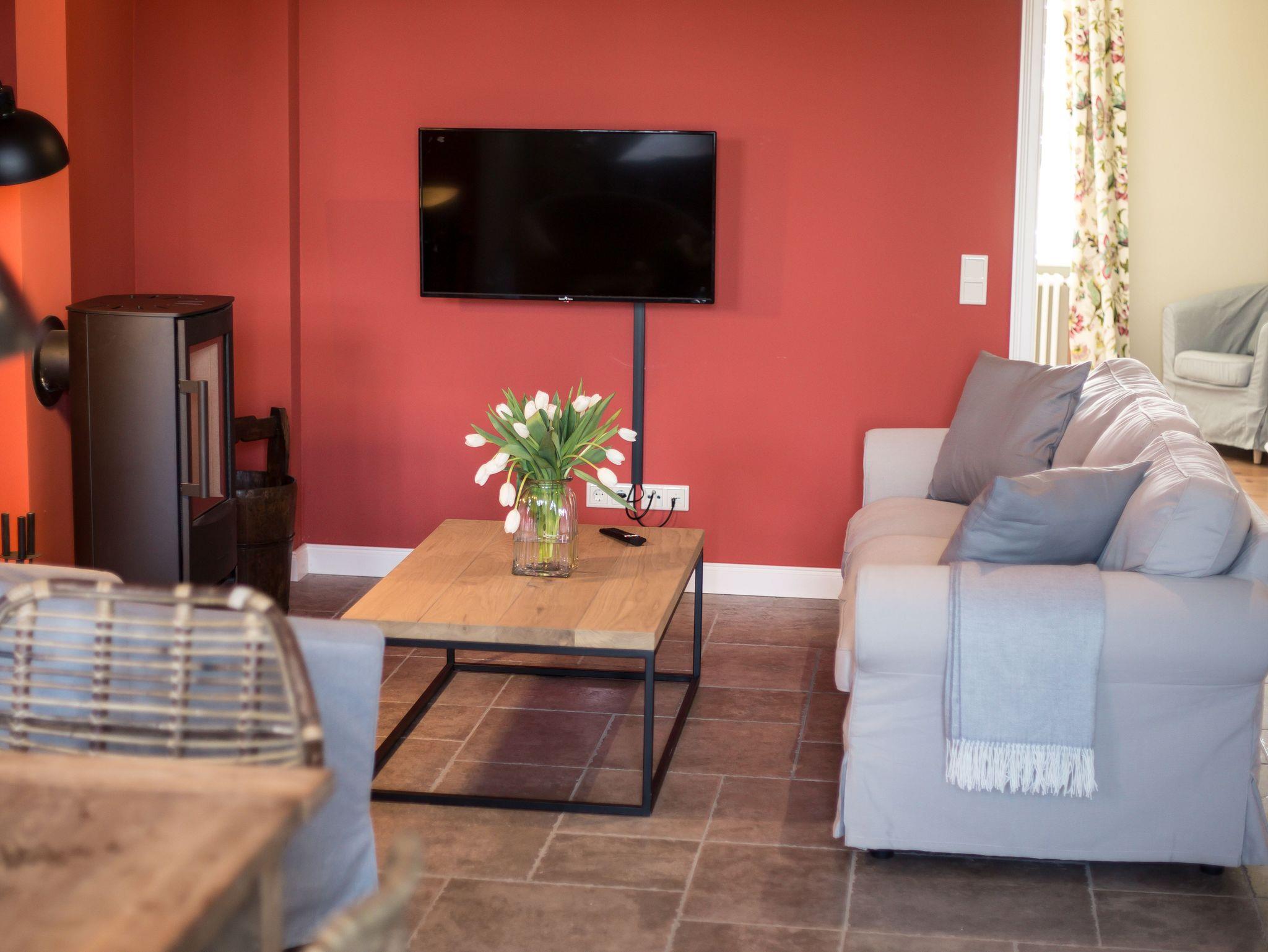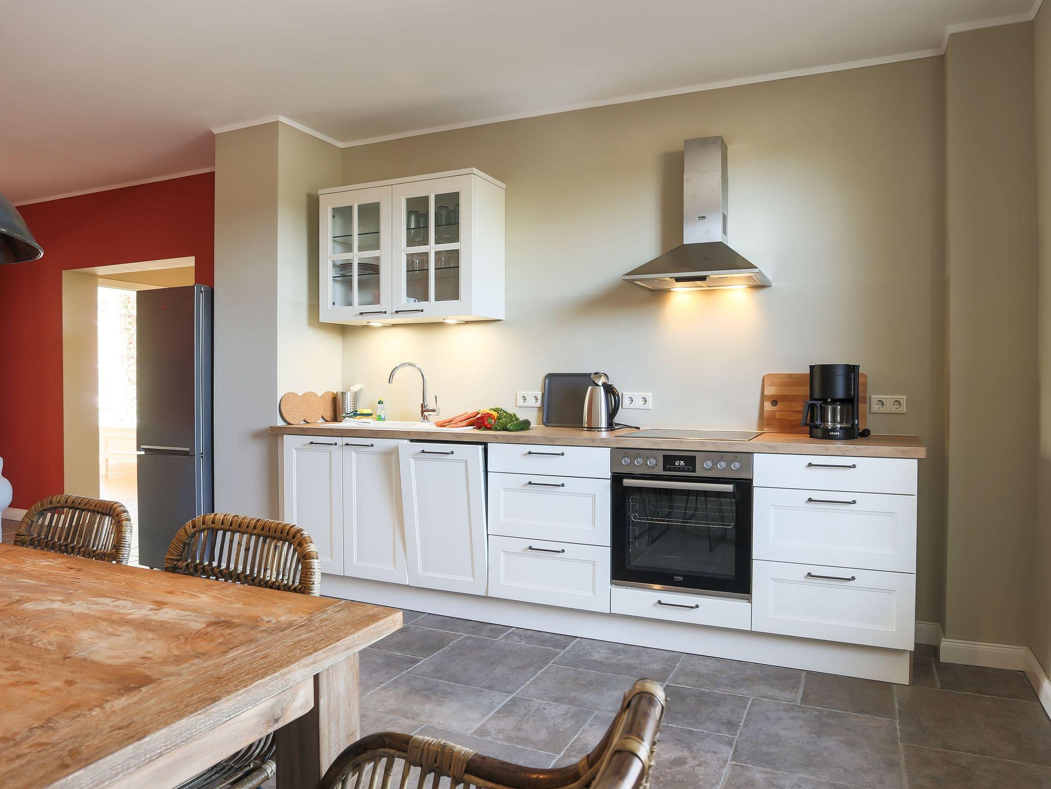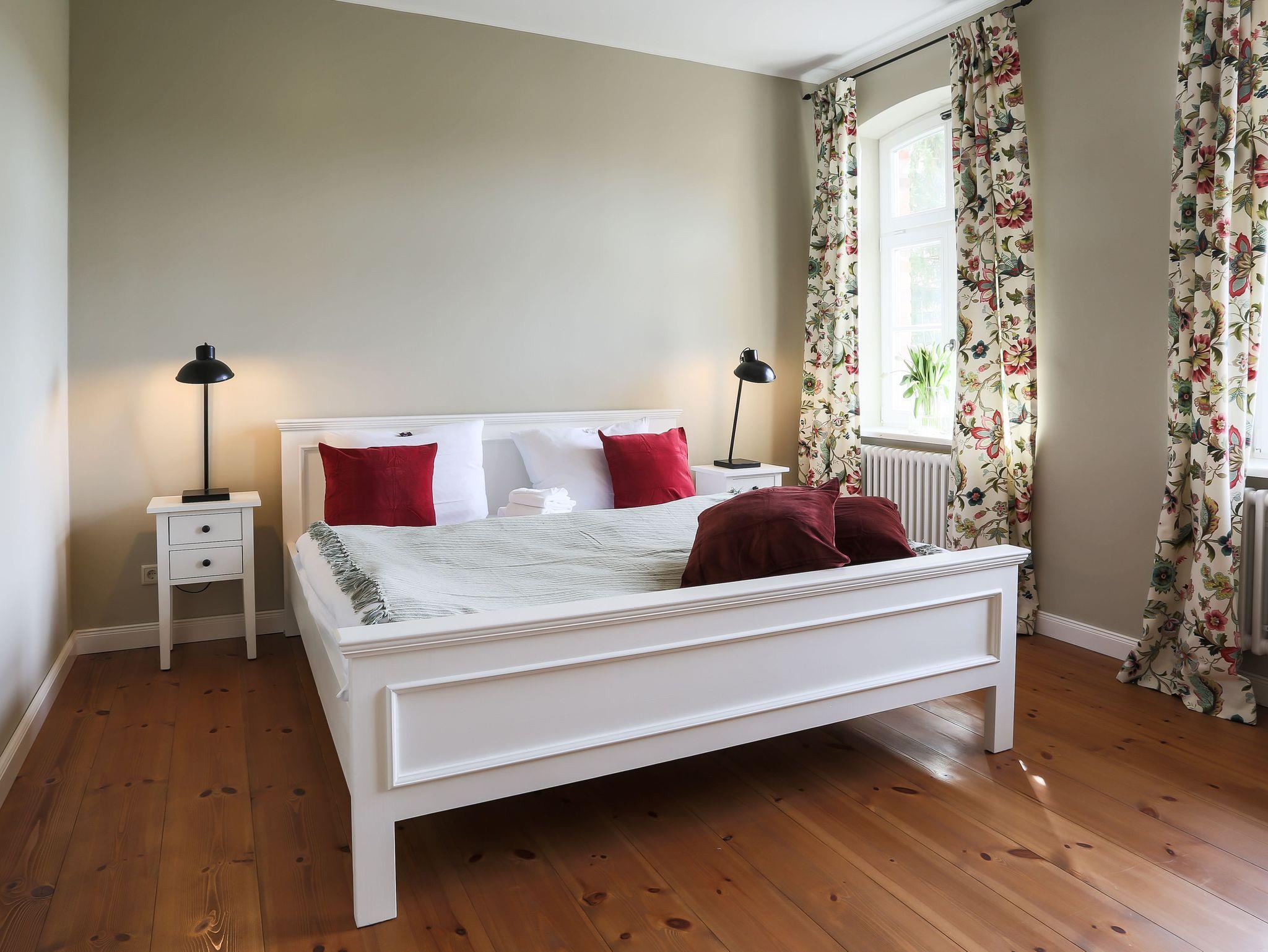 Von der Terrasse geht es gleich in die Küche. Links der große Esstisch. Rechts die komplette, moderne Küchenzeile. Angegliedert der Wohnbereich mit Sofa, Sesseln, Flachbildschirm und Kamin. Dahinter ein großes Schlafzimmer mit Doppelbett und Fenstern zum Park. Das zweite Schlafzimmer geht vom kleinen Flur ab. Es ist so groß wie das Erste, hat aber zwei Einzelbetten. Ebenfalls vom Flur geht es in das geräumige Bad mit großer Erlebnisdusche und Doppelwaschbecken. Farblich harmonisch setzt die rote Wand im Wohnbereich besondere Akzente. Selbstverständlich steht auch hier kostenloses WLAN sowie kostenfreie Parkplätze zur Verfügung. Eine Aufbettung mit Zustellbett ist möglich.