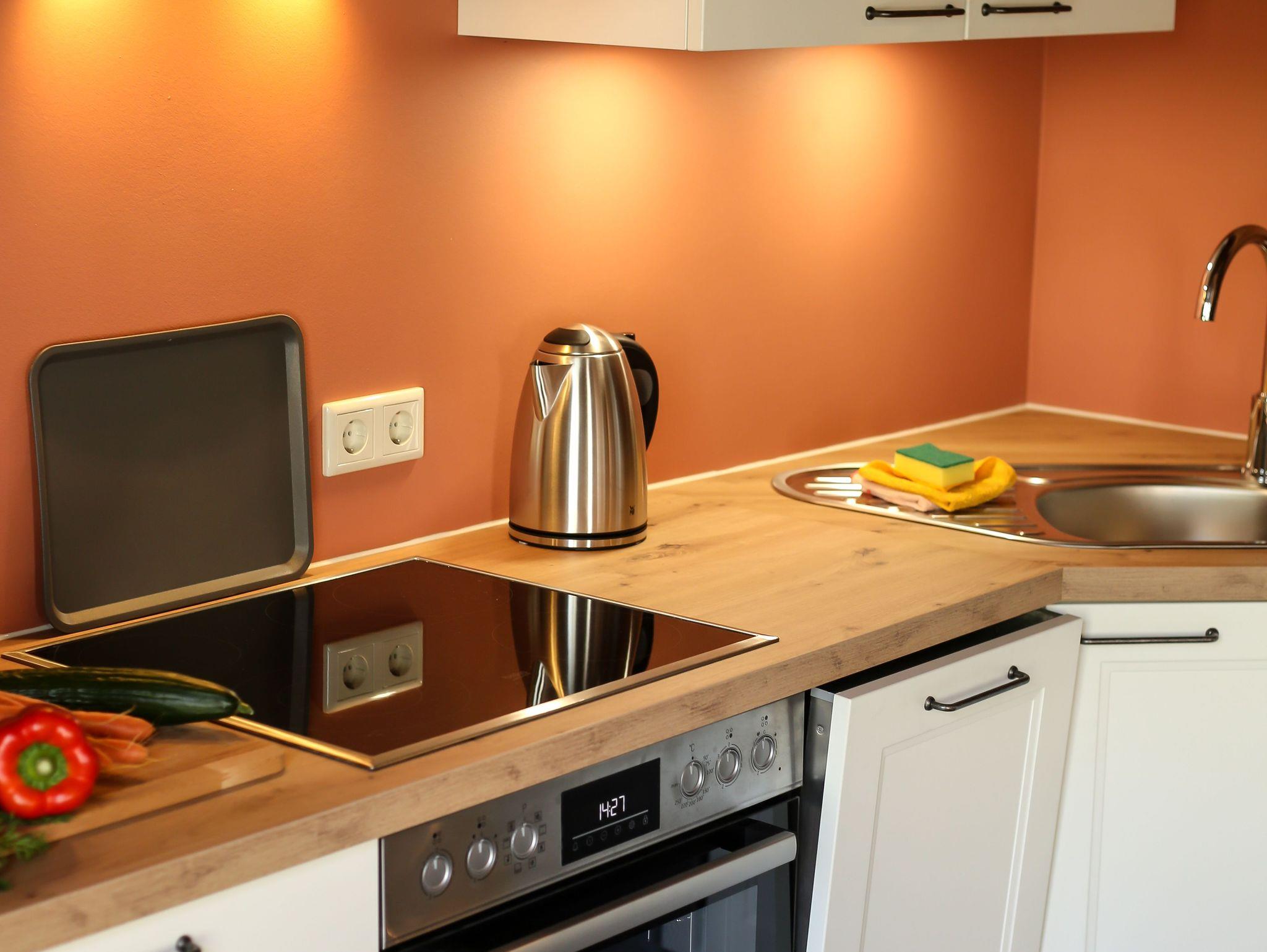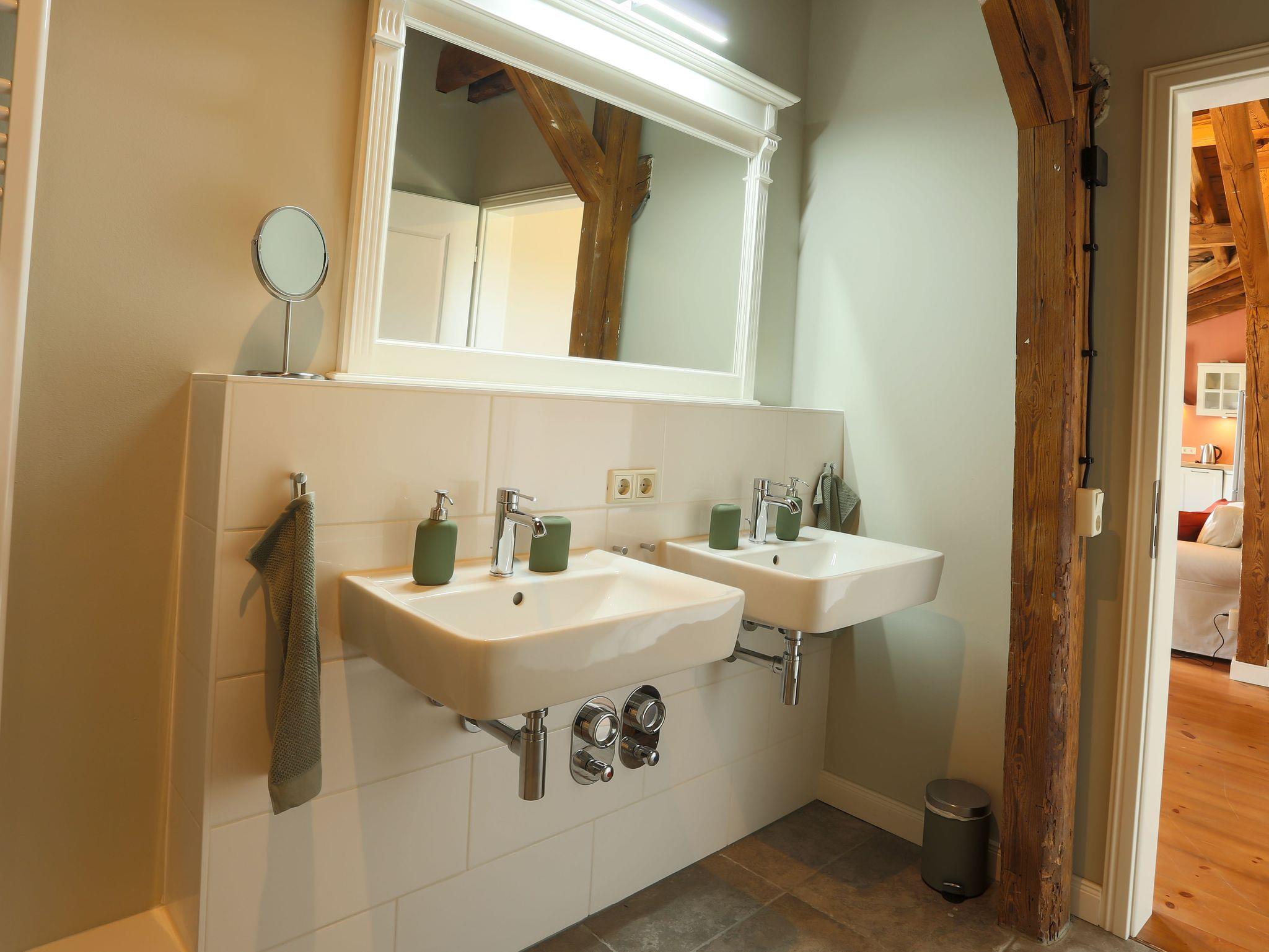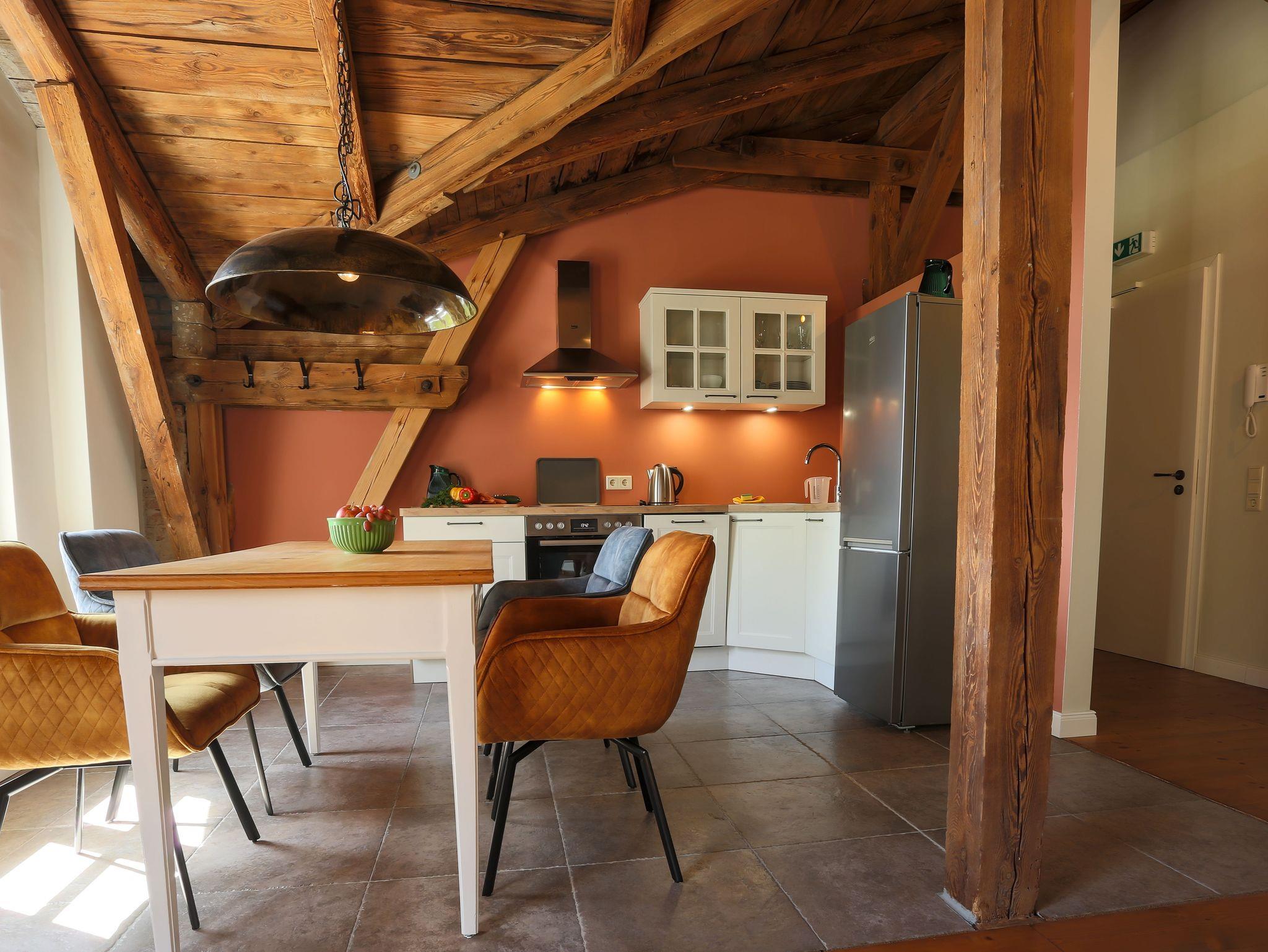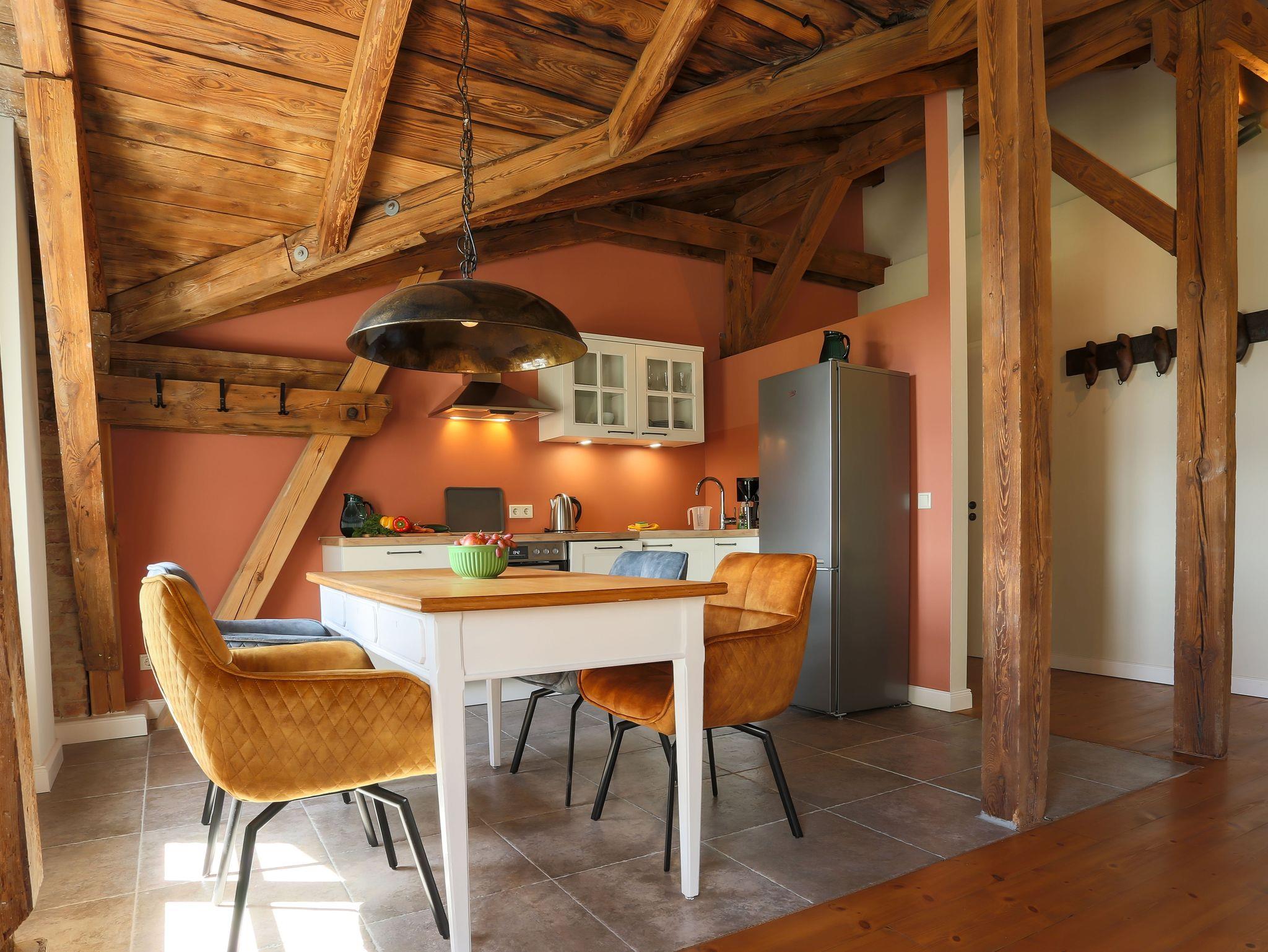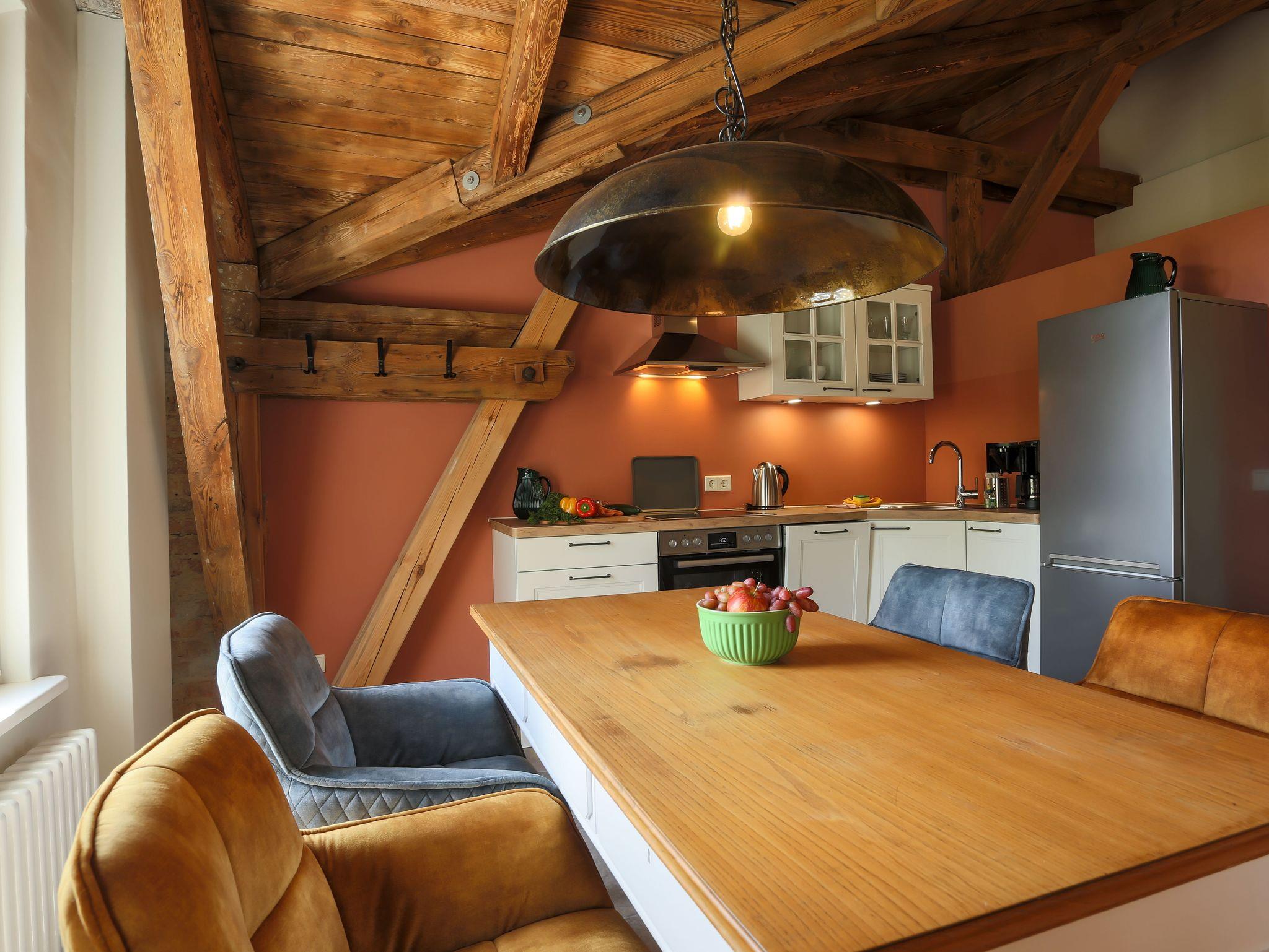 Die Ferienwohnung Sonnenberg befindet sich im Obergeschoss und ist über eine Treppe erreichbar. Die offene Decke und die erhaltenen Holzbalken vermitteln eine besondere Wohlfühlatmosphäre. Viel Holz, aber auch viel Licht durch die vielen Fenster und der großen Balkontür. Die gesetzten Farben und die schönen Holzdielen ergänzen den Landhausstil der Einrichtung. Eine offene Küche, in der es sich gut für vier Kochen lässt. Eine Kühl-/Gefrierkombi für längere Aufenthalte, Spülmaschine und Ceranfeld sind nur einige Pluspunkte. Zwei voneinander getrennte Schlafräume mit Doppelbetten und ein geräumiges Bad mit großer Dusche ergänzen den offenen Wohnbereich mit Küche. Und vom Balkon gibt es einen schönen Blick ins Grüne. Selbstverständlich steht auch hier kostenloses WLAN sowie kostenfreie Parkplätze zur Verfügung. Eine Aufbettung mit Zustellbett ist möglich.
