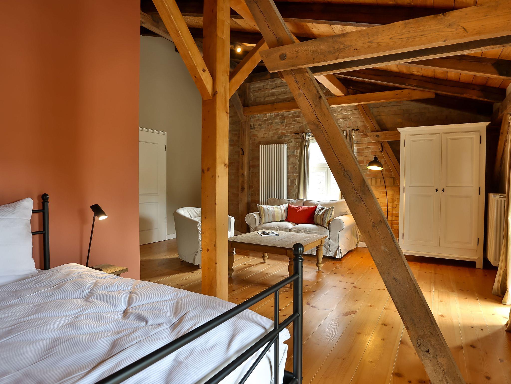 Ein wunderbares Zusammenspiel von Licht, Holz und Farbe. Im ca. 25 qm großem Doppelzimmer Rheinsberg ist Wohlfühlen angesagt. Die Holzbalken und Holzdielen geben dem Raum eine besondere Atmosphäre. Auf dem Sofa lässt es sich perfekt entspannen. Und bei Bedarf Fernsehen. Oder einfach die Ruhe genießen. Das Bad wartet mit einer sehr großen Dusche auf. Fön und Kosmetikspiegel sind ebenfalls vorhanden. Eine Aufbettung mit Zustellbett ist möglich. Im ganzen Areal empfangen Sie kostenloses WLAN. Unser Parkplatz ist ohne Gebühren nutzbar.