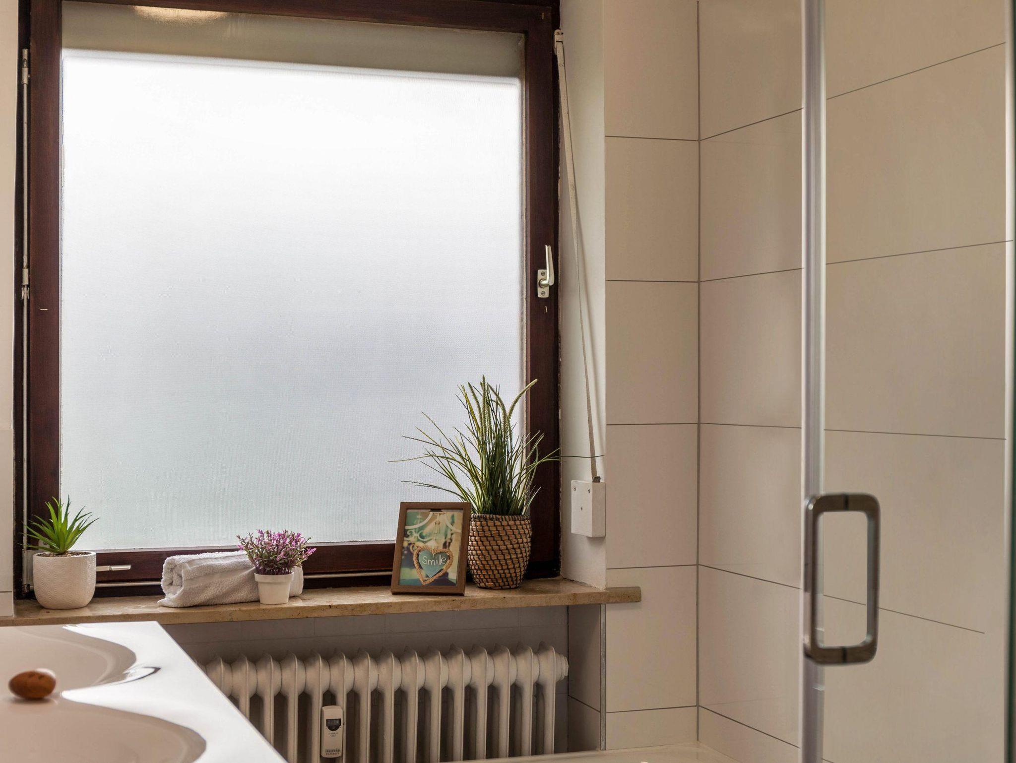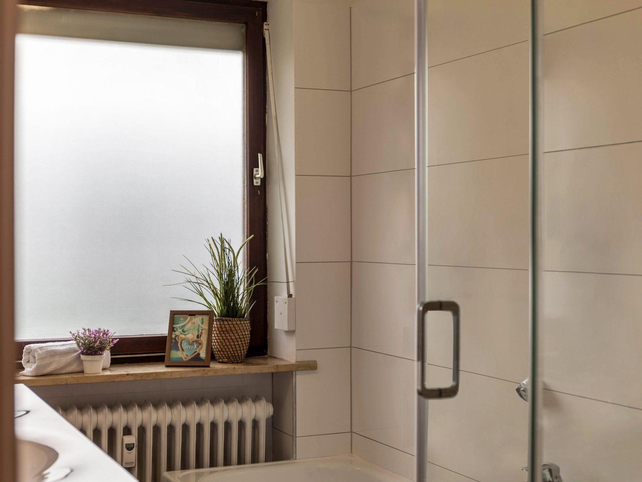 Das Bad verfügt über eine Dusche und und eine Badewanne mit Fußbodenheizung