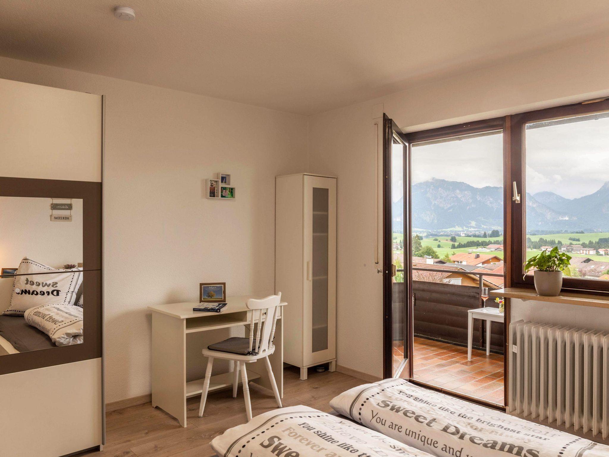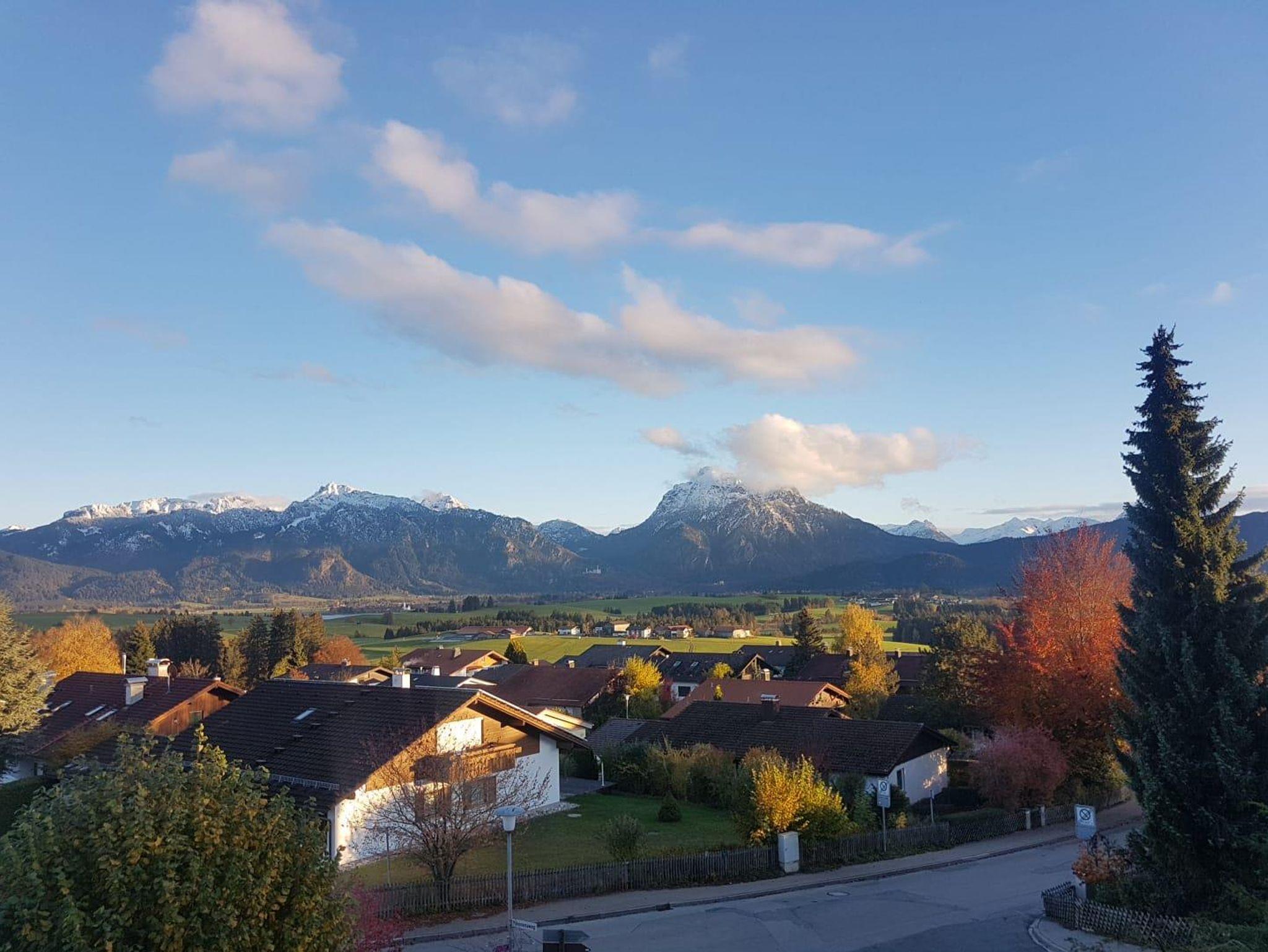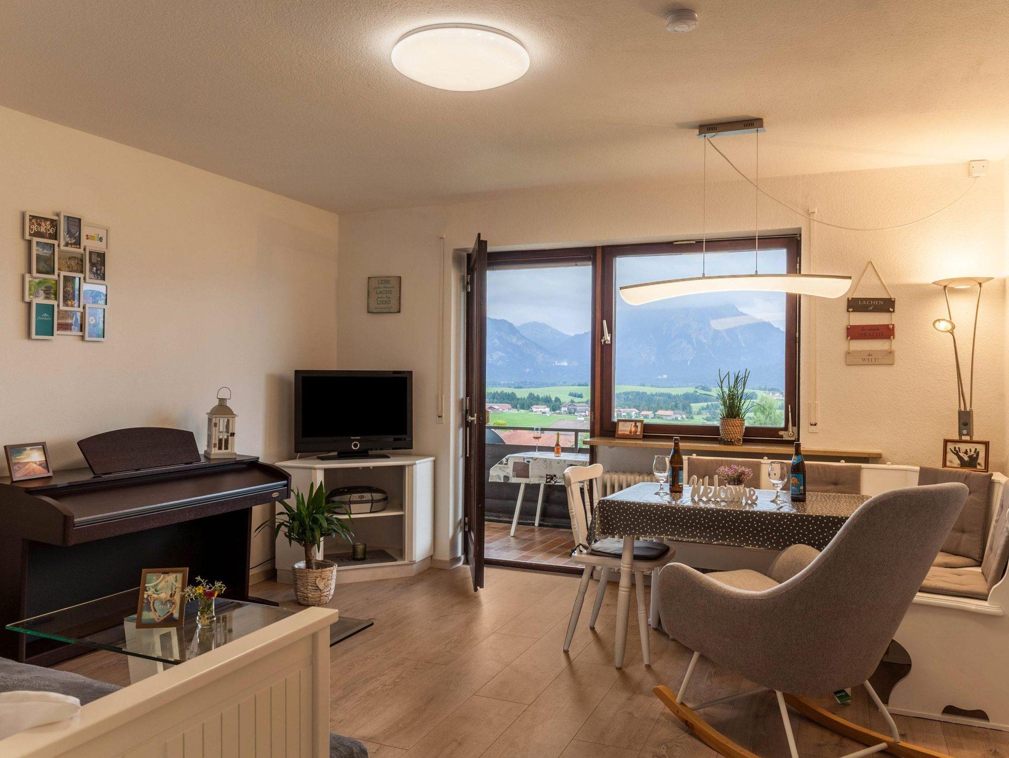 In der Wohnung werden die Gäste in einer angenehmen Atmosphäre empfangen. Es bietet komfortable Zimmer mit gigantischen Ausblick auf die Königsschlösser, Hopfen und den Forggensee sowie die Bergkette von Deutschland und Österreich