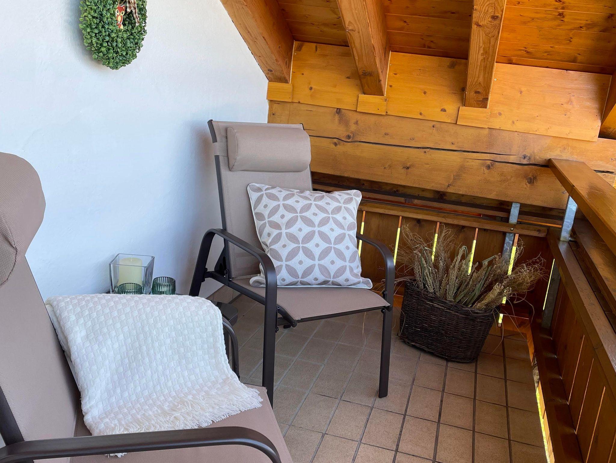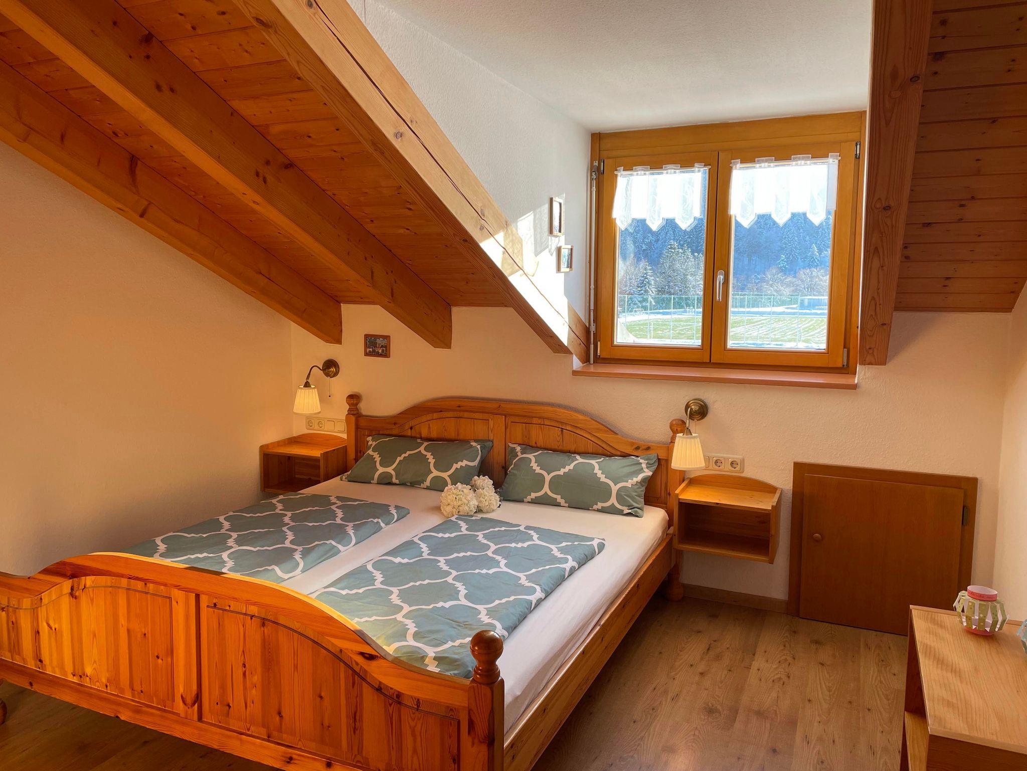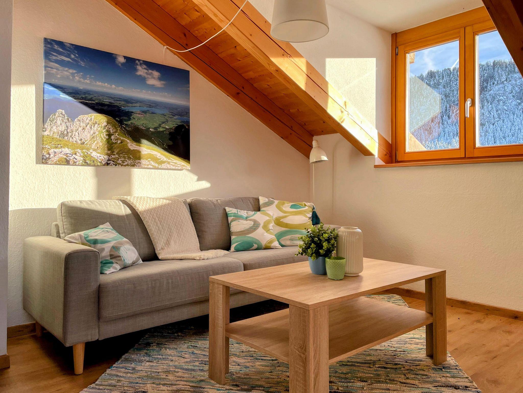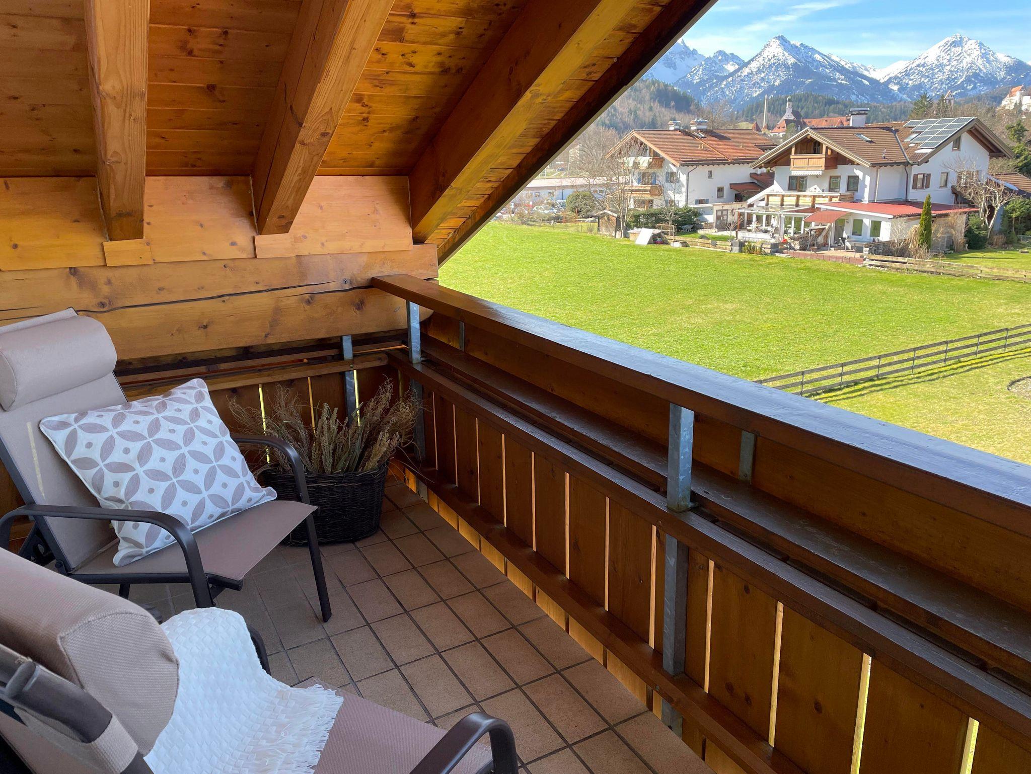 Unsere Ferienwohnung 2 befindet sich im 2. Stock und bietet auf 50 m² Platz für bis zu 3 Personen. Sie verfügt über 1 Schlafzimmer mit Doppelbett, sowie ein 2. Schlafzimmer mit Einzelbett, 1 Wohnzimmer, 1 offene Essecke mit Eckbank und Kochnische sowie ein Badezimmer mit Dusche. Auf dem Westbalkon mit Blick in die Allgäuer Berge und die Füssener Altstadt (Hohes Schloss) kann man geschützt die Aussicht genießen. Die Kochnische verfügt über einen Kühlschrank mit Gefrierfach, eine Mikrowelle, einen Toaster, eine Kaffeepadmaschine sowie einen 2-Platten Induktionsherd.