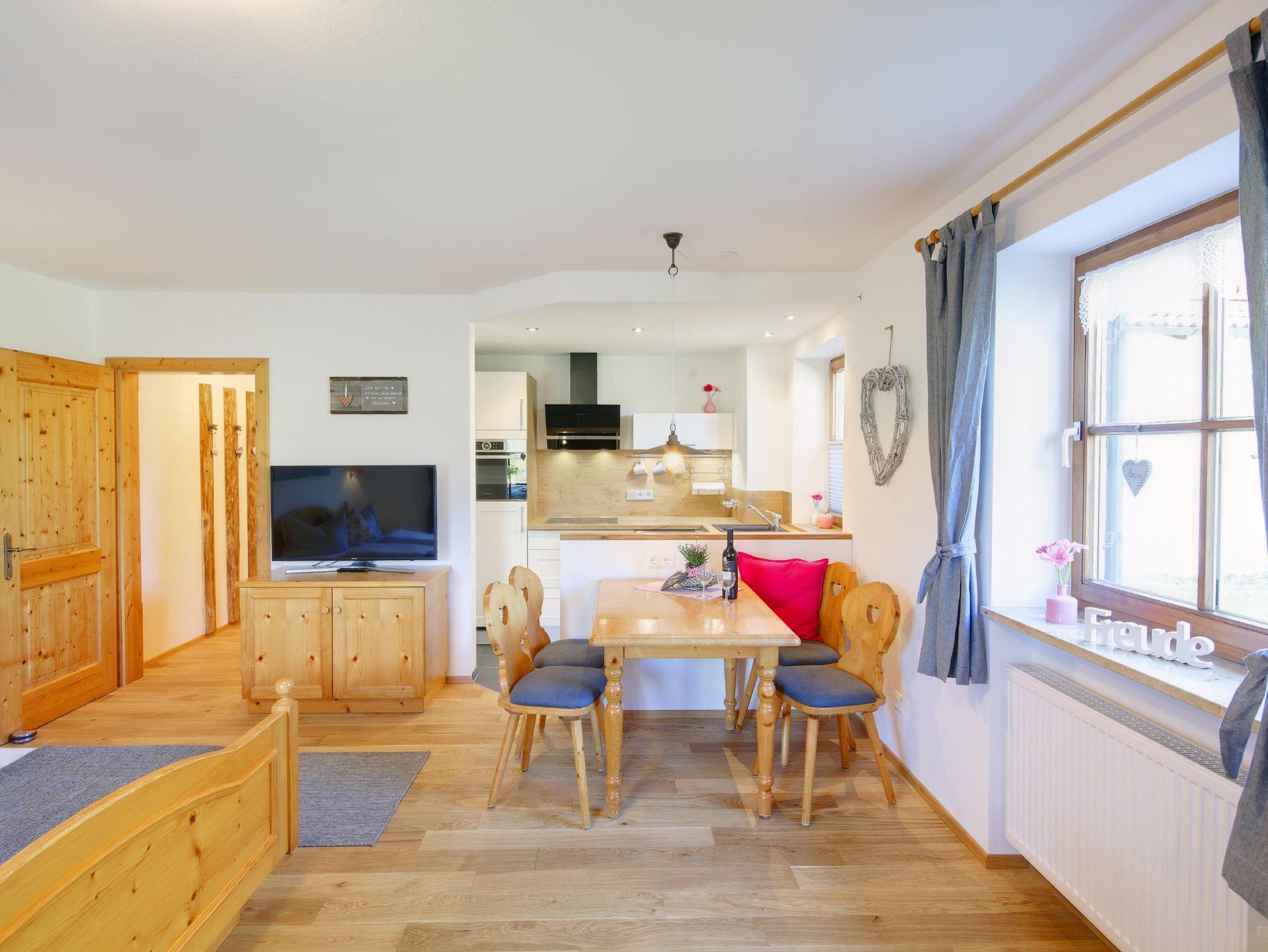 Nach der Übernahme des Popplerhofs im Jahre 2017 wurden alle 8 Ferienwohnungen im alpenländischen Stil mit moderner Einrichtung und Massiv-Holz-Böden renoviert. Hier finden Sie Behaglichkeit mit gut ausgestatteten Küchen, gemütlichen Essplätzen, bequemen Betten und eindrucksvollen Schwarz-Weiß-Bildern, die die Allgäuer Kulturlandschaft zeigen. 43 Zoll Flachbildschirme mit SAT-TV und kostenloses WLAN sind inklusive. Alle Wohnungen sind mit einem Balkon oder einer Terrasse ausgestattet und bieten einen Blick auf die umliegenden Allgäuer Berge und das Ammergebirge, nach denen die jeweiligen Wohnungen benannt sind. Werfen Sie einen Blick aus dem Fenster, dann finden Sie auch Ihren Berg.