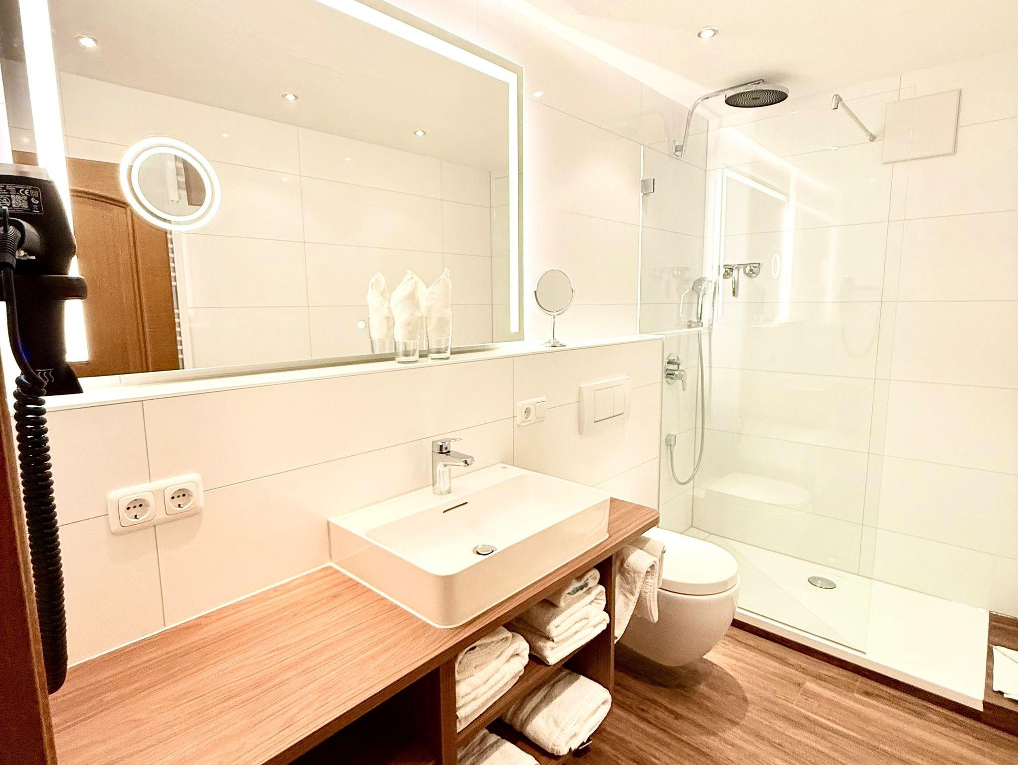 Wohnzimmer mit großer Couchgarnitur und TV, hochwertige Einbauküche mit Esstisch, großes Schlafzimmer mit bequemen Doppelbett, Bad mit großer Dusche mit Rainshower, Waschbecken, WC und Fön.