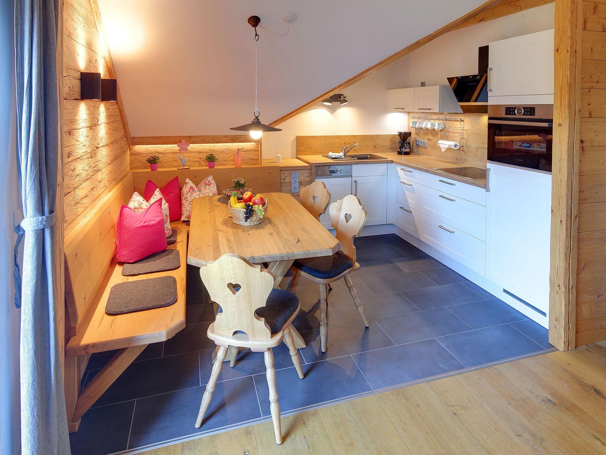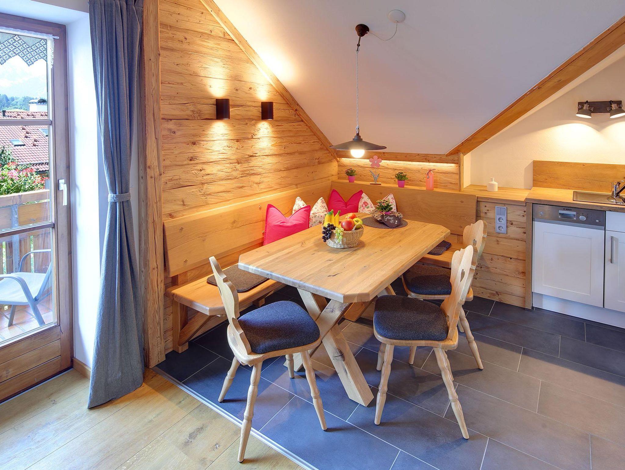 Unsere große 3-Raum-Ferienwohnung Säuling ist mit einer Größe von 73 m² ist mit seinen zwei separaten Schlafimmern für 2-5 Personen geeignet. Die Wohnung liegt im 2. Stock und ist mit einer großen Wohnküche mit Sofaecke, Küche, Essplatz mit 5 Sitzplätzen, 2 separaten Schlafzimmern und einem neuen modernen Bad ausgestattet. Die Wohnung ist nach Südosten ausgerichtet und besitzt zwei großen Süd-Ost-Balkone mit einem herrlichen Blick auf das Schloss Neuschwanstein und die Allgäuer- und Tannheimer Berge. Herrlich gemütlich wirken die hohen Dachschrägen aus Holz in der großen Wohnküche. Hier finden Sie eine moderne Küche, eine rustikale Essecke mit Bank und eine moderne Couch. Von hier betreten Sie Ihren 10 m² großen Südbalkon mit Mobiliar und traumhaften Blick auf die Füssener Bergwelt und die umliegenden Häuser. Die Küche ist mit Spülmaschine, Kühlschrank mit Gefrierfach, 4 Platten-Cerankochfeld mit Backofen, Kaffeemaschine, Wasserkocher und Toaster ausgestattet. In der Wohnküche befindet sich ein Flachbildschirm (43 Zoll) mit SAT/TV und kostenfreiem WLAN. Direkt von der Wohnküche spazieren Sie in ein Schlafzimmer mit Doppelbett und großem Schrank sowie einem zweiten Flachbildschirm. Auch von hier haben Sie Zugang zum großen Südbalkon. Das zweite Schlafzimmer mit Doppelbett und Einzelbett ist mit einem eigenen Ostbalkon mit 6 m² ausgestattet. Das moderne Bad in grauer Steinoptik besitzt eine Walk-In-Dusche, WC, Waschbecken und einen herrlich großen Spiegel. Das Highlight in dieser Wohnung: von beiden Balkon haben Sie einen herrlichen Blick auf das Schloss Neuschwanstein.