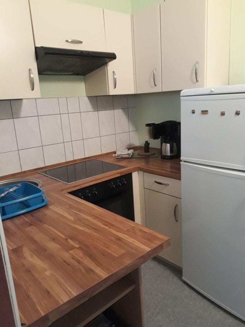 Die Küche verfügt über einen E-Herd mit Backofen, Kühlschrank mit Tiefkühlteil, Mikrowelle und ist komplett mit allem
