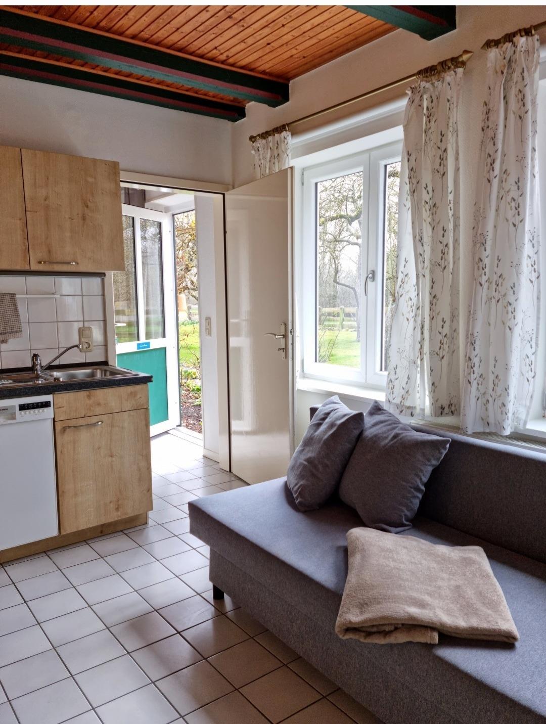 Im Wohn-Schlafbereich mit Küchenzeile ist eine Schlafcouch für 2 Personen