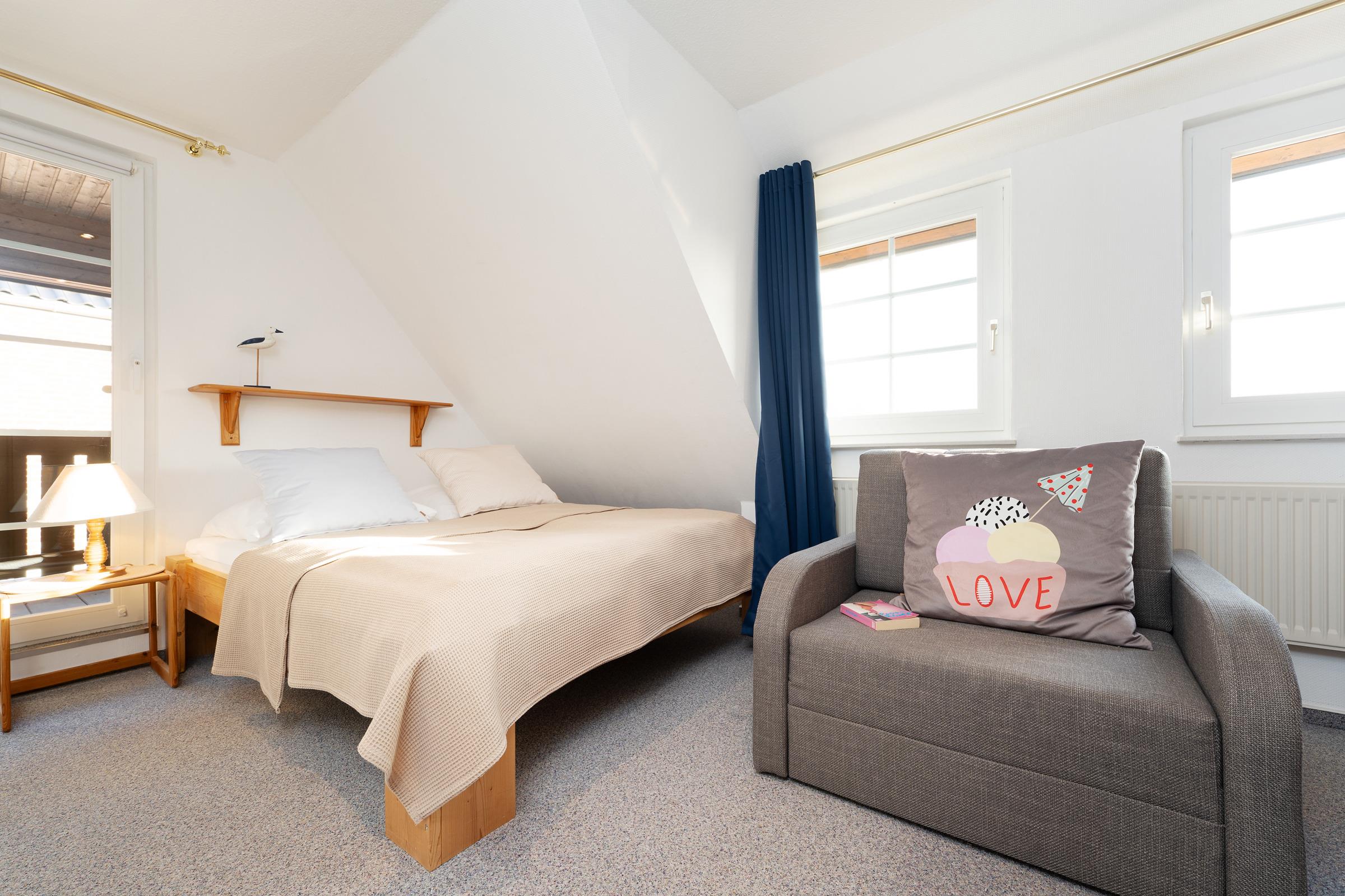 Schlafzimmer 3 (1.OG): 1 Doppelbett (2x 80x200 cm), Verdunkelung: Verdunkelungsvorhänge, kein Platz für ein Babybett vorhanden