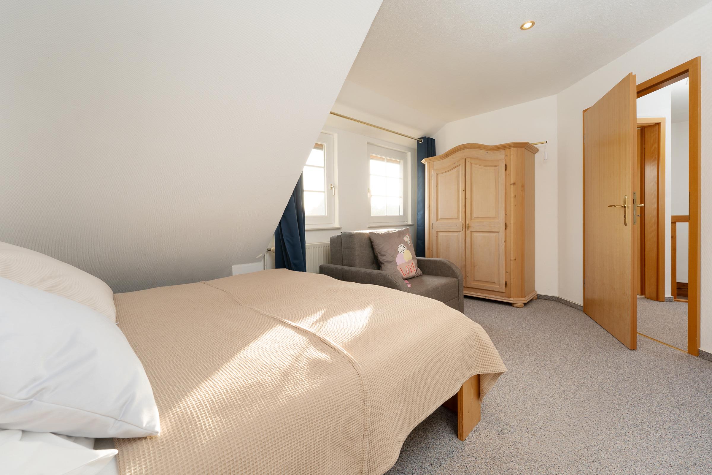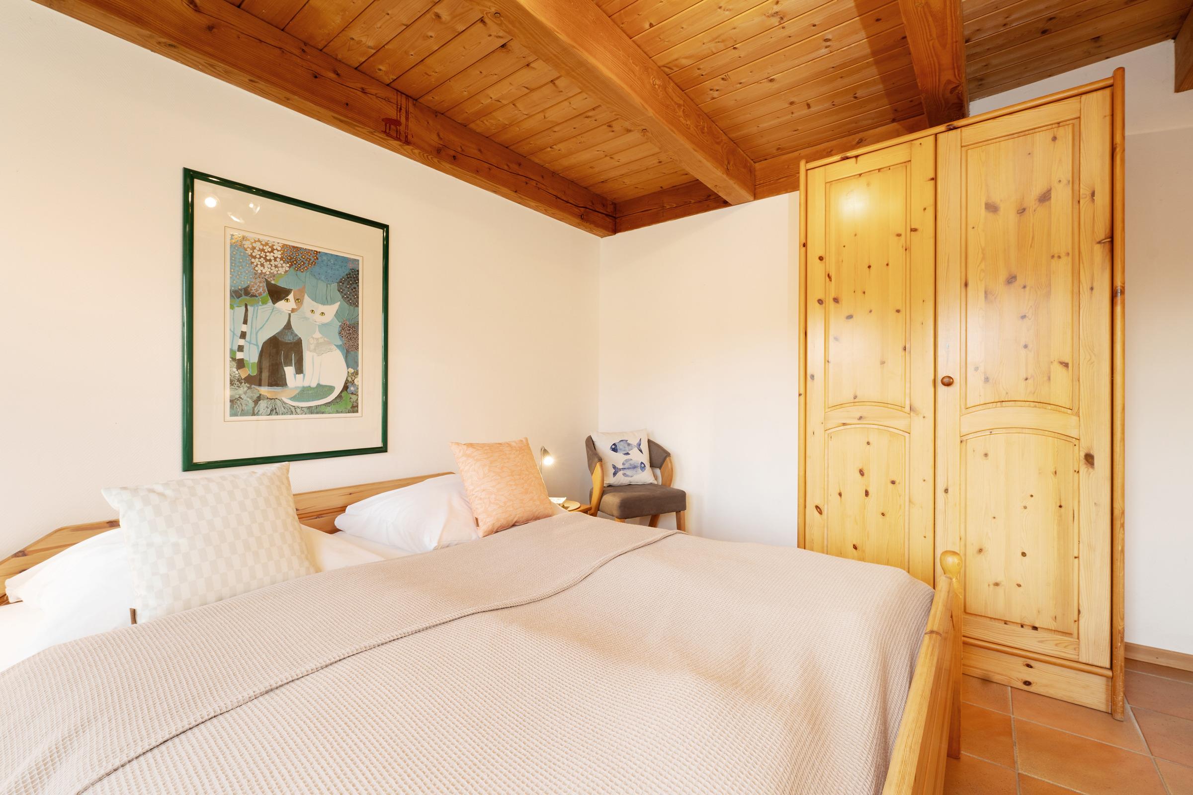 Schlafzimmer 2 (1.OG): 1 Doppelbett (2x 80x200 cm), Kleiderschrank, Verdunkelung: Verdunkelungsvorhänge, kein Platz für ein Babybett vorhanden