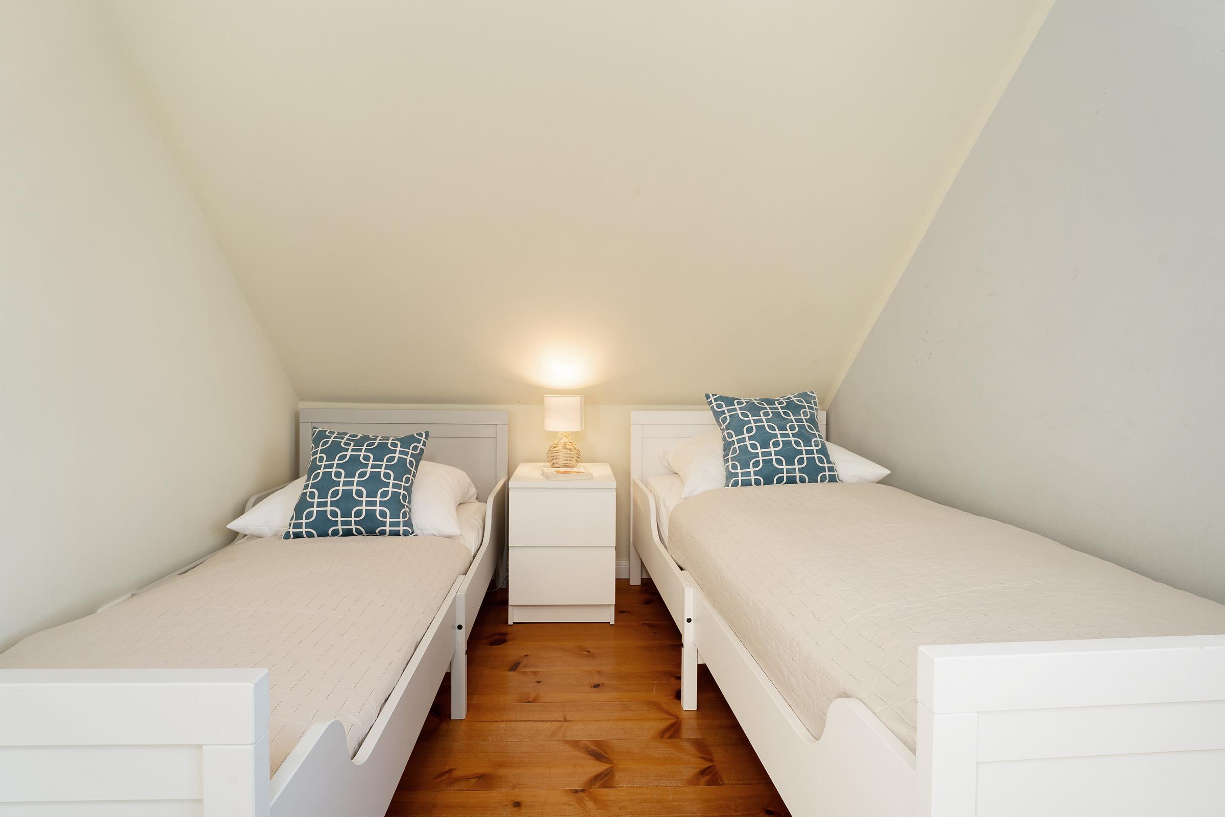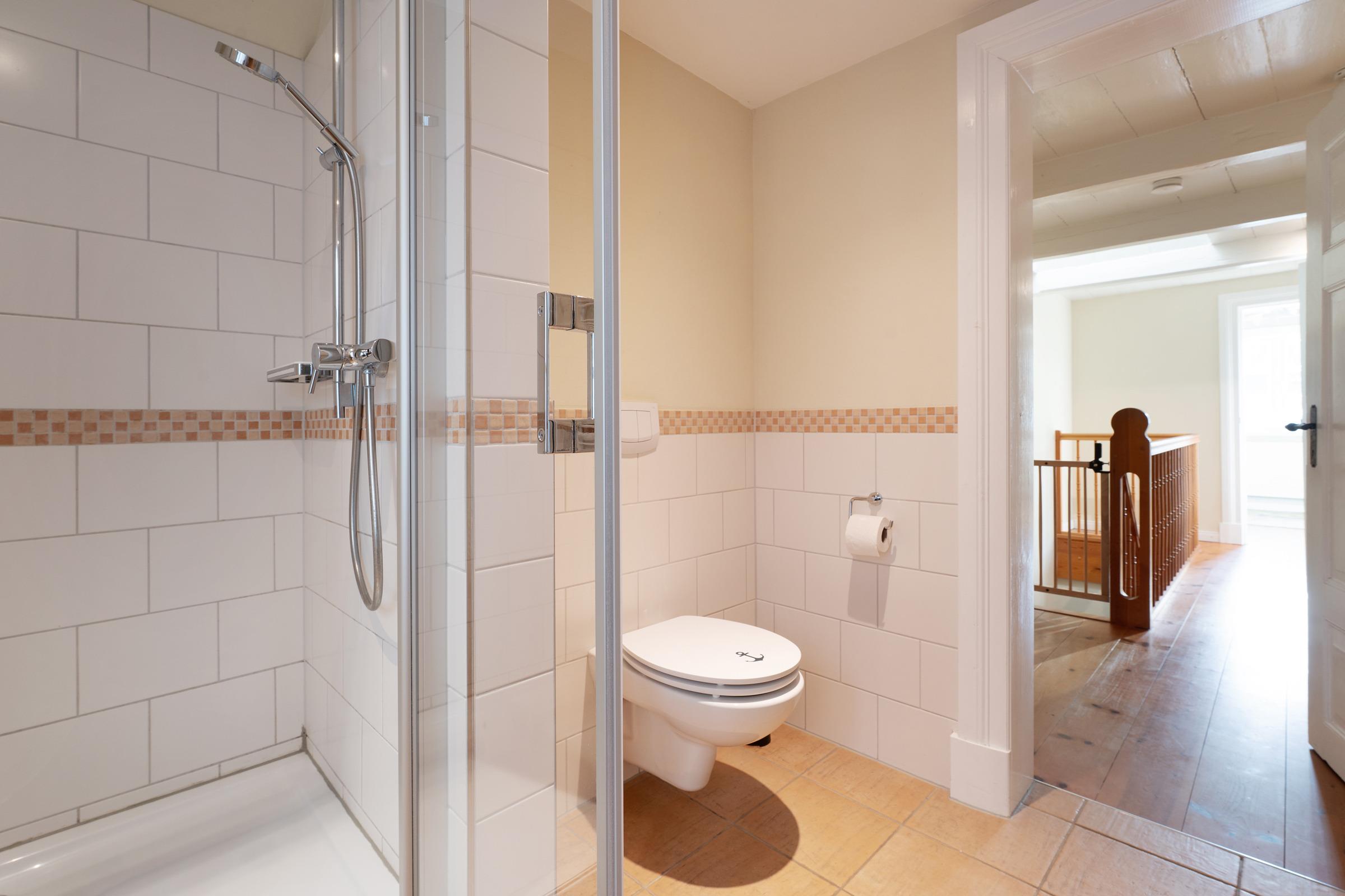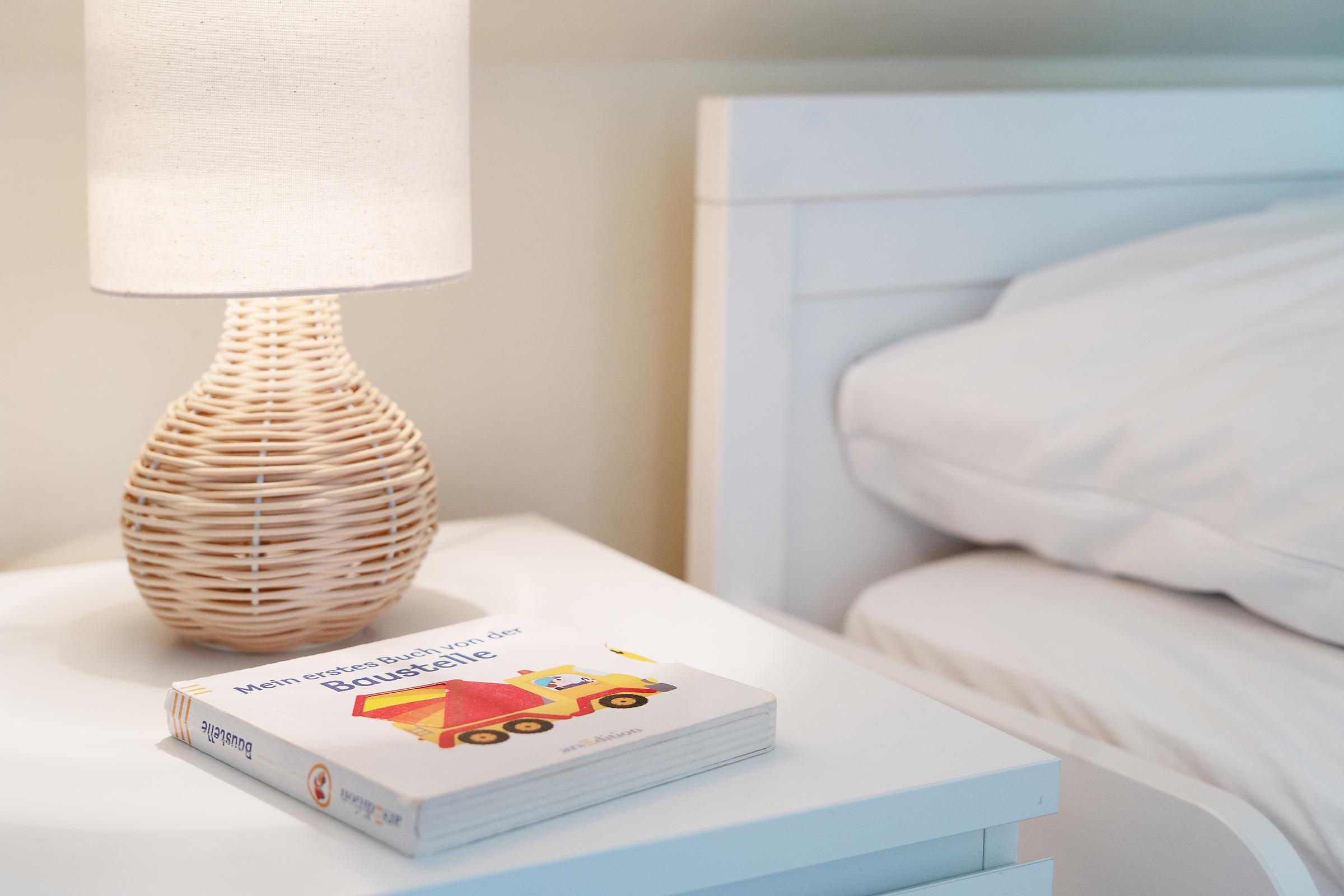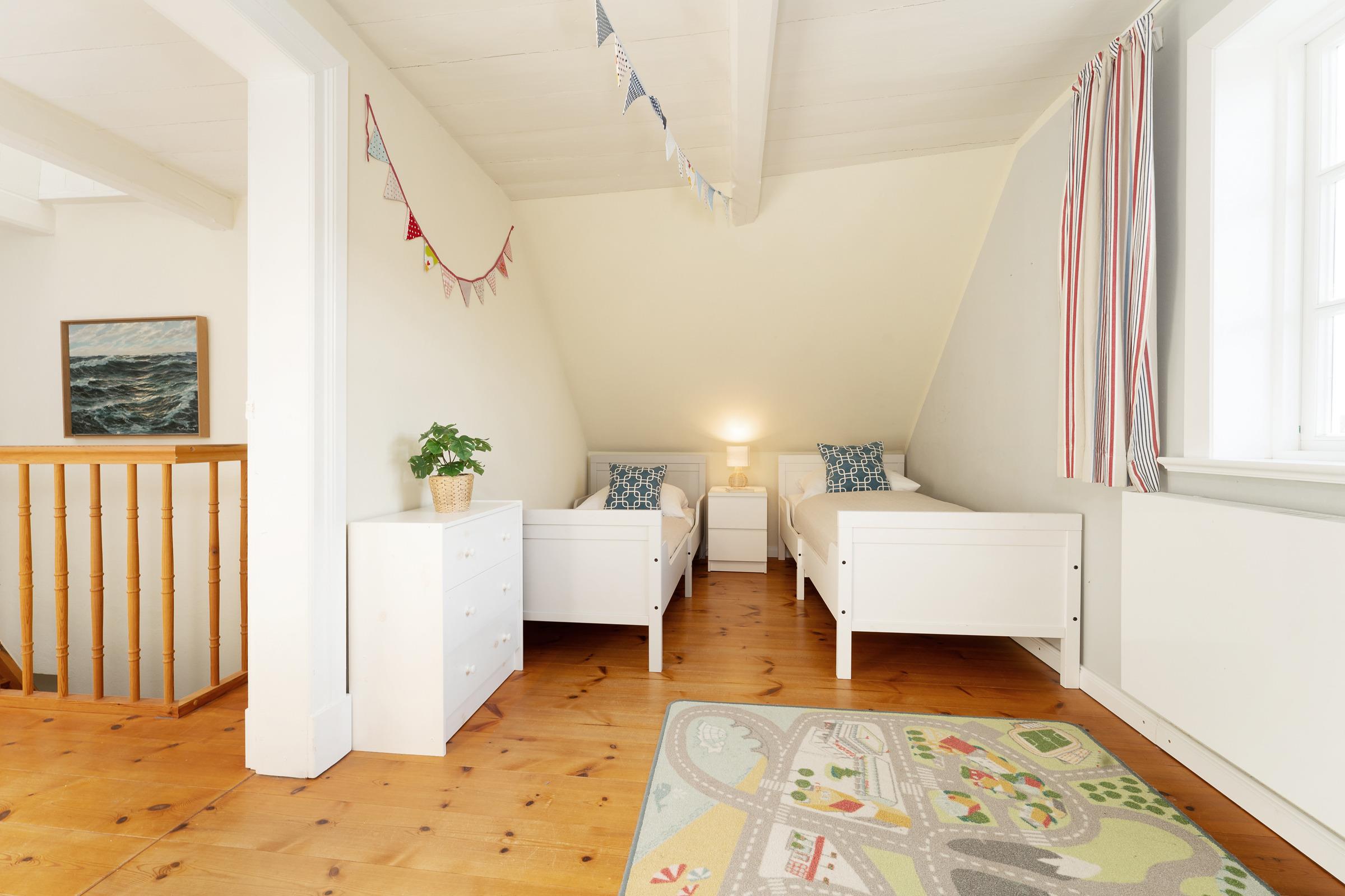 Die drei Schlafzimmer, alle im 1. OG, bieten flexible Schlafmöglichkeiten dank Einzelbetten, Doppelbett und Schlafsofas, alle mit Verdunklungsmöglichkeiten für erholsame Nächte. Zwei moderne Bäder stehen zur Verfügung – eines mit Badewanne und WC im 1. OG, das andere als Gäste-WC im EG – ergänzt durch Haartrockner und beheizbaren Handtuchhalter. Ein Kinderhochstuhl steht zur Verfügung, ein Kinderreisebett ebenfalls..