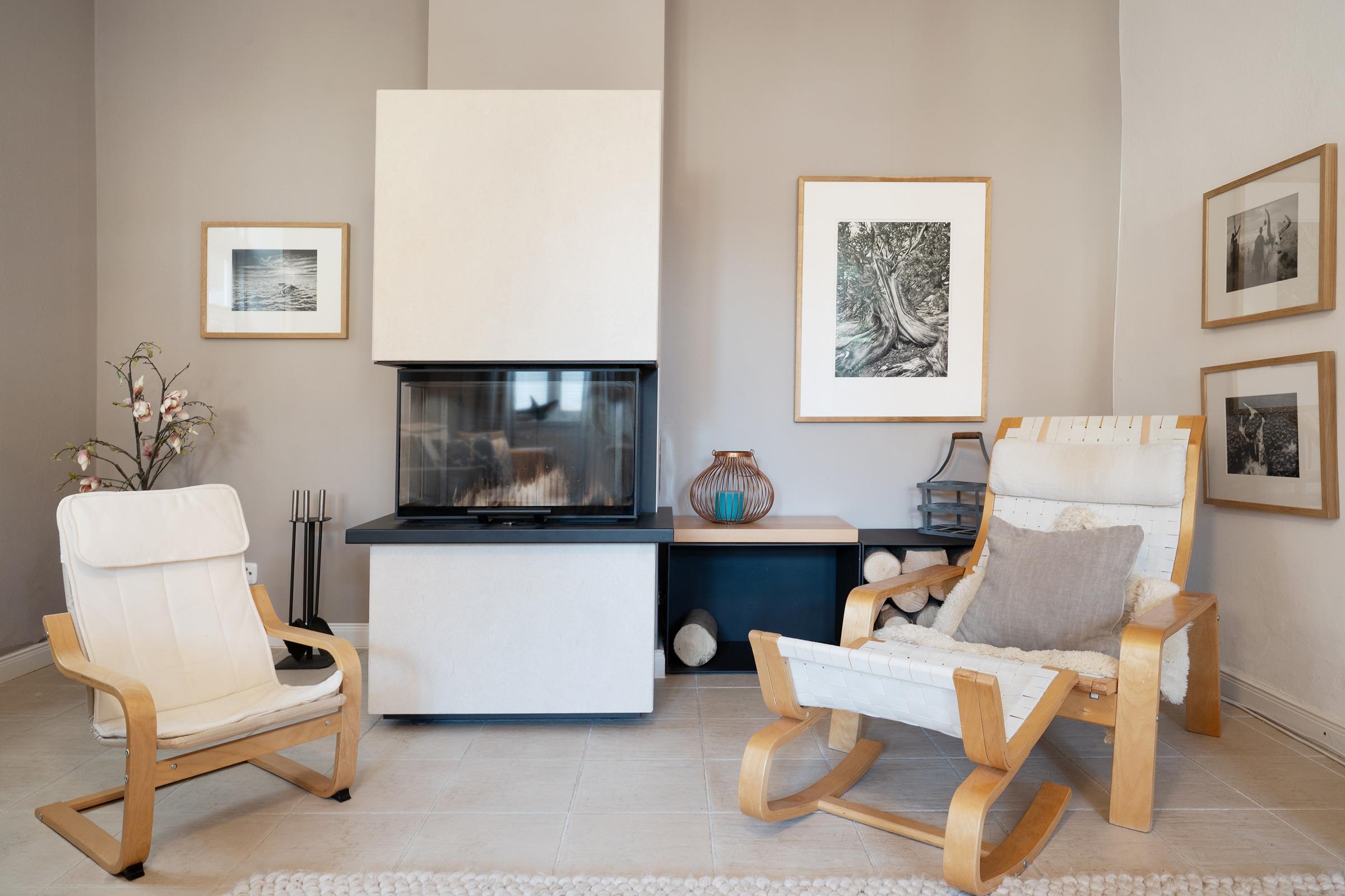 Der Rundgang beginnt im weitläufigen Wohnbereich, der mit einem Kaminofen und einem Fernseher für gemütliche Abende sorgt und viel Platz für geselliges Beisammensein bietet. Von hier aus treten Sie auf die großzügige Ost-Terrasse, die mit Gartenmöbeln und Sonnenliegen zum Entspannen einlädt, im Gemeinschaftsgarten warten zudem Schaukel und Sandkasten auf die kleinen Gäste. Die moderne Küche ist mit Backofen, Herd (4 Kochfelder), Geschirrspülmaschine, Kühlschrank, Toaster, Wasserkocher und Kaffeevollautomat bestens ausgestattet und wird durch einen gemütlichen Essbereich ergänzt.