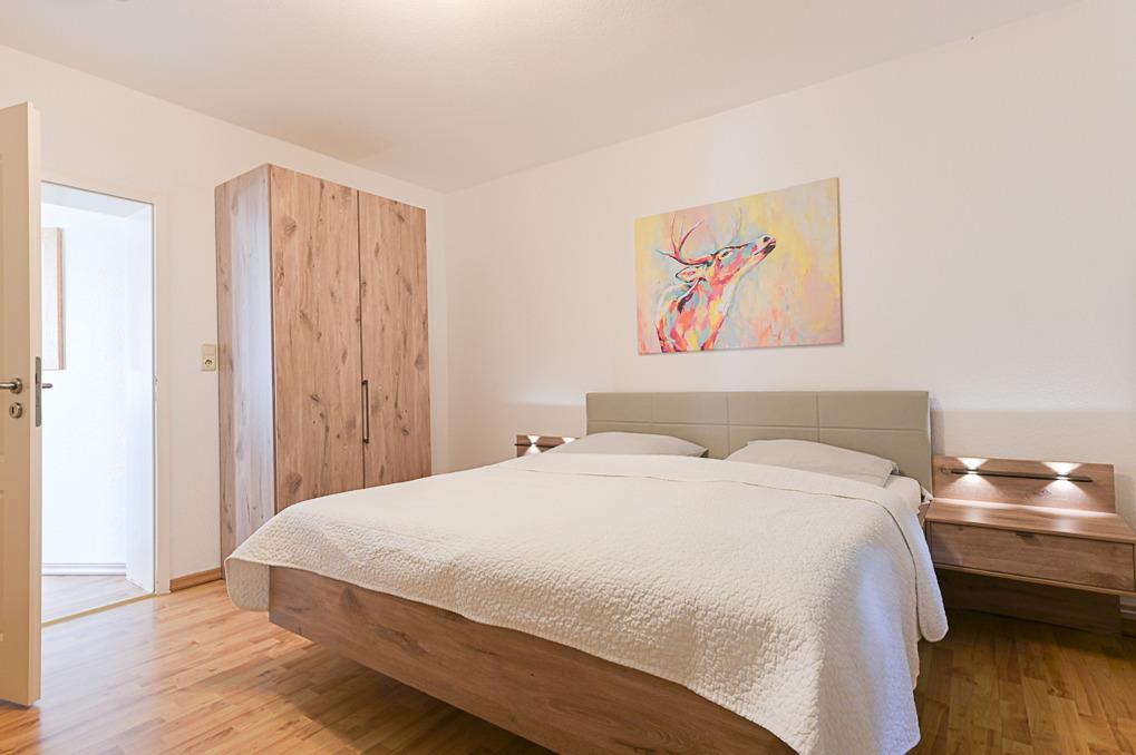 Im Erdgeschoß mit großer sonniger Südterrasse befindet sich diese Wohnung mit 3 Schlafräumen für 6 Personen. 2 x Ehebetten sowie im 3. Schlafraum 2 Einzelbetten bieten auch 4 Erwachsenen und 2 Kindern Platz.