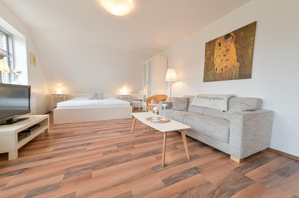 Das Appartement ist mit einer gemütlichen Sitzecke mit Sofa und Sessel, einem Doppelbett und einer komplett ausgestatteten Küchenzeile eingerichtet.