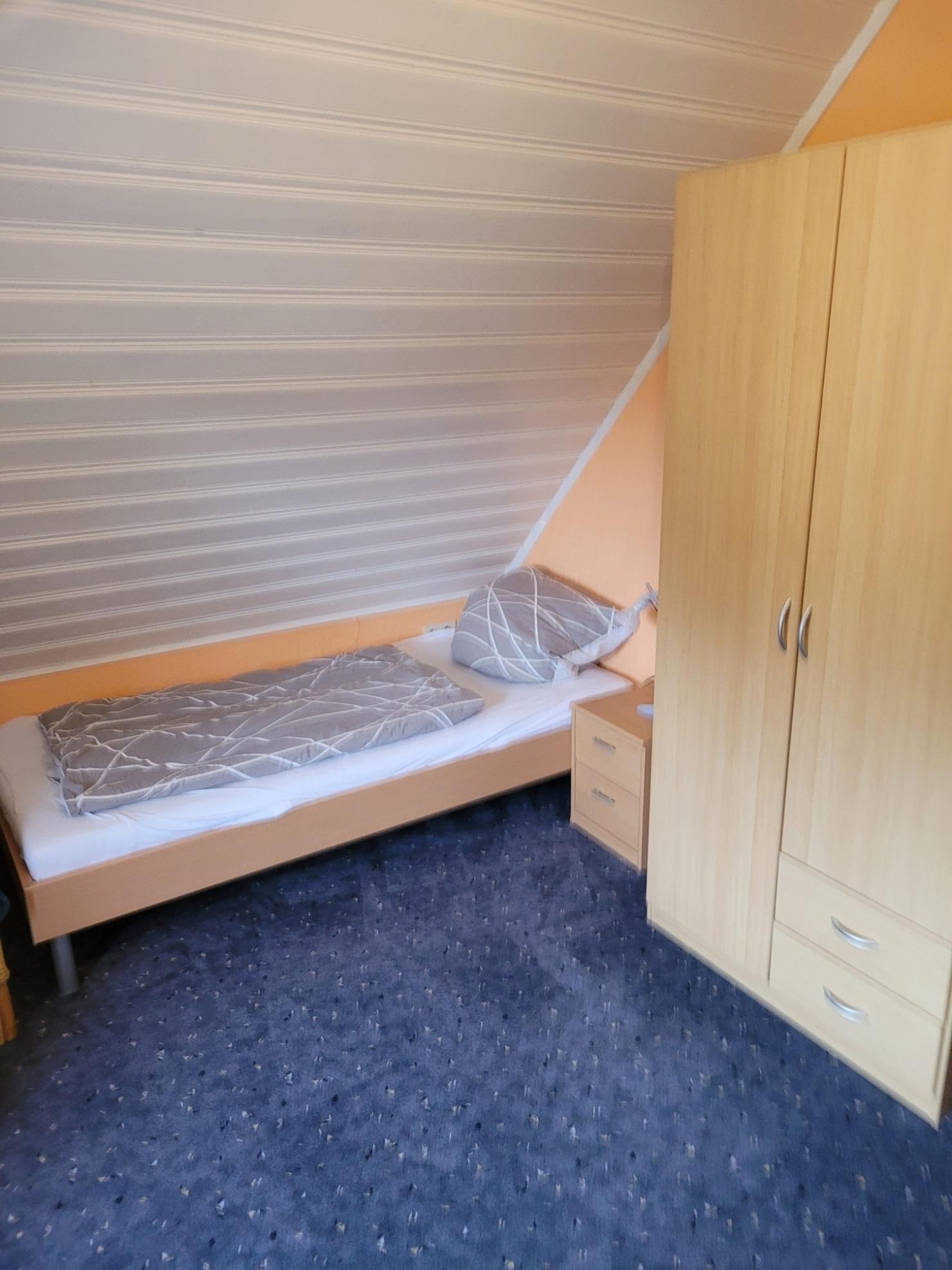 Im 1. Stock befinden sich zwei Schlafzimmer, einmal mit Doppelbett, einmal mit zwei Einzelbetten. Ein Kinderbett mit Decke, Kopfkissen und Bettwäsche kann auf Wunsch kostenfrei dazugestellt werden.