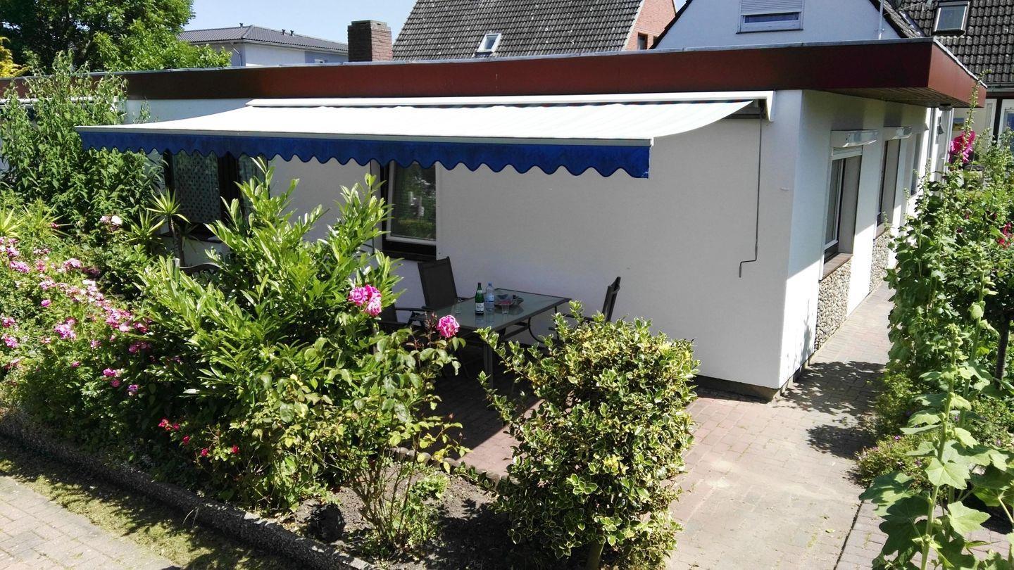 Zur Wohnung gehört auch eine eine schöne Terrasse mit Garten. Hier bieten Ihnen Gartenmöbel, Markise und Grill die Möglichkeit entspannte Stunden zu verbringen.