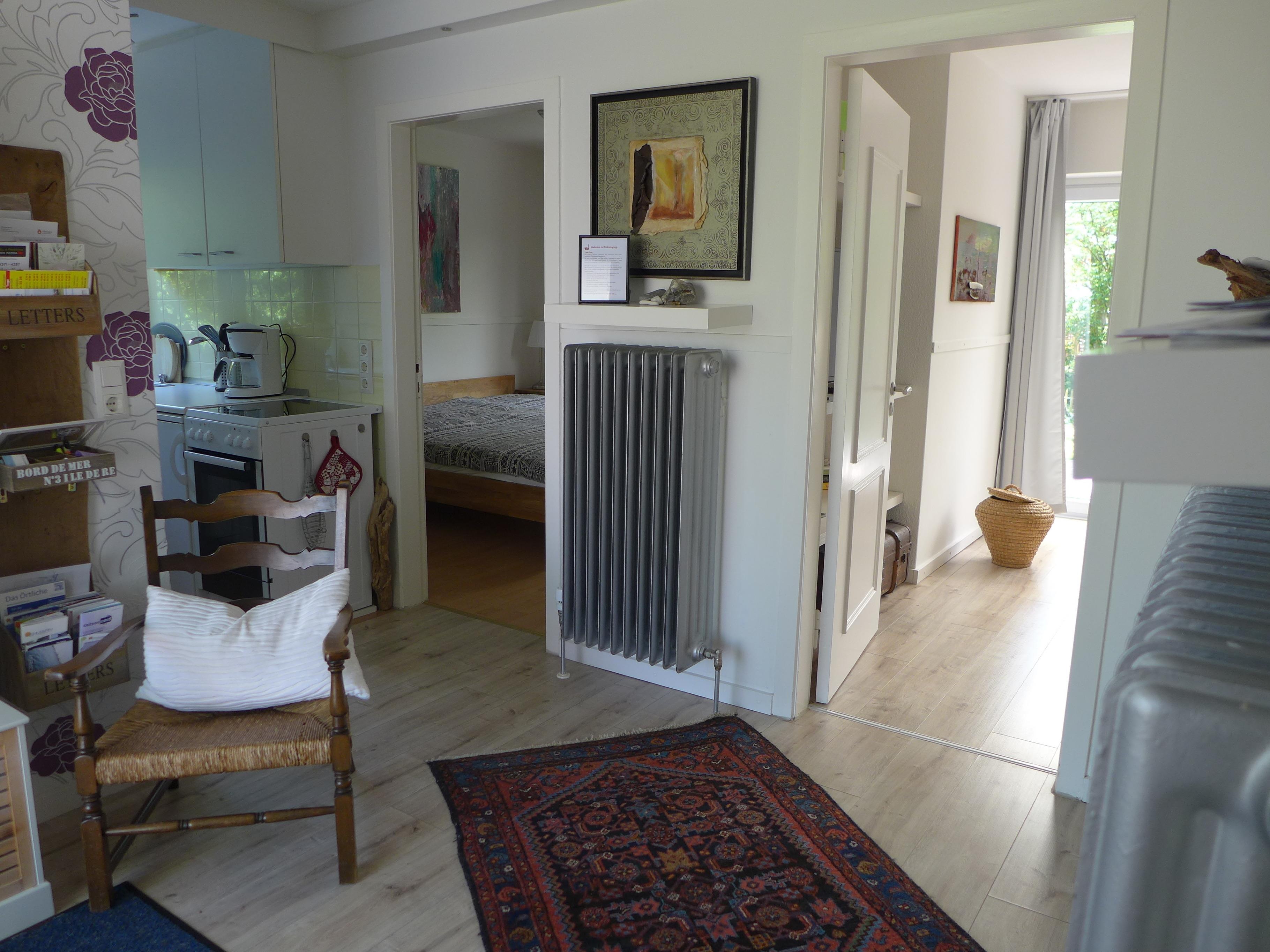 Die wunderschöne, geschmackvoll eingerichtete Ferienwohnung "Gartenblick" mit grosszügiger überdachter Terrasse ist komplett ausgestattet, Schlafzimmer mit einem Doppelbett von 1,80 x 2,00m ( 2 Matrazen).