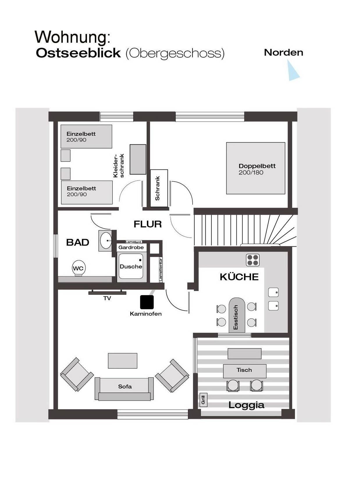 Alle Räume wirken mit ihren großzügigen Fenstern hell und geben durch die hochwertigen Fußböden in Holzplankenoptik eine gemütliche Wärme. Die Wohnung verfügt über ein Wohnzimmer mit gemütlichen Dachschrägen, eine offene Wohn-/Einbauküche, ein Duschbad und 2 Schlafzimmer (2 Einzelbetten, 1 Doppelbett). Zur Verfügung stehen Ihnen Allergiker geeignete Matratzen, Bettdecken und Kissen. Auf der Loggia befinden sich Gartenmöbel und ein Elektrogrill. Auch der Kohle-Kamingrill im extra Gemeinschaftsgarten vor dem Haus kann gerne genutzt werden