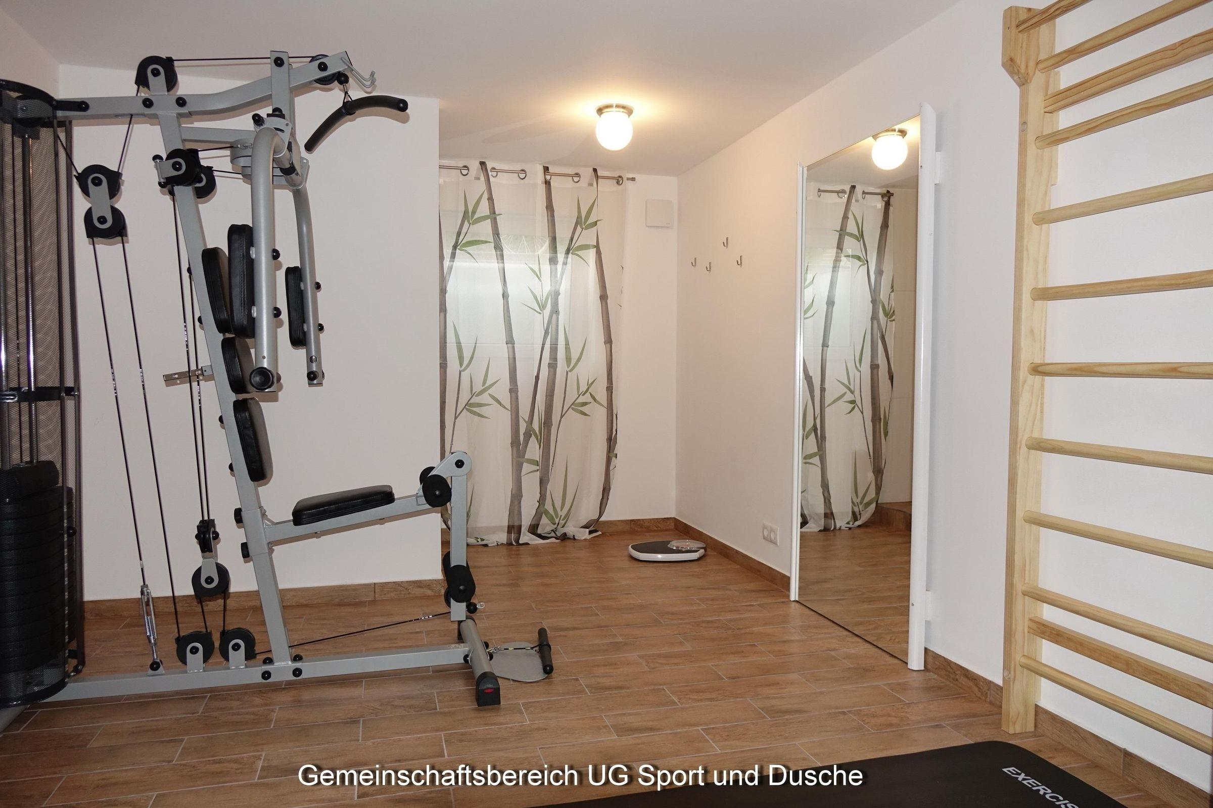 Sauna- und Sportraum mit Dusche zur kostenlosen Benutzung sowie Hauswirtschaftsraum mit Waschmaschine und Trockner stehen zentral im wohnlich ausgebauten Keller zur Verfügung.