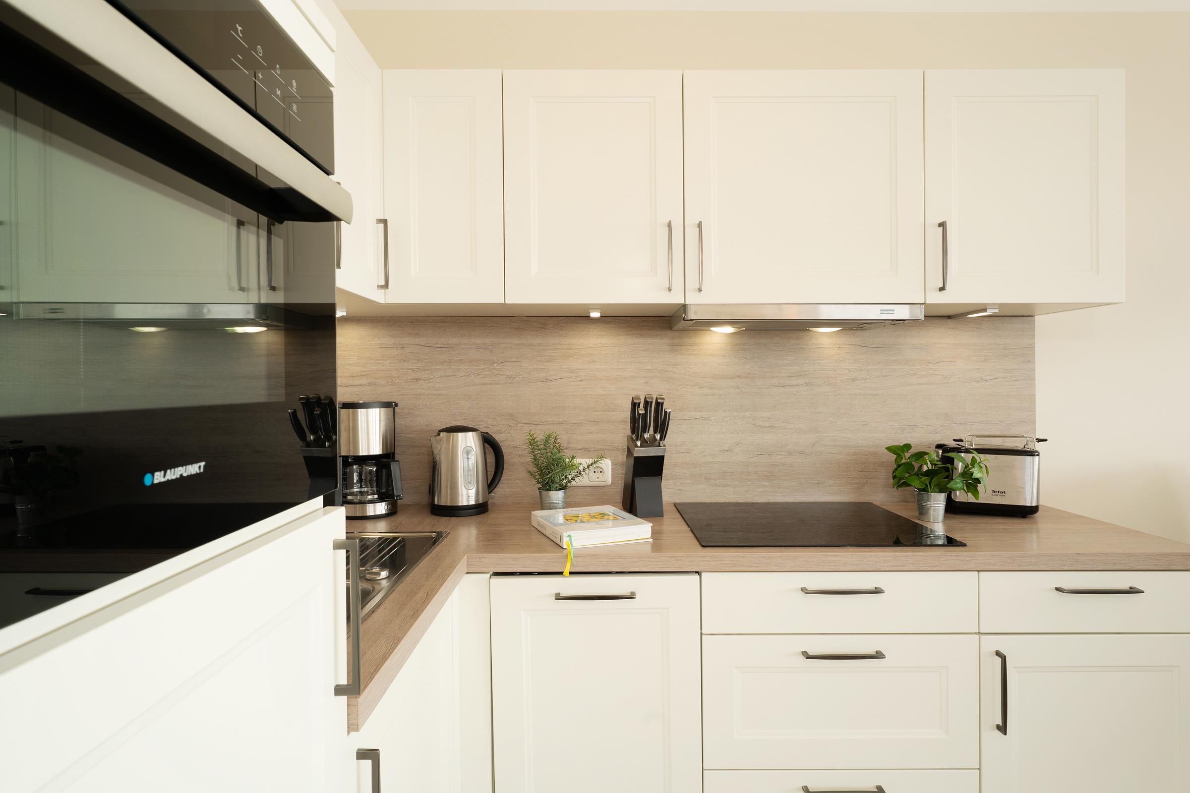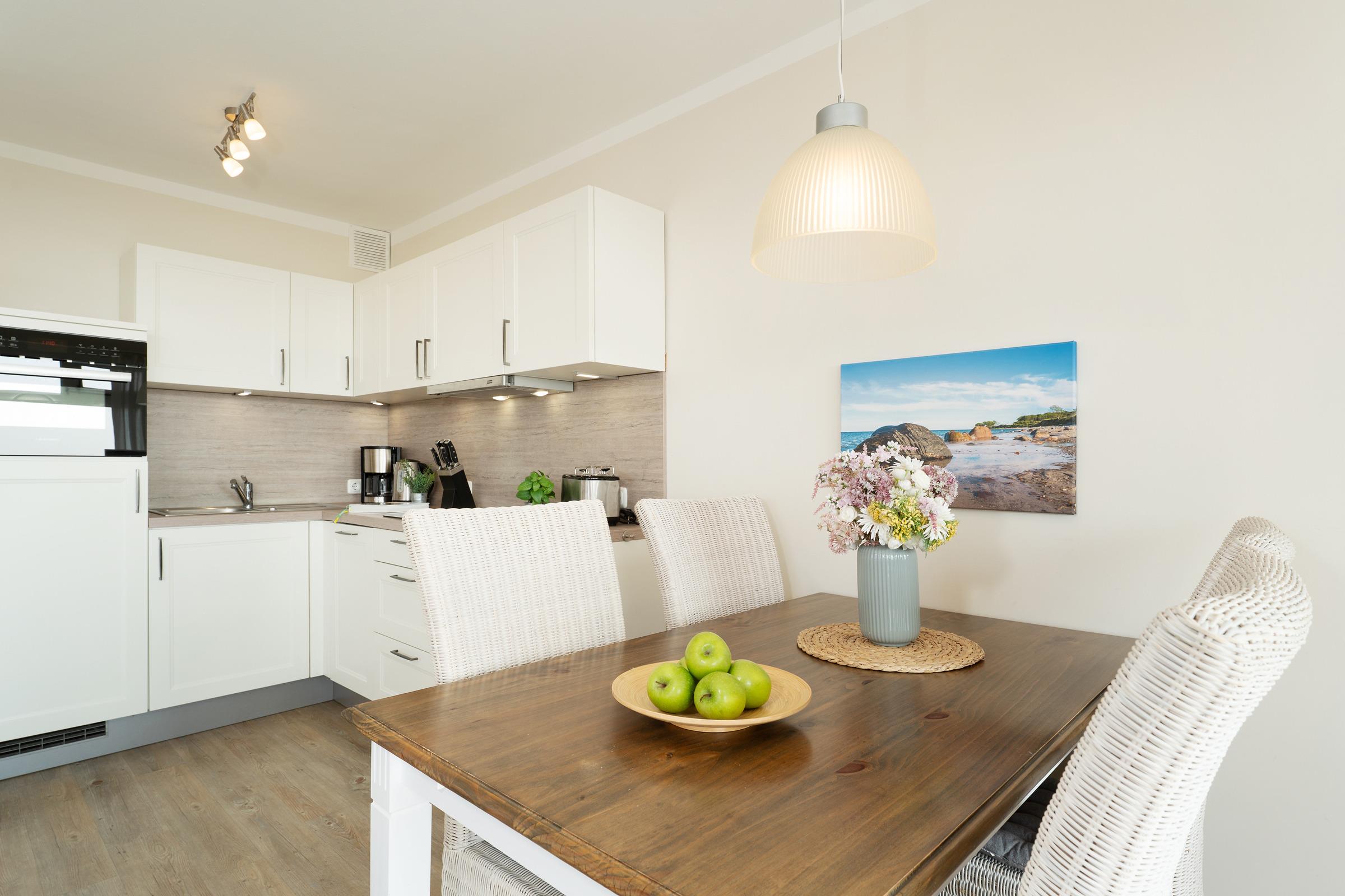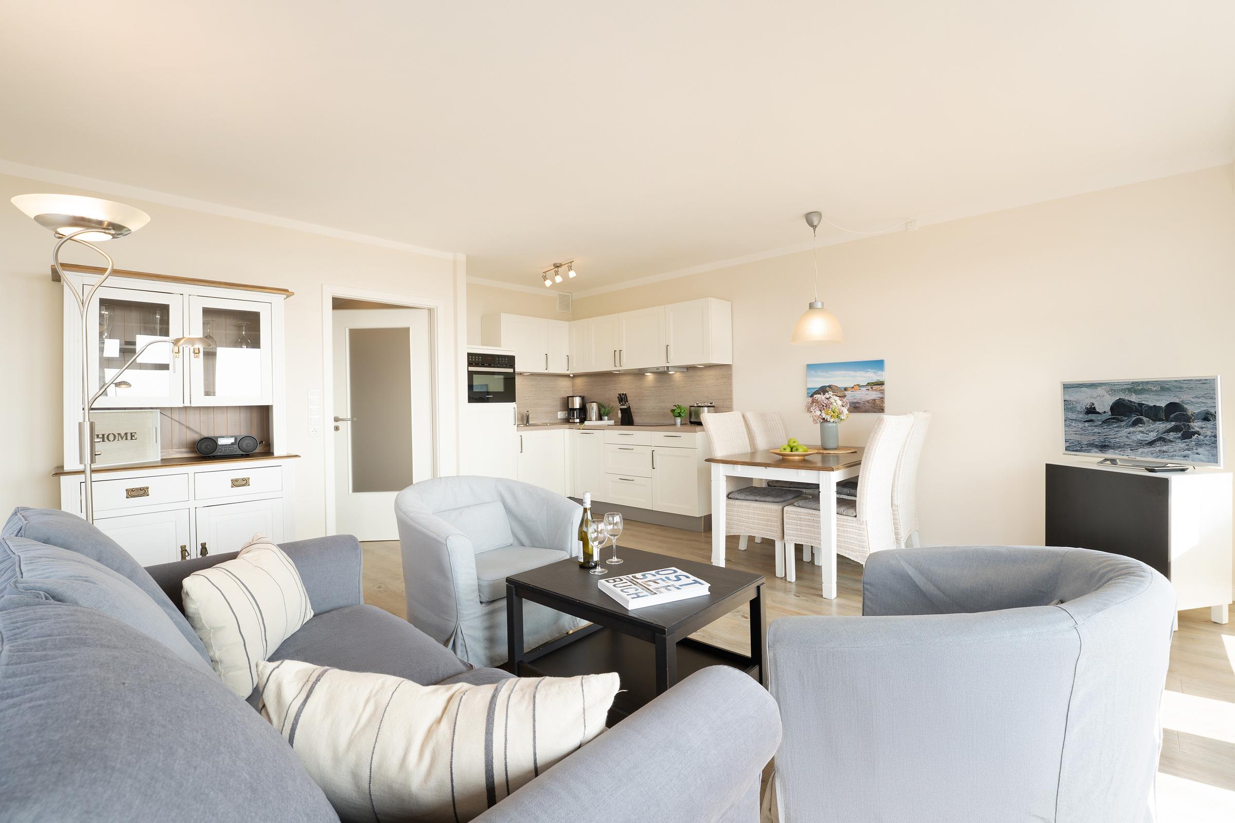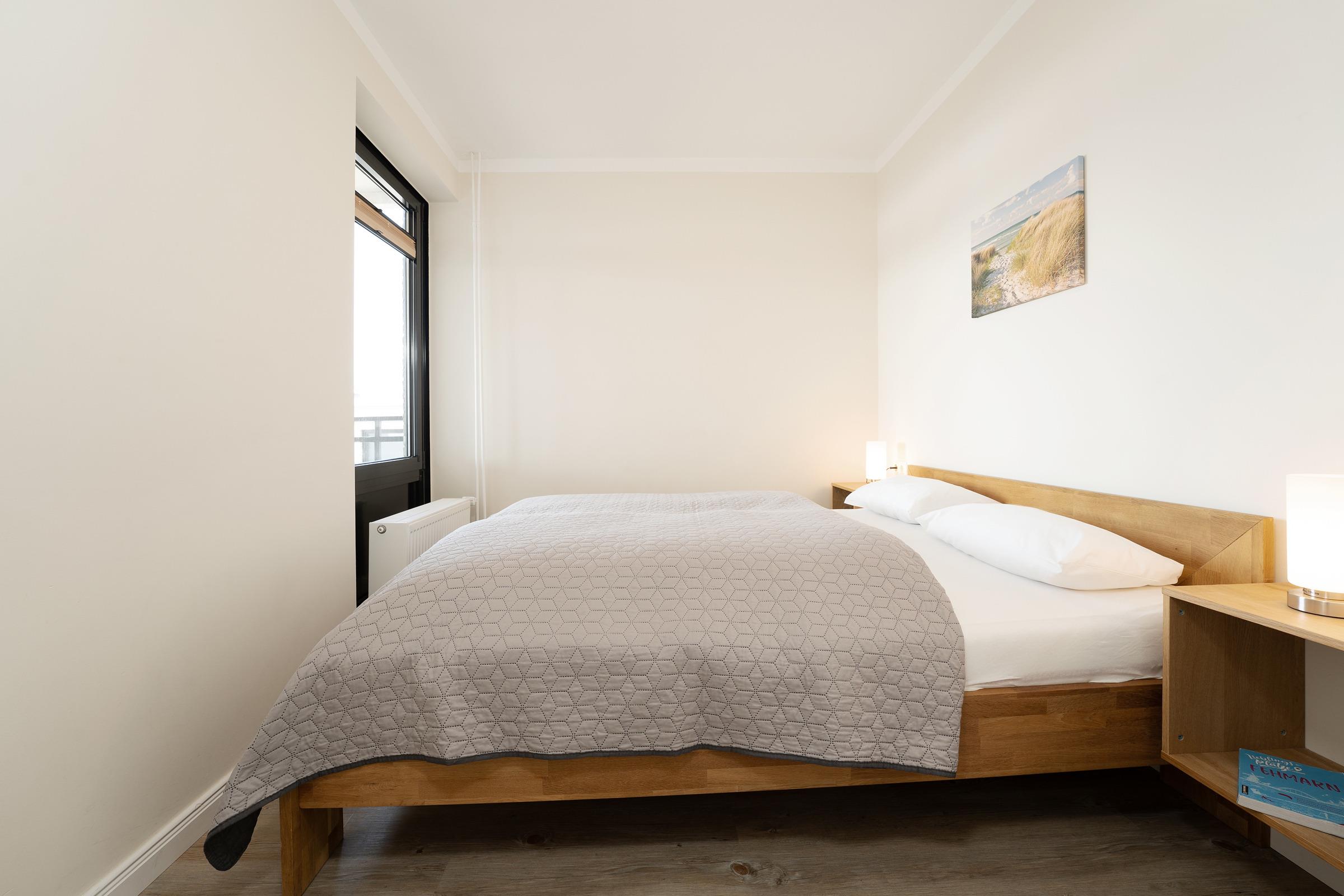 Herzlich willkommen im Urlaub! Ein Aufzug bringt Sie in Ihr Zuhause auf Zeit. Die geschmackvoll eingerichtete Wohnung bietet einen großen Wohn- und Essraum mit offener Küchenzeile. Die gute Ausstattung mit Induktionsherd, Backofen mit integrierter Mikrowelle sowie Geschirrspüler sorgt bei der Selbstversorgung für gute Laune. Für ein zeitgemäßes Medienerlebnis erwartet Sie eine kleine Musikanlage (Radio, CD, Bluetooth), ein Fernseher sowie ein kostenloser WLAN-Anschluss. Das Highlight des Feriendomizils ist sicher der großzügige Balkon. Sie haben in die eine Richtung einen tollen Blick auf die nur 100 m entfernte Ostsee. In der anderen Richtung fällt Ihr Blick auf das in der Ferne gut sichtbare Wahrzeichen der Insel Fehmarn: die Fehmarnsundbrücke. Die zwei getrennte Schlafzimmer, in denen jeweils ein Doppelbett steht, sorgen für eine angenehme Nachtruhe. Das Duschbad ist hell gefliest. Der Strand, genutzt nur von Bewohnern der Ferienwohnanlage, befindet sich nur zwei Gehminuten vom Haus entfernt und wird ohne das Überqueren einer Straße erreicht.
