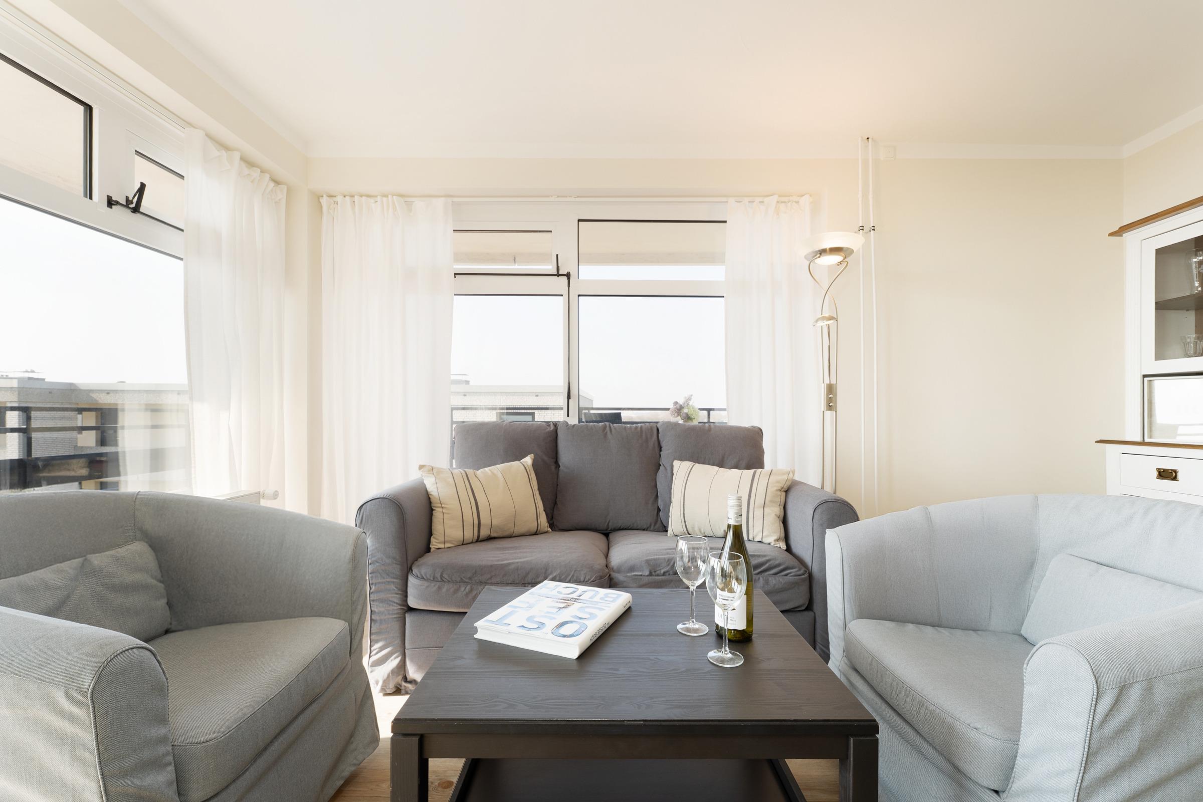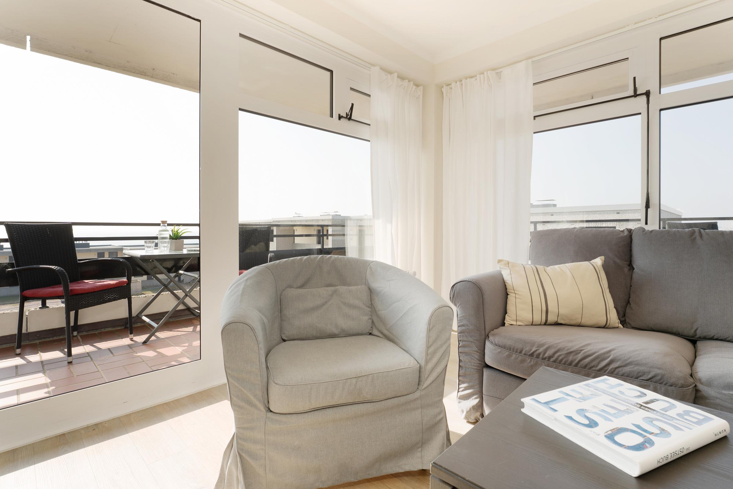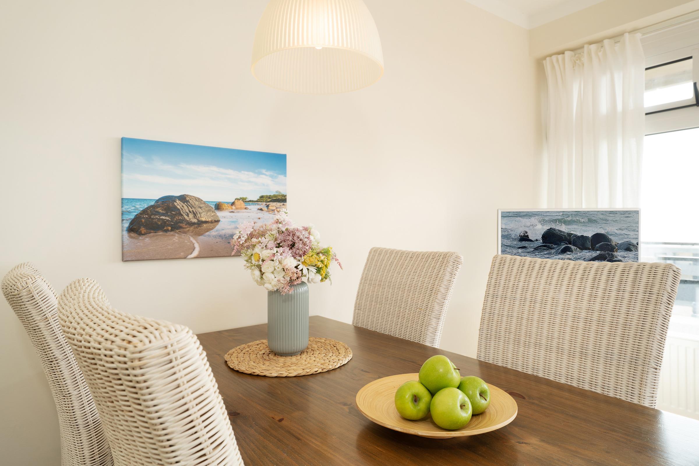 An der schönen Südküste der Insel Fehmarn: Die traumhafte, ca. 51 m² große 3-Zimmer-Ferienwohnung mit umlaufendem Balkon und Meerblick befindet sich im 2. Stock und ist für bis zu 4 Personen geeignet.