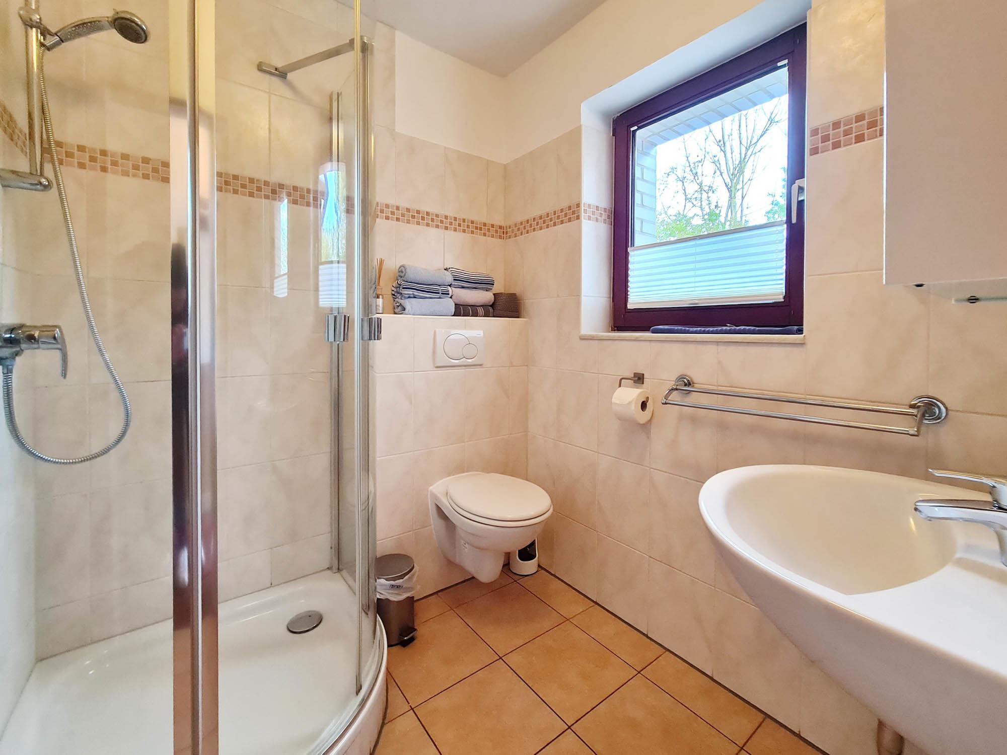 Badezimmer mit Waschtisch, WC und Dusche mit Echtglasabtrennung bietet genügend Abstellfläche.