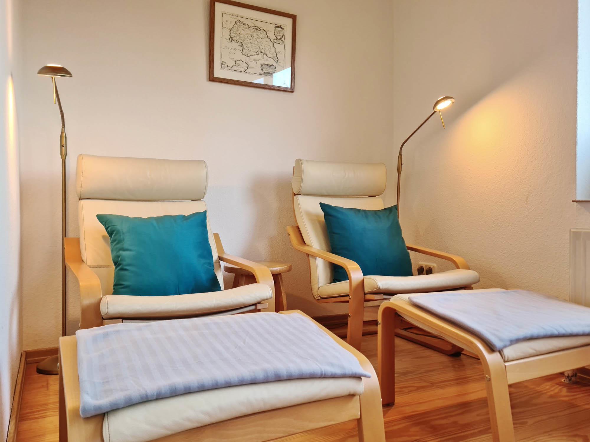 Eine gemütliche Leseecke mit 2 Ledersesseln und dazugehörigen Fußhockern und einem Farbfernseher laden zum Entspannen ein.
