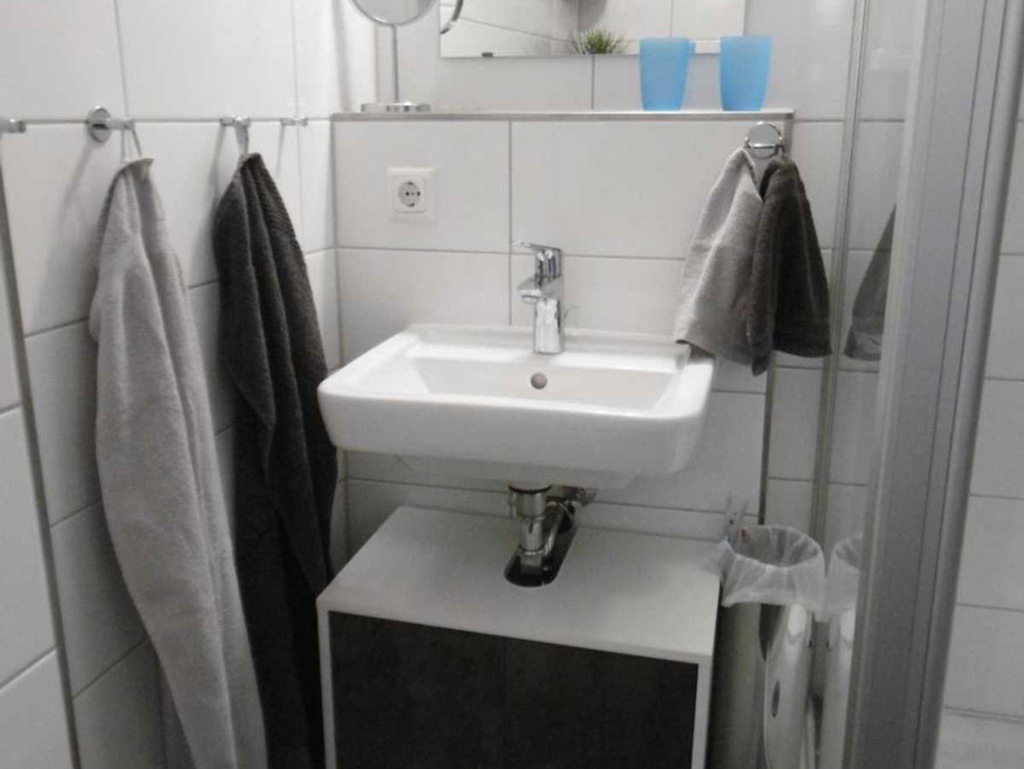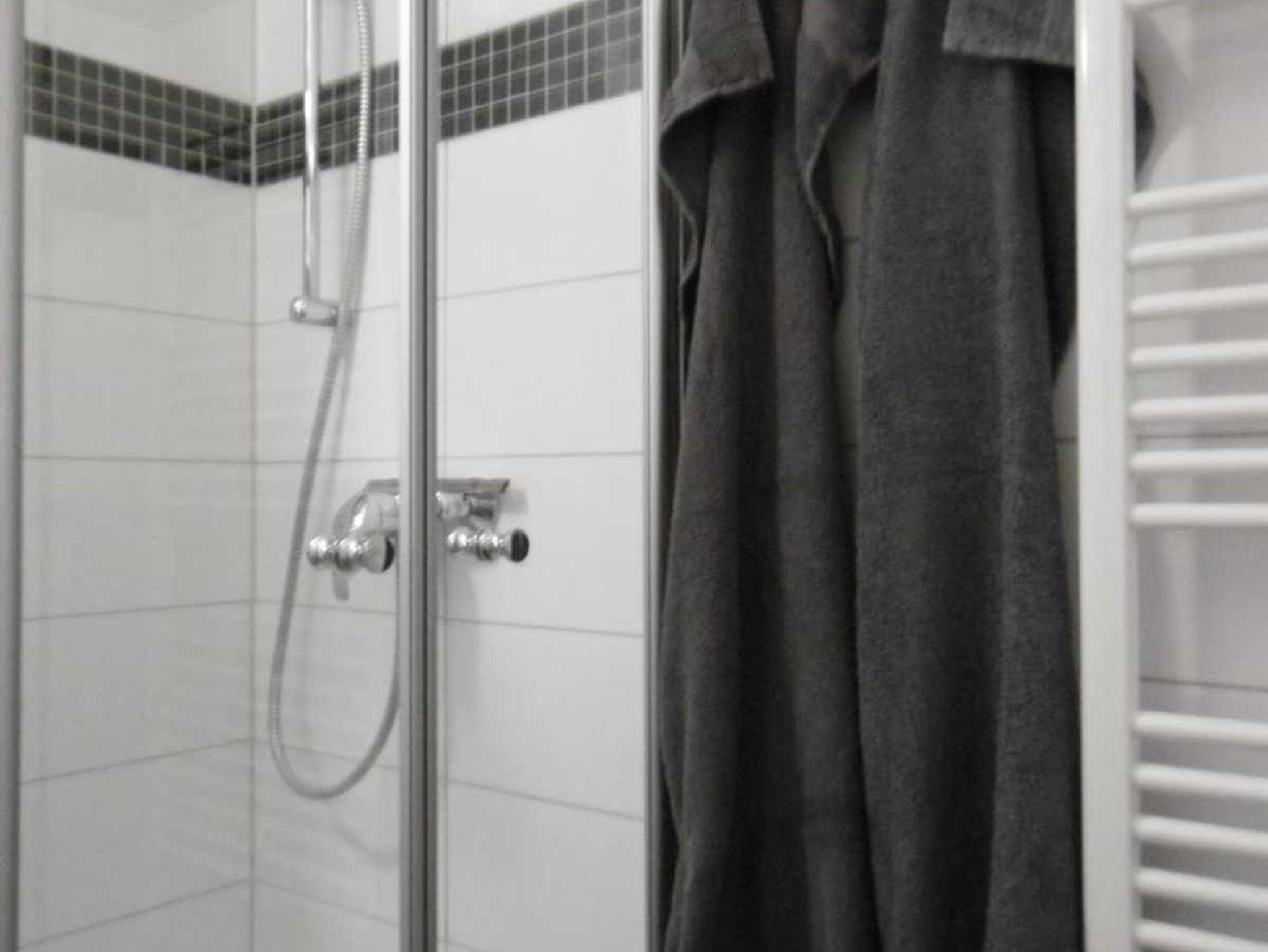 Das helle Duschbad ist mit Handtuchheizkörper, Wäschespinne und Fön ausgestattet.