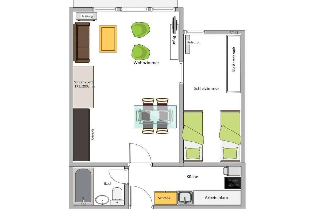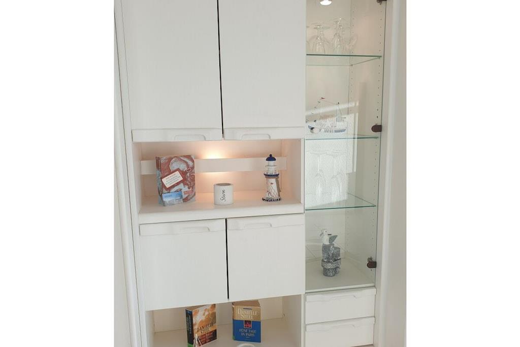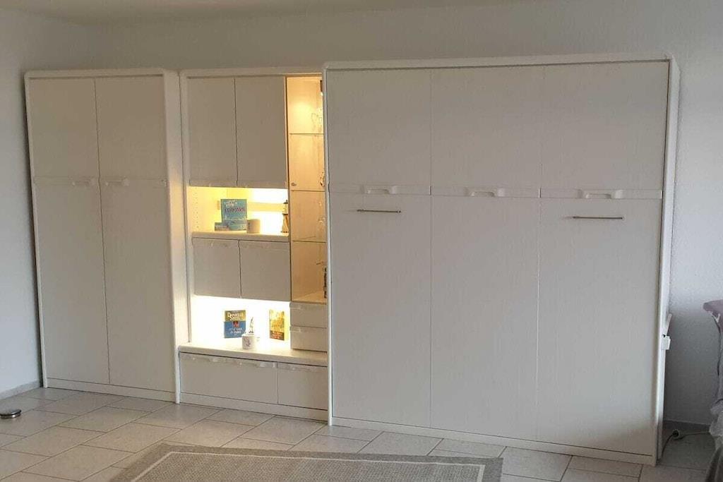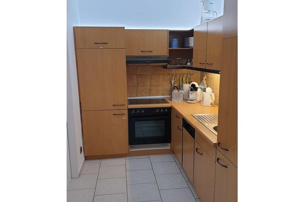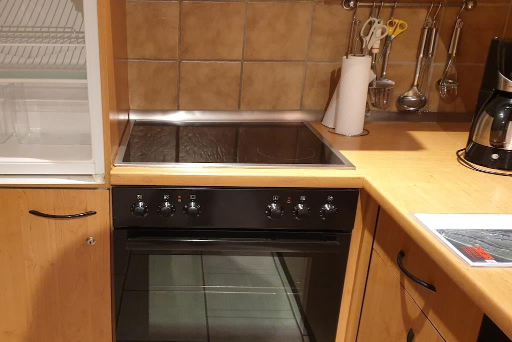 Leiligheten i første etasje har stue/soverom med en Murphy-seng, kjøkken med keramisk koketopp, mikrobølgeovn, kjøleskap, oppvaskmaskin osv., et separat soverom og et bad med badekar/dusj/toalett. Stuen har en 55-tommers TV, Wi-Fi (250 Mbps) og internettradio. Den store sørvendte balkongen er møblert med uteplassstoler og et bord. En anvist parkeringsplass er tilgjengelig ved huset.