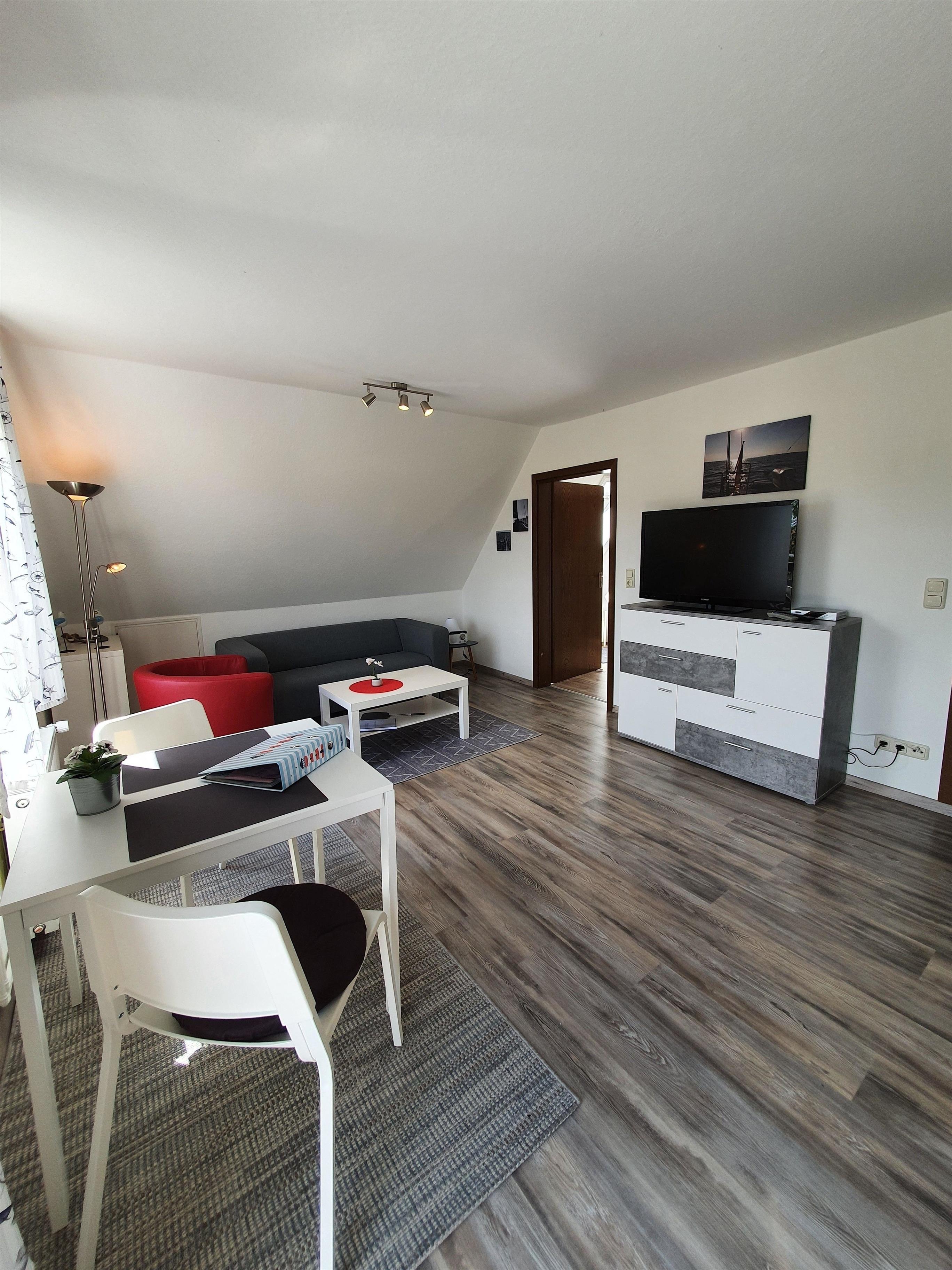 Der Wohnbereich ist mit neuen Möbeln hell und freundlich ausgestattet. Ein Flachbildfernseher mit Sat-TV, Radio, Bücher und Brettspiele sowie eine Informationsmappe zur Insel sind vorhanden.