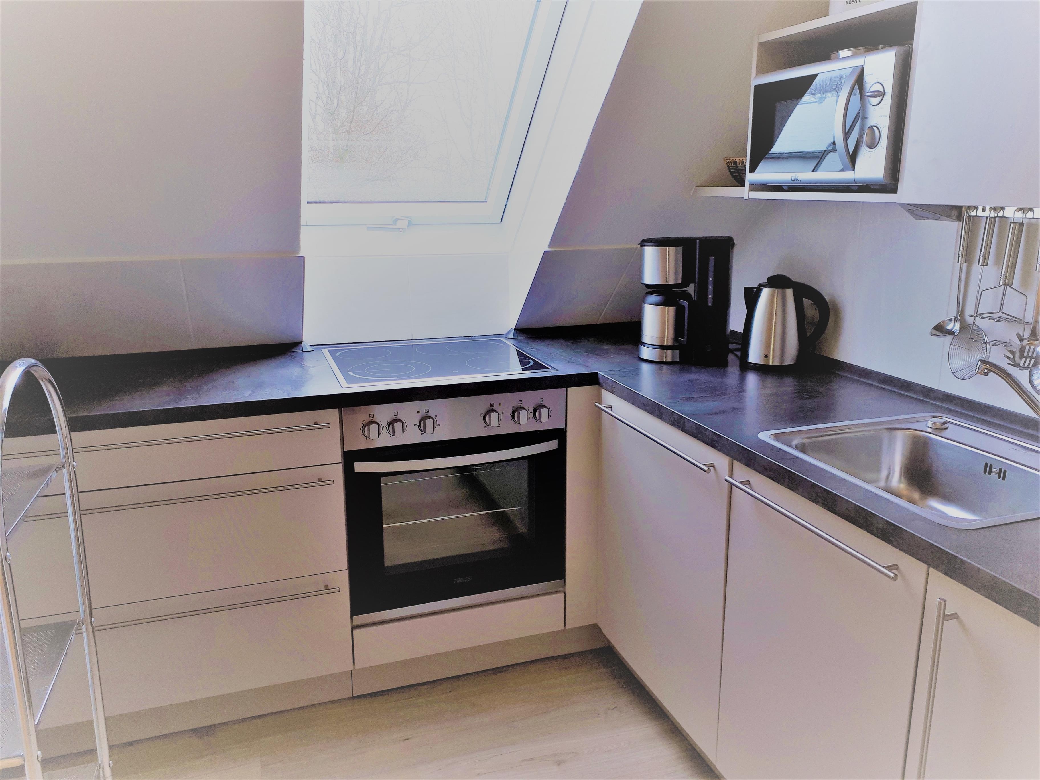 Die Küche ist komplett mit Geschirr, Backofen, Mikrowelle, Geschirrspüler, Kaffeemaschine, Mixer, Wasser- und Eierkocher ausgestattet.