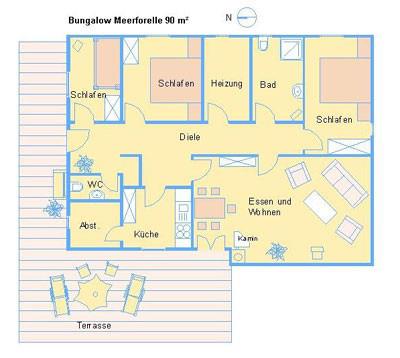 Es besteht aus einem Wohnzimmer, drei Schlafzimmer, einer Küche, einem Duschbad, einem Gäste WC, Flur und Abstellraum