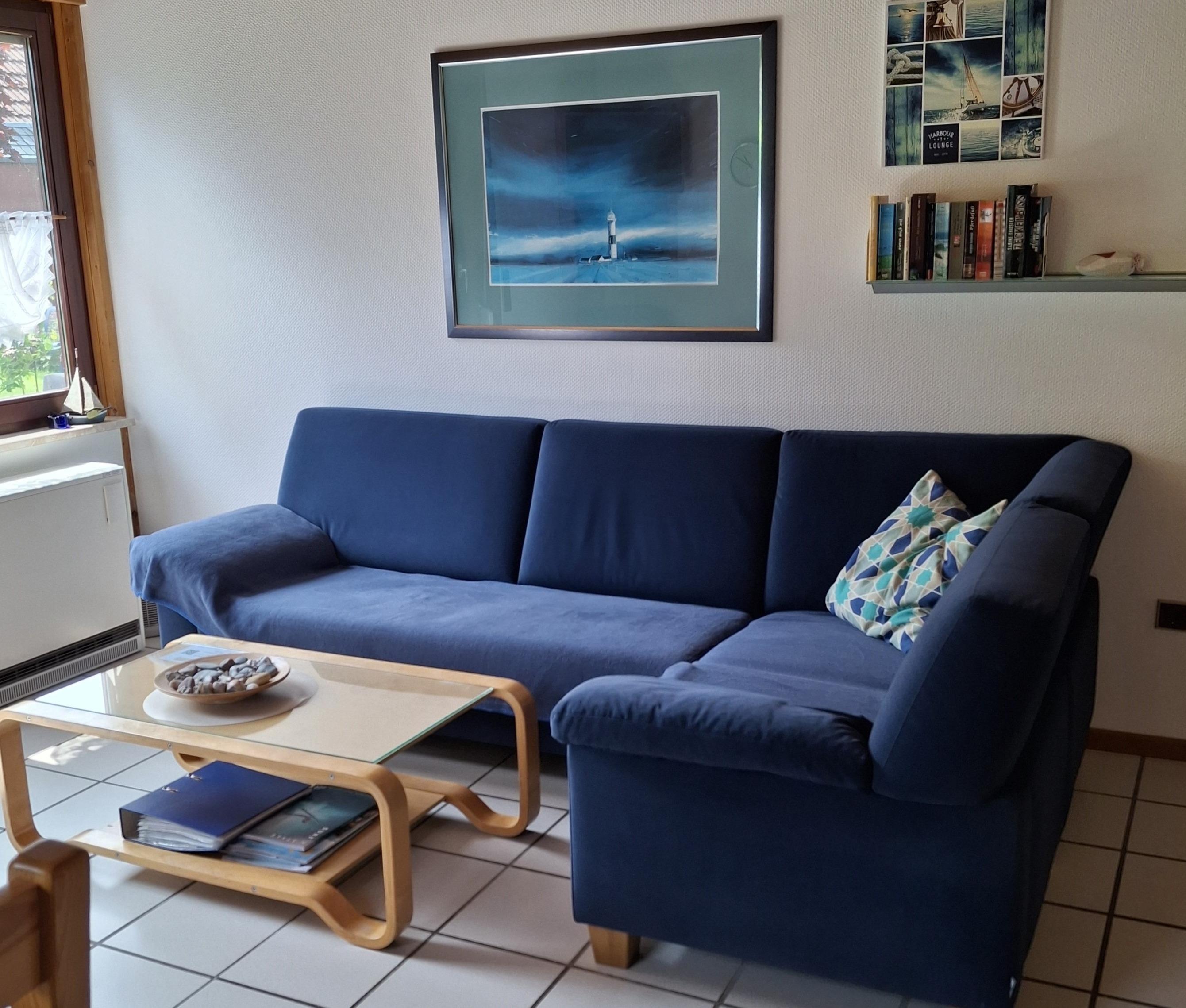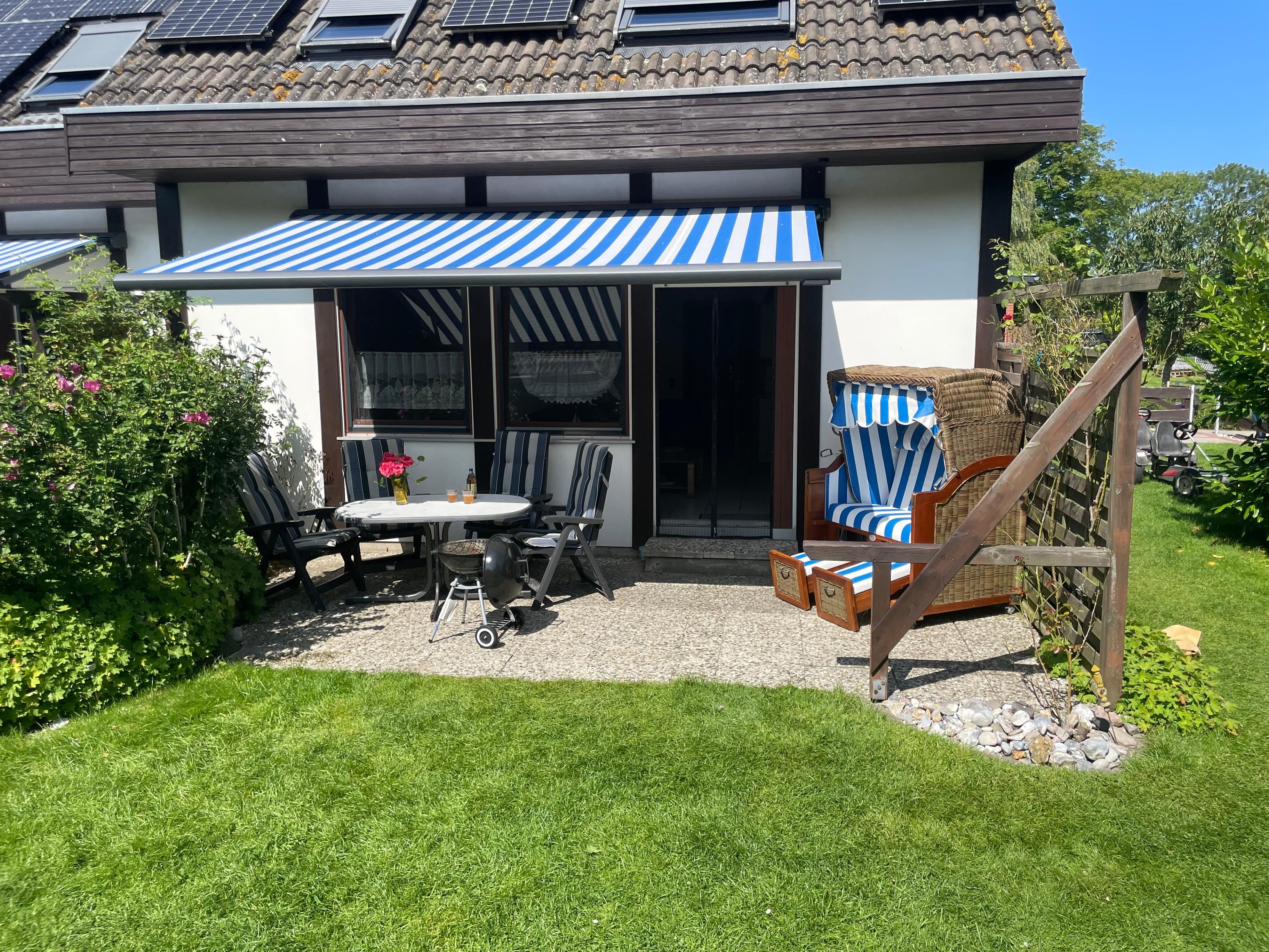 Die Ferienwohnung hat eine Südterrasse mit Markise. Die Terrasse ist ausgestattet mit Strandkorb, Gartenmöebln,Sitzauflagen und Grill.