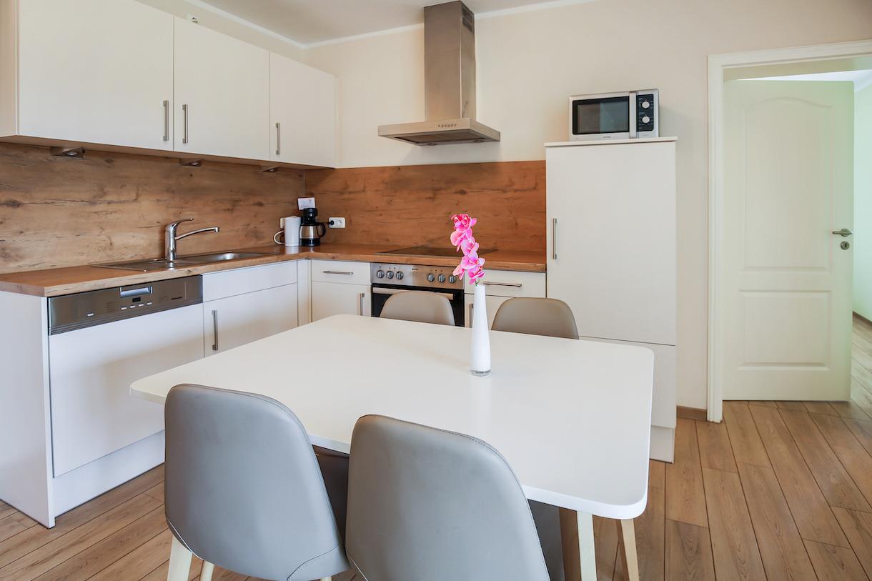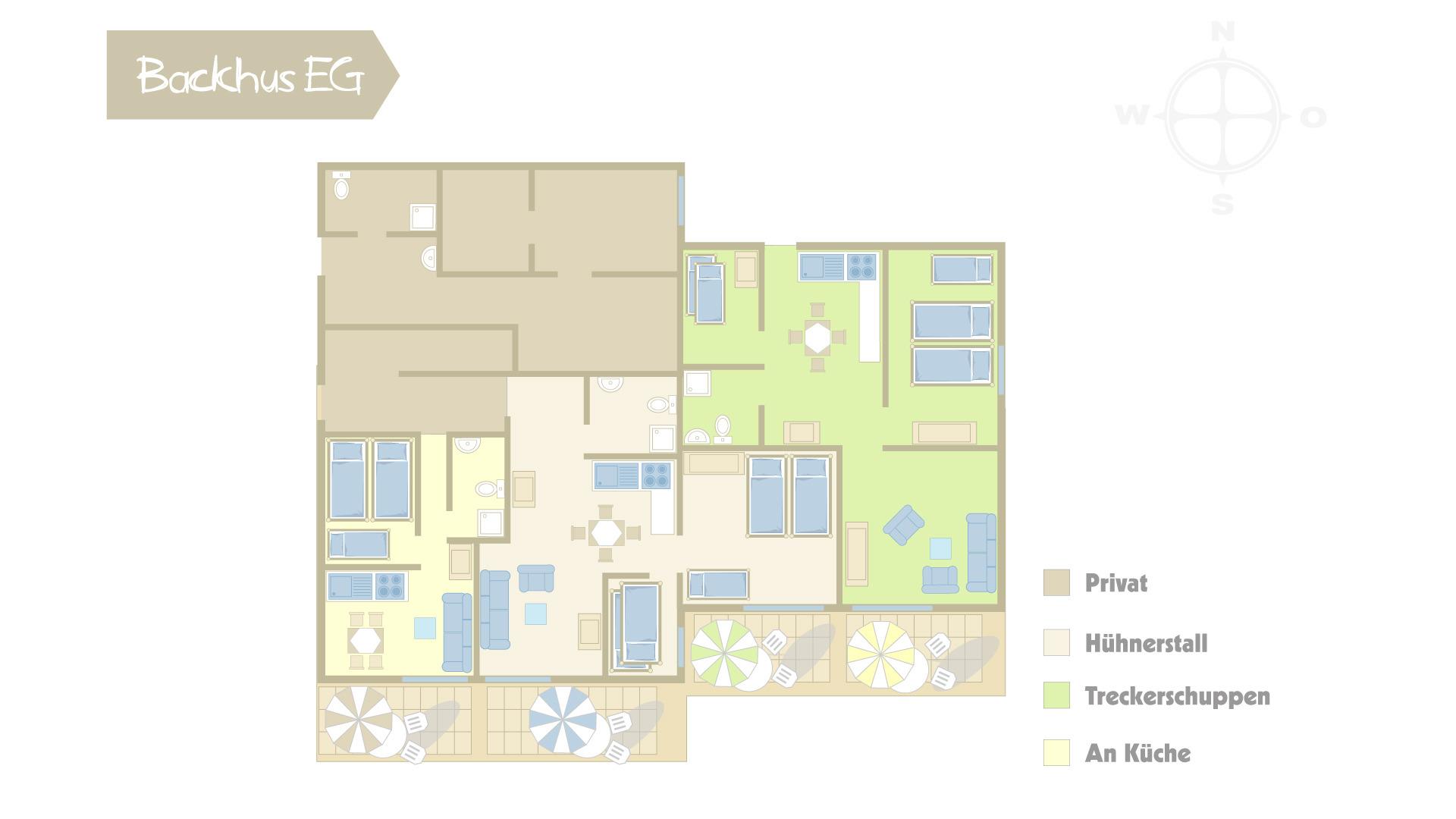 Wohnung "Hühnerstall" (55qm): Die Wohnung befindet sich im Erdgeschoss des "Alten Backhaus". Sie hat zwei separate Schlafzimmer, Duschbad mit WC, einen Wohnraum mit voll ausgestatteter Küche, Esstisch, Sofagarnitur, Flachbild-TV, DVD-Player usw. und eine Südterrasse mit direktem Zugang zum Spielplatz und Blick auf die Ponyweide und die Ostsee. Die modern renovierte Wohnung ist vom DTV mit vier Sternen ausgezeichnet.