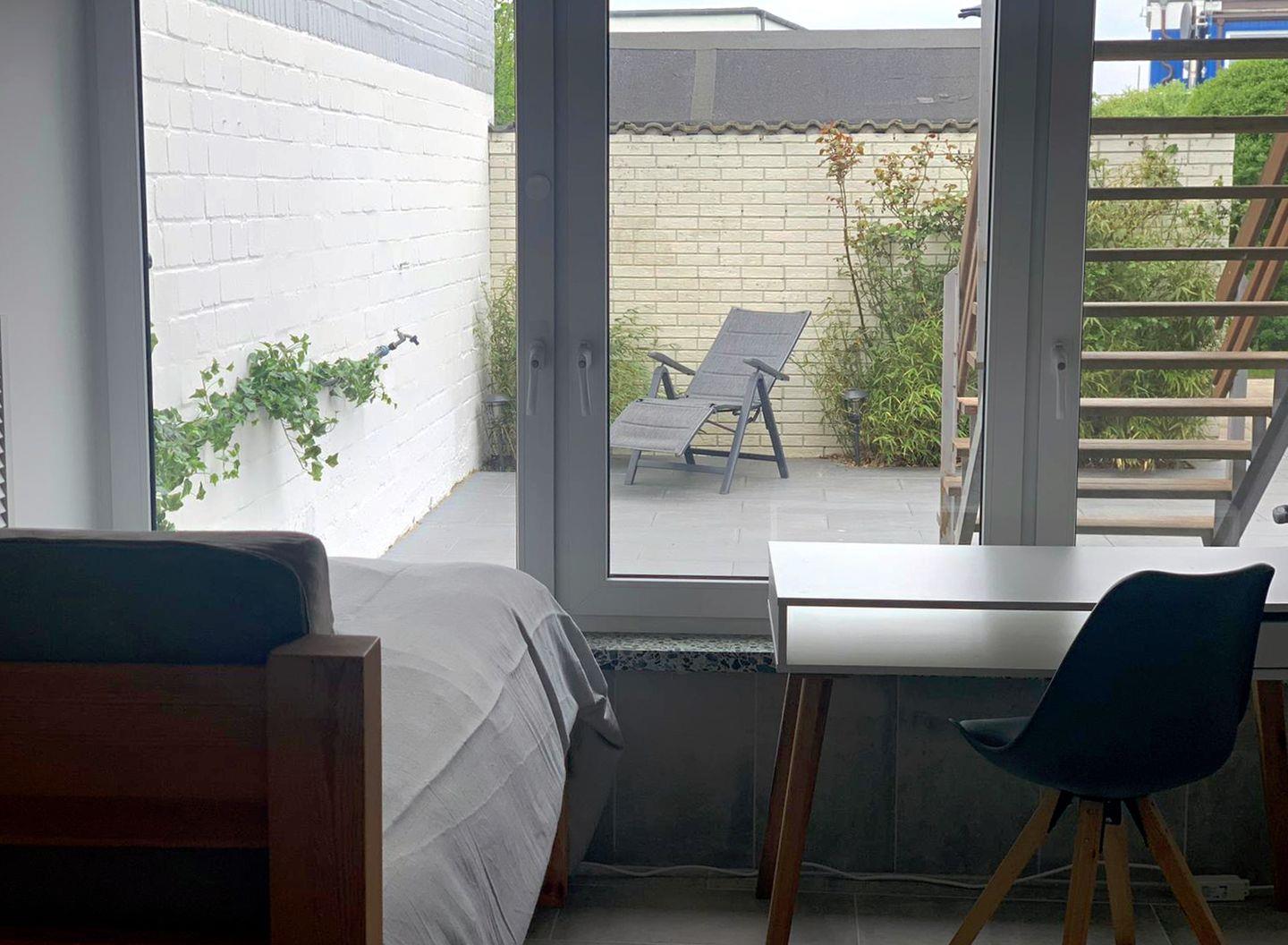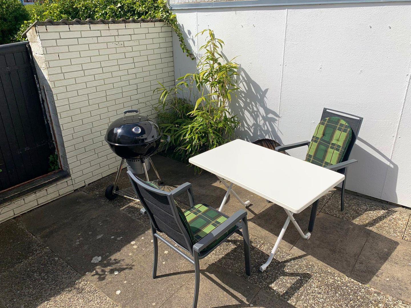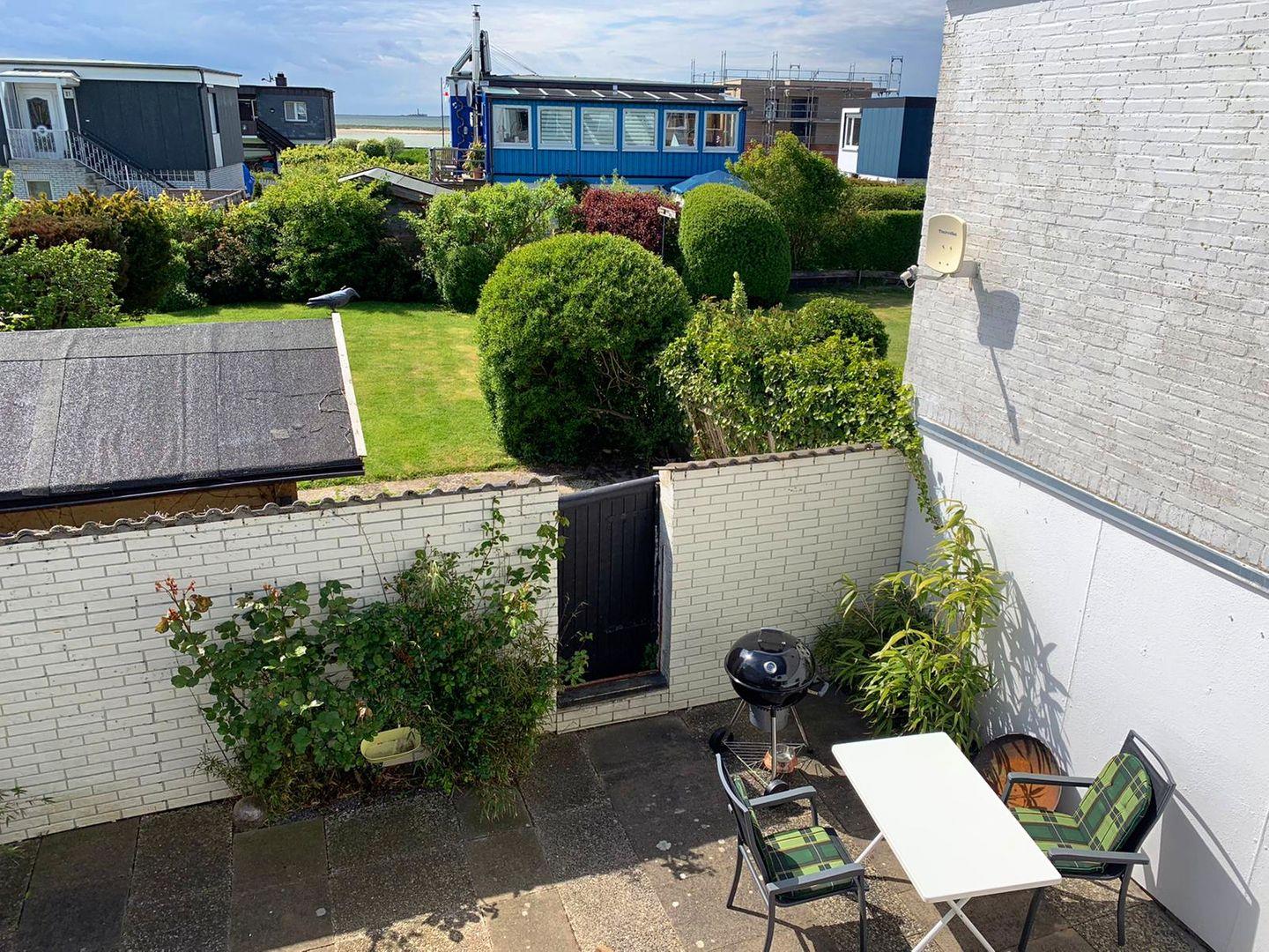 Im Erdgeschoss erwartet Sie ein gemütliches Schlafzimmer mit zwei Einzelbetten sowie ein Gäste-WC. Von hier gelangen Sie in den abgeschlossenen Innenhof – windgeschützt und komplett eingezäunt, ideal zum Sonnenbaden oder damit Ihre Hunde sicher herumtoben können. Der Innenhof führt in den großzügigen Garten mit viel Rasenfläche: genug Platz für Hunde, zum Trocknen von Surfequipment oder um die SUPs abzustellen.