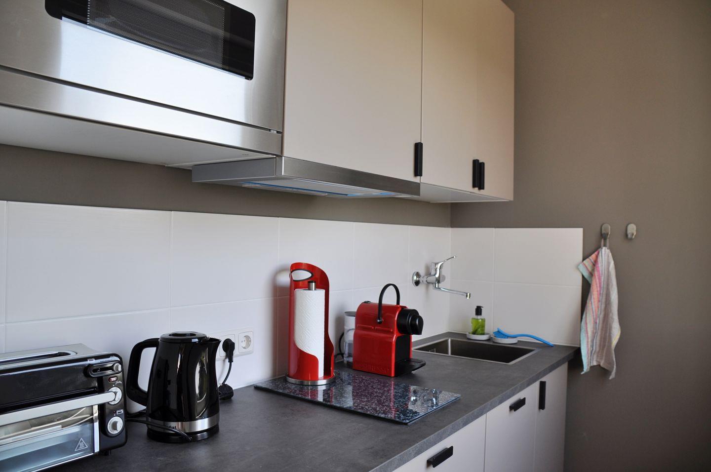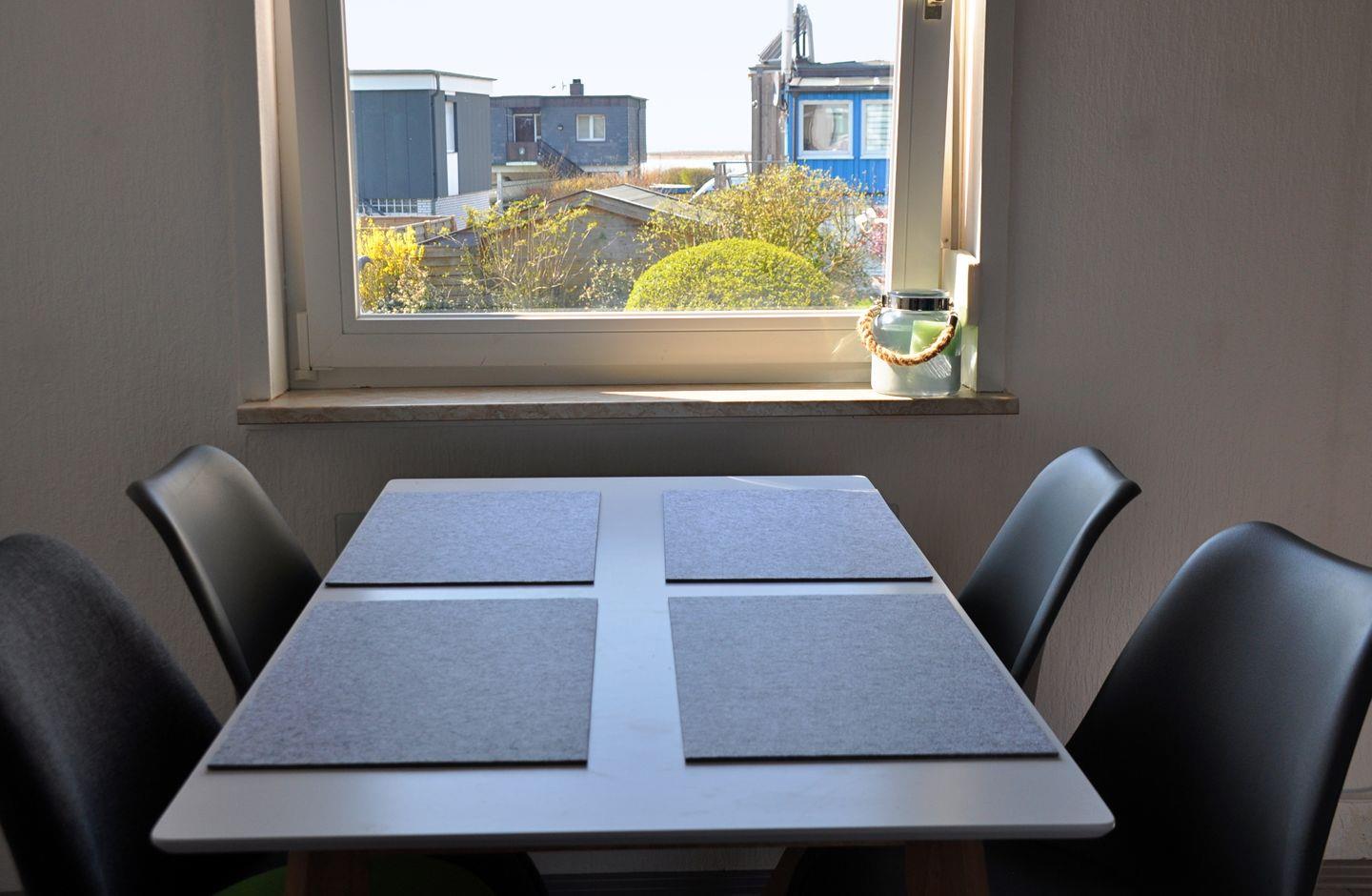 Über die Außentreppe erreichen Sie das lichtdurchflutete Obergeschoss mit einem gemütlichen Schlafzimmer mit Doppelbett, einer separaten Küche, sowie einem Wohn- und Essbereich mit viel Platz zum Entspannen und einem modernen Duschbad. Hier trifft nordischer Charme auf entspanntes Wohngefühl. Die Küche ist gut ausgestattet – u.a. mit Geschirrspülmaschine, Nespresso-Maschine und Airfryer, allerdings ohne Backofen.