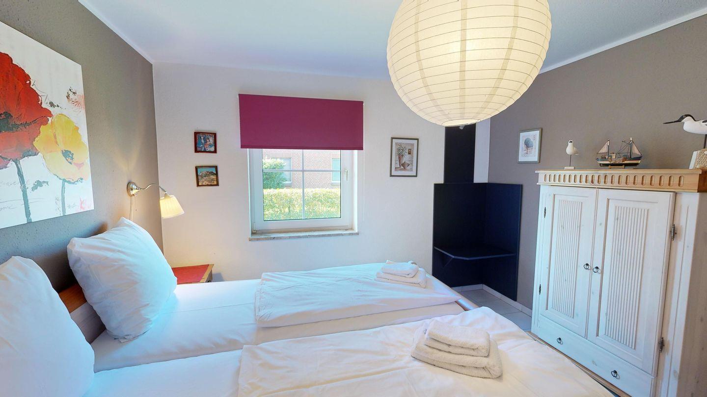 Die Wohnung begeistert mit zwei liebevoll eingerichteten Schlafzimmern: Ein behagliches Doppelbett für die Eltern und ein separates Kinderzimmer mit Etagen- und Einzelbett – ideal für den Familienurlaub. Im Mittelpunkt steht der offene Wohn- und Essbereich mit Kamin, der auch an kühleren Tagen für eine warme und entspannte Atmosphäre sorgt.
