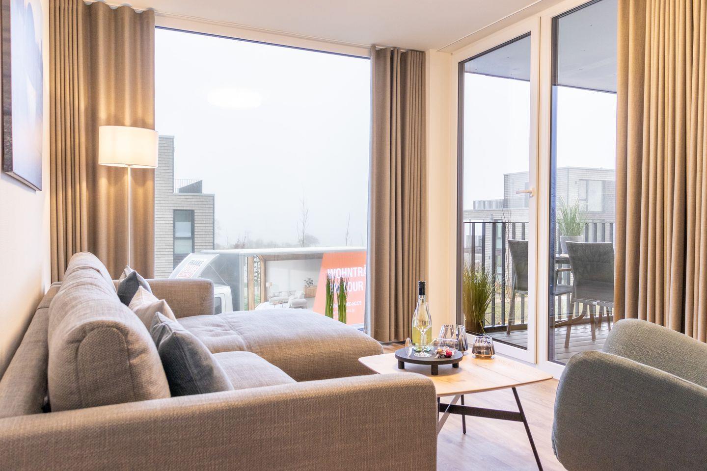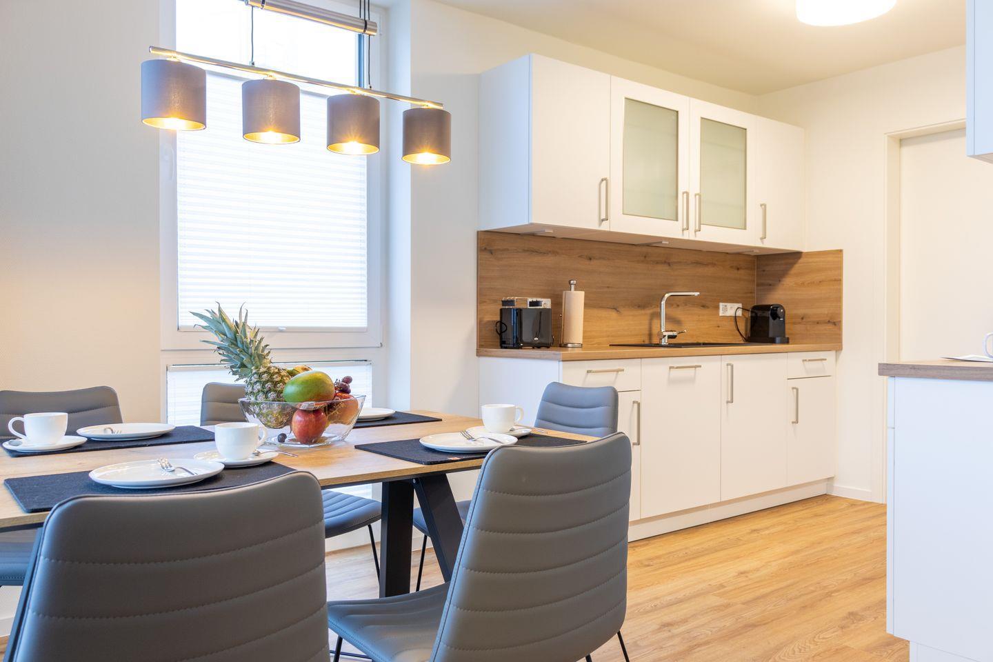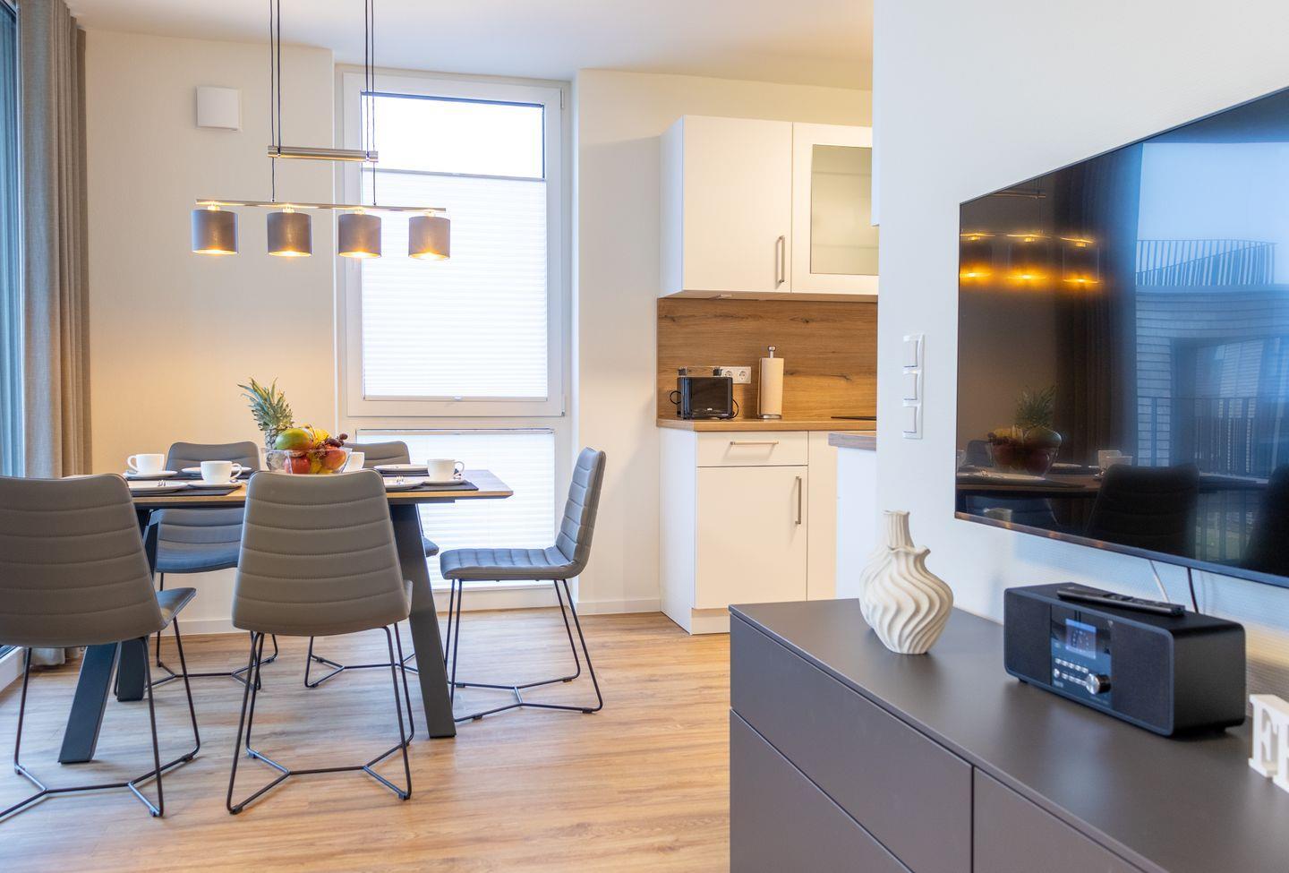 Im offenen Wohnbereich erwartet dich eine großzügige Sofalandschaft, bodentiefe Fenster und der direkte Zugang zur überdachten Loggia. Hier verschmelzen Licht, Meerblick und Gemütlichkeit zu deinem ganz persönlichen Wohlfühlort. Die moderne Küche mit hochwertigen Markengeräten lässt keine Wünsche offen – ob Geschirrspüler, Backofen oder Mikrowelle: Alles ist vorbereitet für dein gemeinsames Kocherlebnis. Waschmaschine und Trockner ergänzen die Ausstattung – und dank Aufzug erreichst du deine Wohnung ganz bequem.