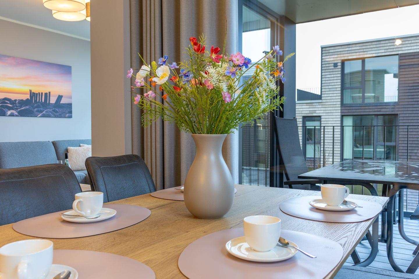 Der offene Wohnbereich überzeugt mit großen Fenstern, warmen Farben und bequemen Sitzmöbeln – inklusive OLED Smart-TV und Meerblick. Die moderne Küche ist mit hochwertigen Markengeräten ausgestattet, ergänzt durch Kühl-Gefrierkombination, Geschirrspüler und ein stilvolles Ambiente für gesellige Kochmomente. Vom Wohnbereich aus erreichst du direkt die überdachte Loggia mit traumhafter Aussicht.