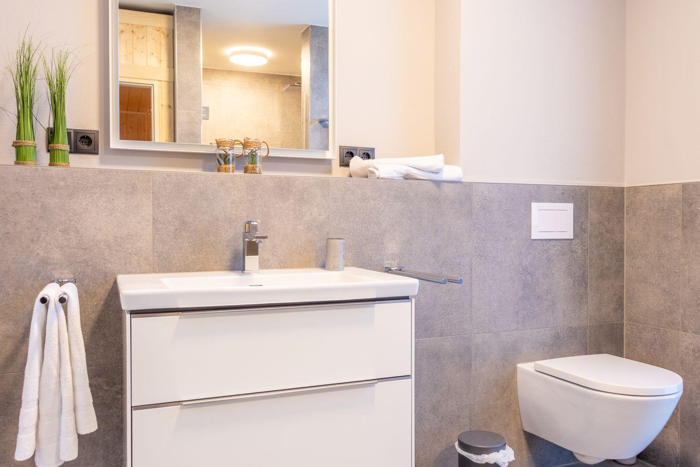 Genieße deine private Sauna, eine großzügige, bodengleiche Dusche und stilvolle Ausstattung mit beleuchtetem Spiegel. Hier findest du Ruhe, Erholung und Entspannung – ganz unabhängig vom Wetter draußen.