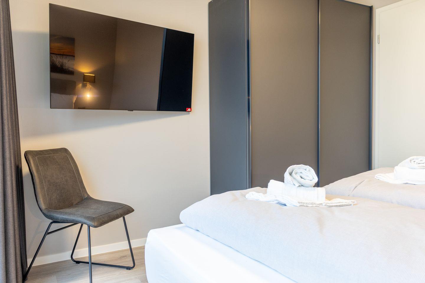 Zwei Schlafzimmer mit gemütlichen Boxspringbetten und Smart-TVs bieten dir besten Schlafkomfort. Eines der Zimmer punktet mit Meerblick. Verdunklungsmöglichkeiten sorgen für ruhige Nächte. Im Wohnbereich steht ein hochwertiges Schlafsofa bereit – ideal für Kinder oder weitere Gäste (Belegung über 4 Personen gegen Aufpreis). Hinweis: Alle Betten verfügen über durchgehende Matratzen.