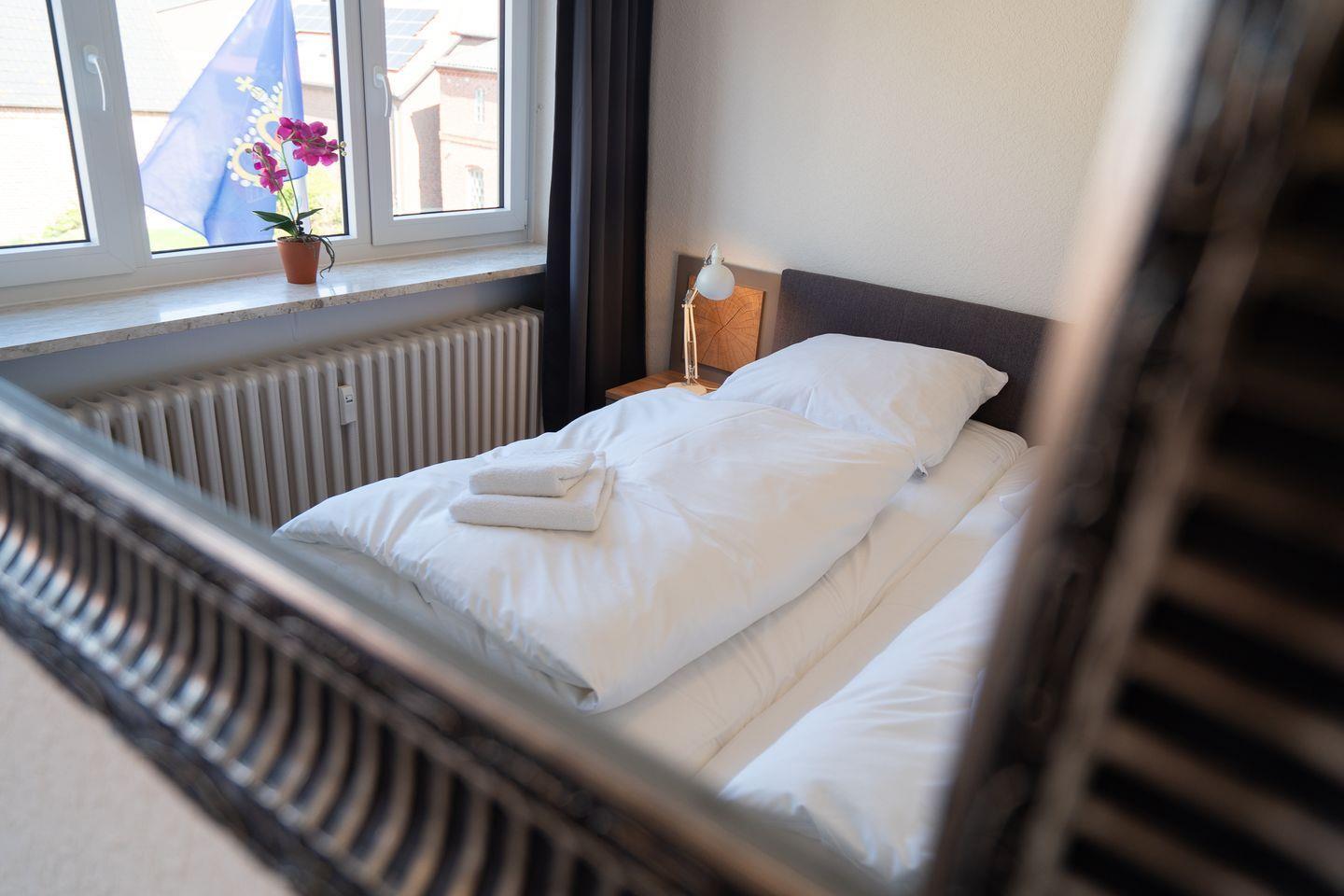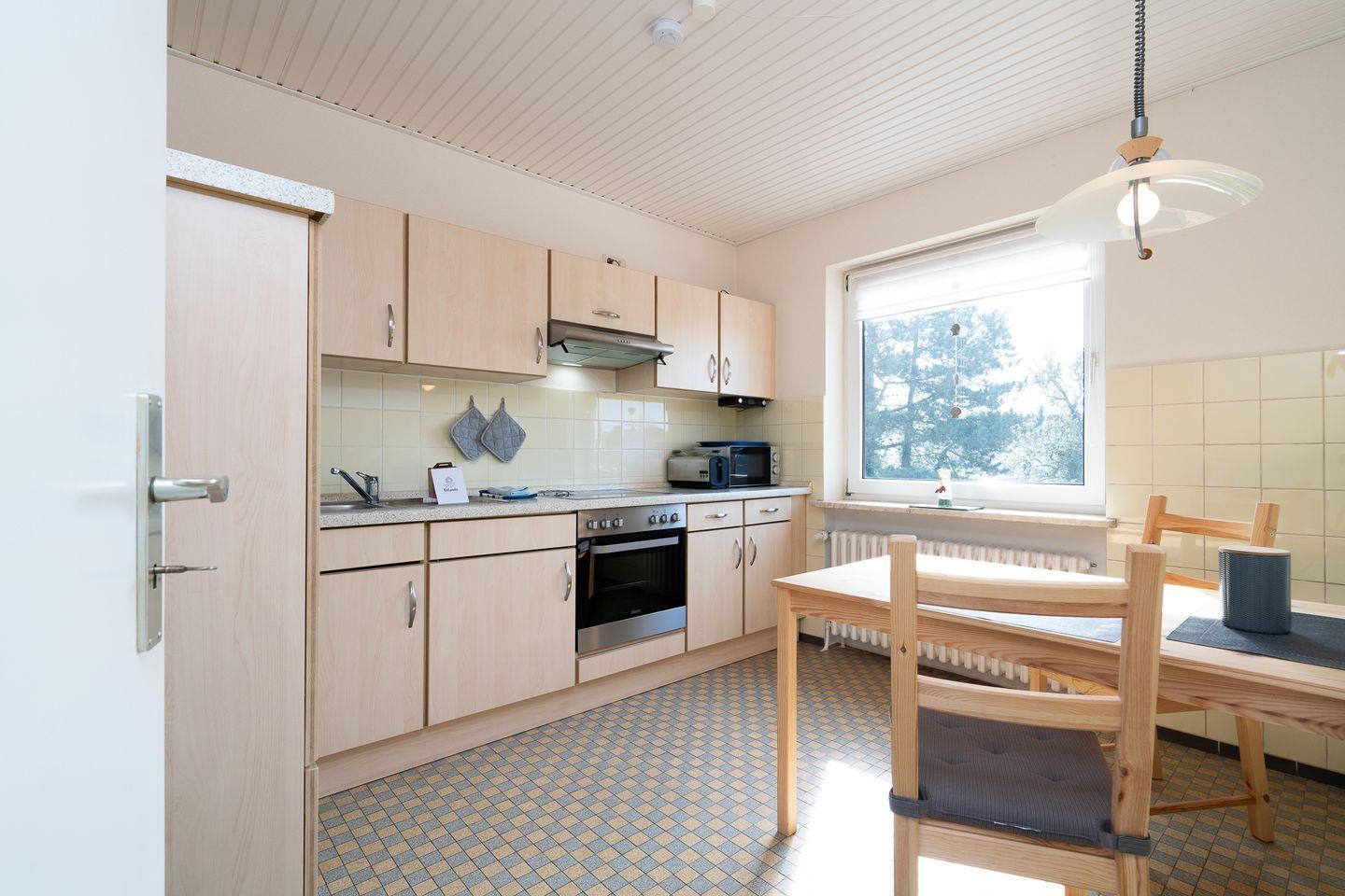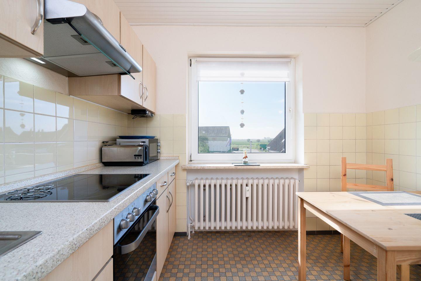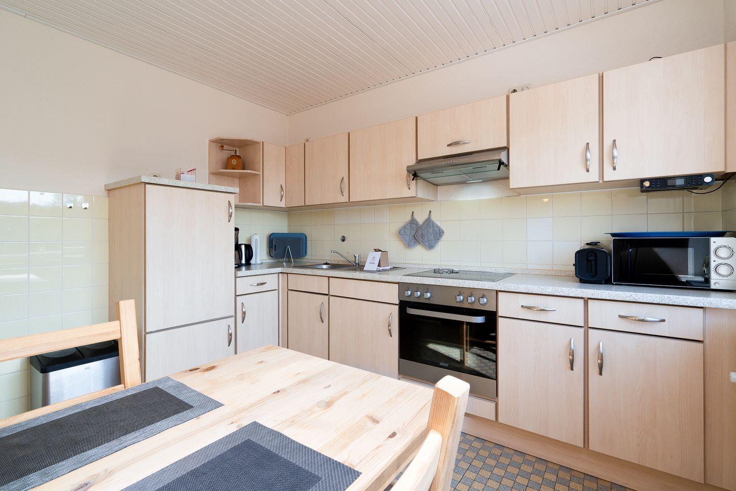 Die 60 m² große Ferienwohnung im 1. Obergeschoss bietet Platz für 2 Gäste und ist ideal für Radfahrer. Sie verfügt über ein Schlafzimmer, ein Badezimmer und eine separate, gut ausgestattete Küche mit Herd, Backofen, Mikrowelle, Kühlschrank, Kaffeemaschine und Gefriermöglichkeit. Eine möblierte Terrasse mit Grillplatz, Markise, Strandkorb und Sonnenliegen lädt zum Entspannen ein. Hunde sind herzlich willkommen.