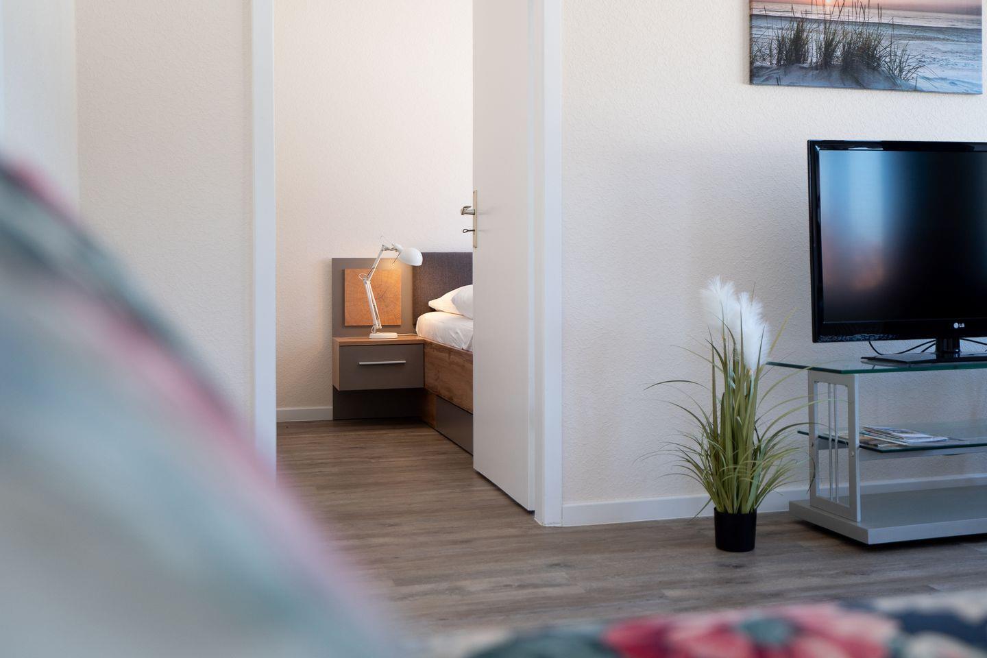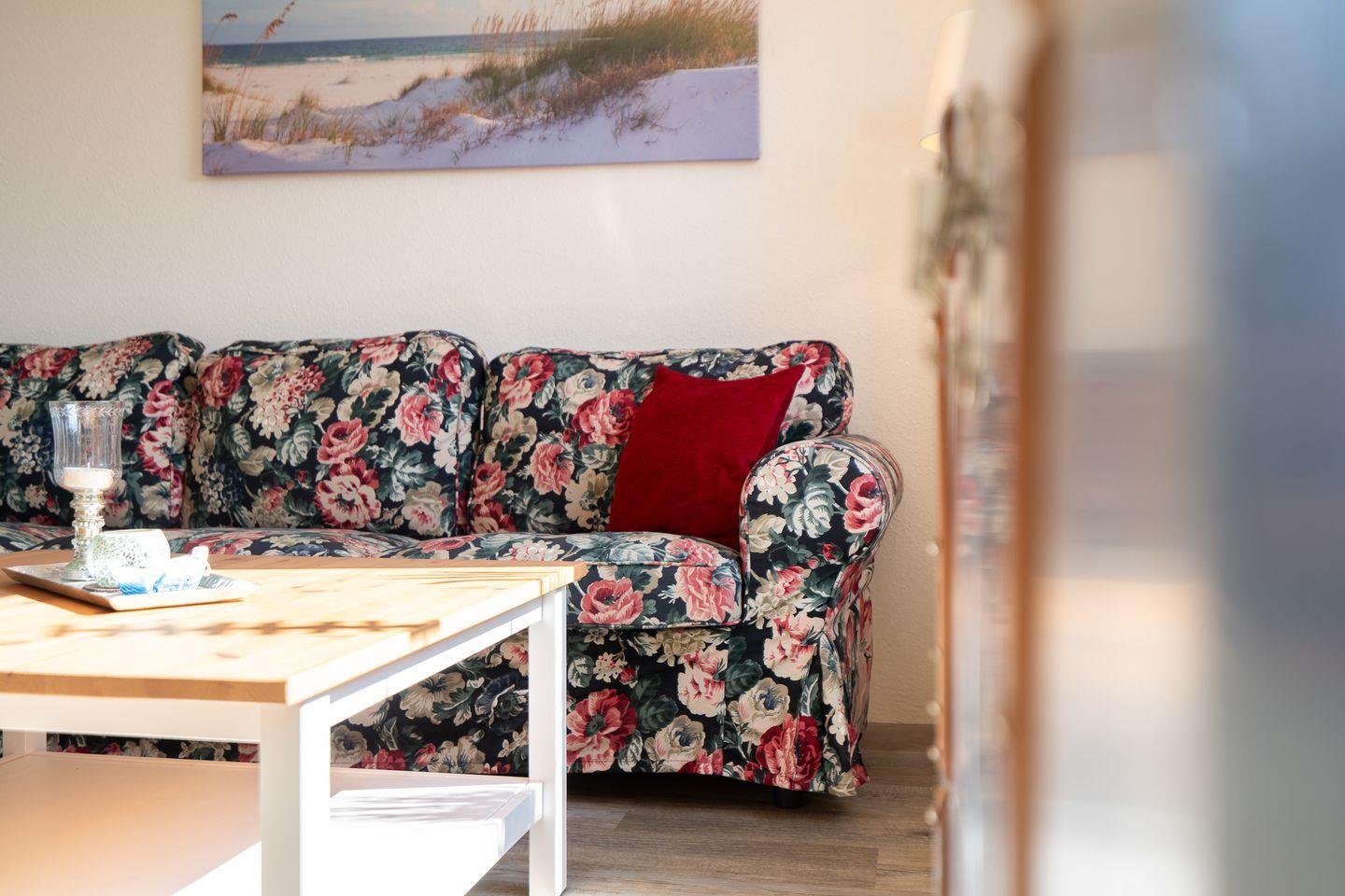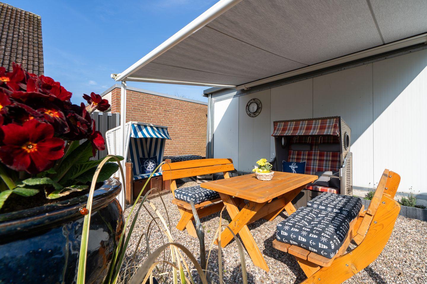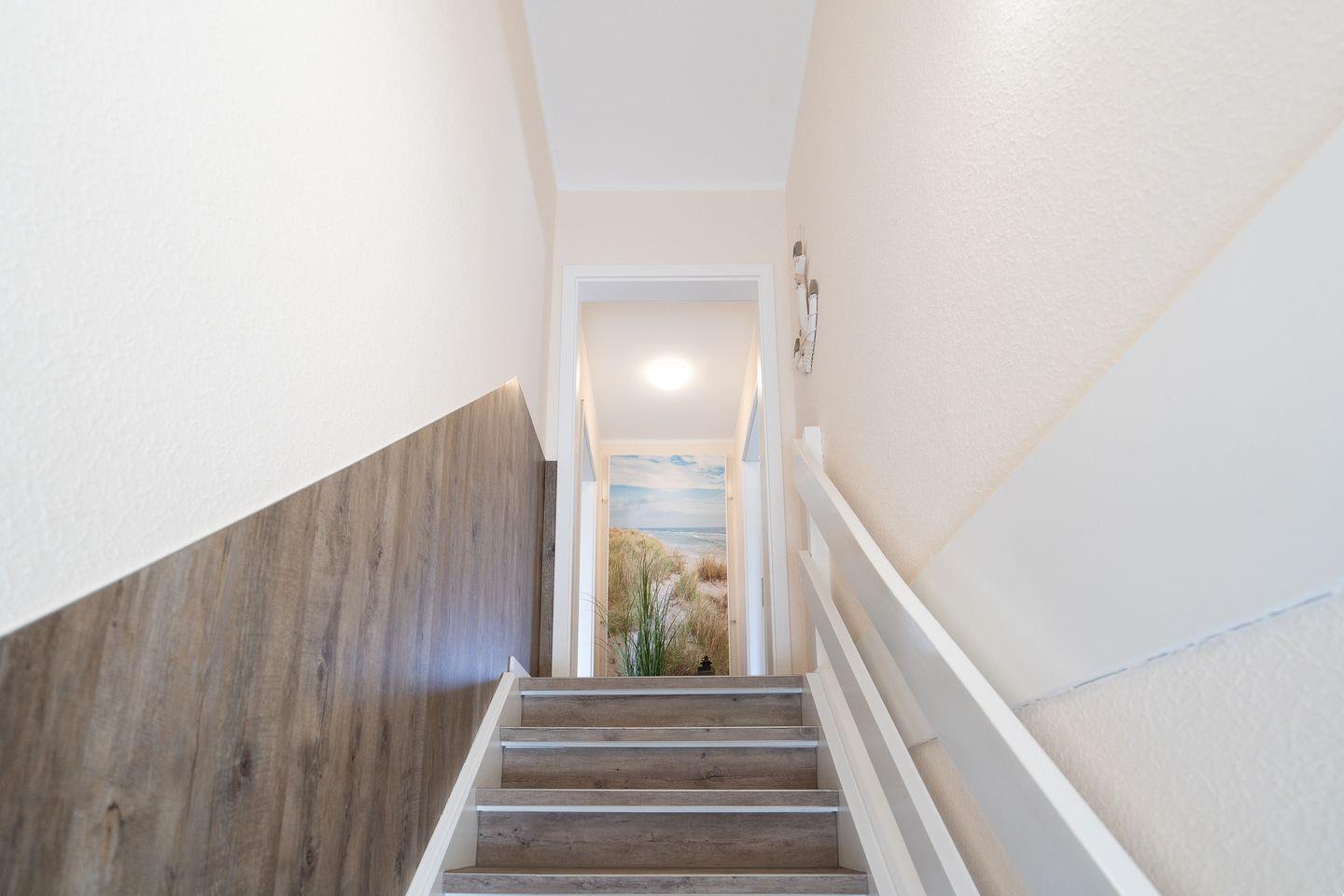 Die 60 m² große Ferienwohnung im 1. Obergeschoss bietet Platz für 2 Gäste und ist ideal für Radfahrer. Sie verfügt über ein Schlafzimmer, ein Badezimmer und eine separate, gut ausgestattete Küche mit Herd, Backofen, Mikrowelle, Kühlschrank, Kaffeemaschine und Gefriermöglichkeit. Eine möblierte Terrasse mit Grillplatz, Markise, Strandkorb und Sonnenliegen lädt zum Entspannen ein. Hunde sind herzlich willkommen.