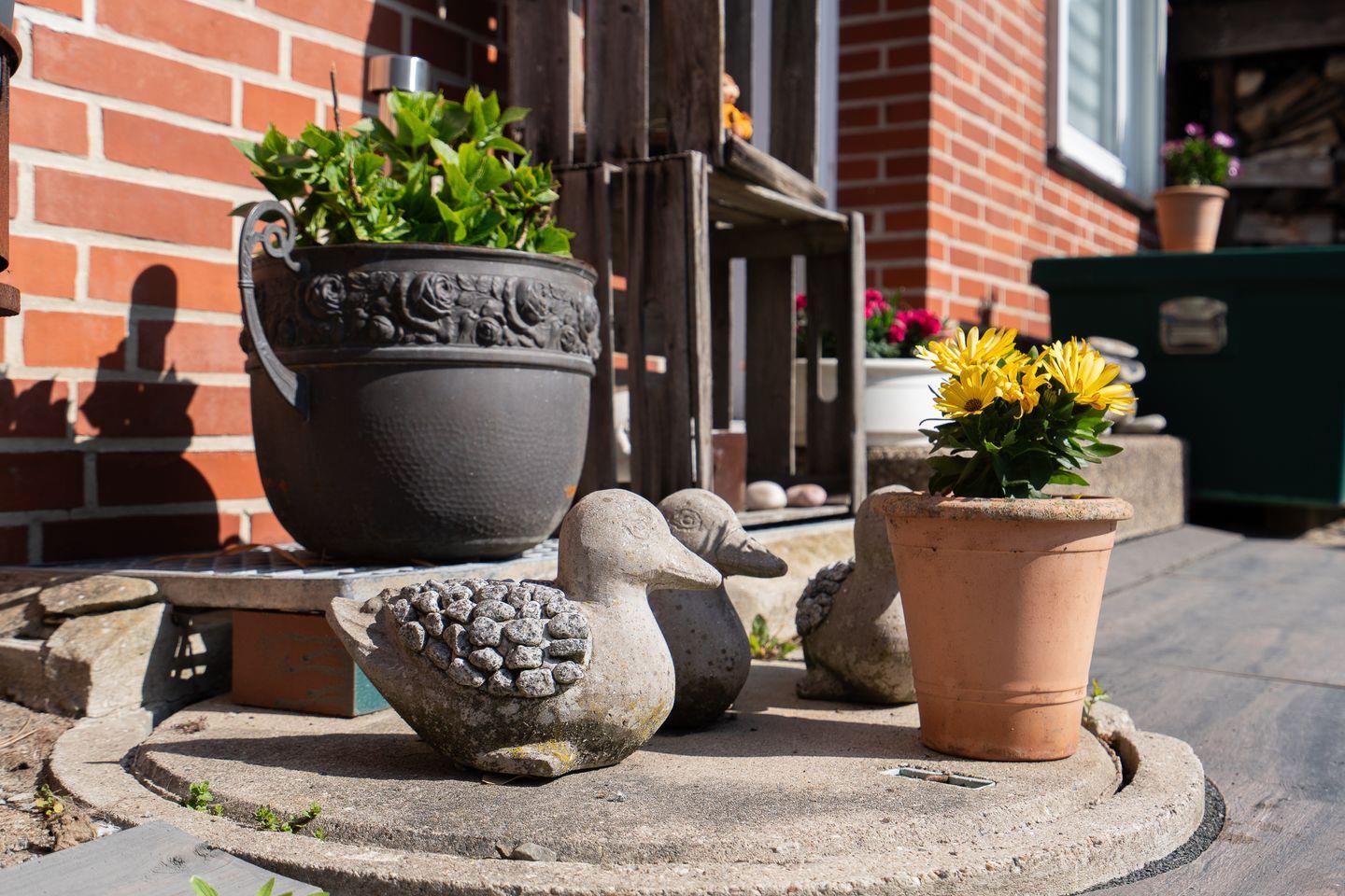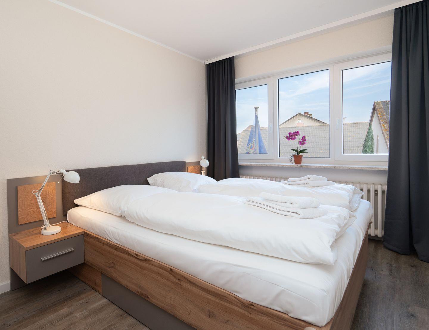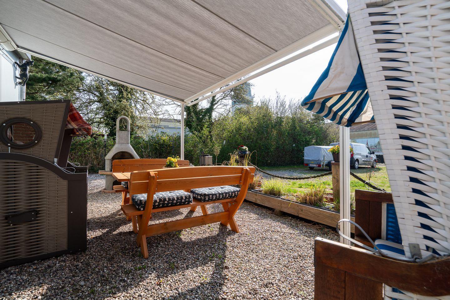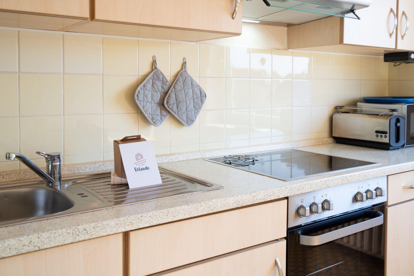 Die 60 m² große Ferienwohnung im 1. Obergeschoss bietet Platz für 2 Gäste und ist ideal für Radfahrer. Sie verfügt über ein Schlafzimmer, ein Badezimmer und eine separate, gut ausgestattete Küche mit Herd, Backofen, Mikrowelle, Kühlschrank, Kaffeemaschine und Gefriermöglichkeit. Eine möblierte Terrasse mit Grillplatz, Markise, Strandkorb und Sonnenliegen lädt zum Entspannen ein. Hunde sind herzlich willkommen.