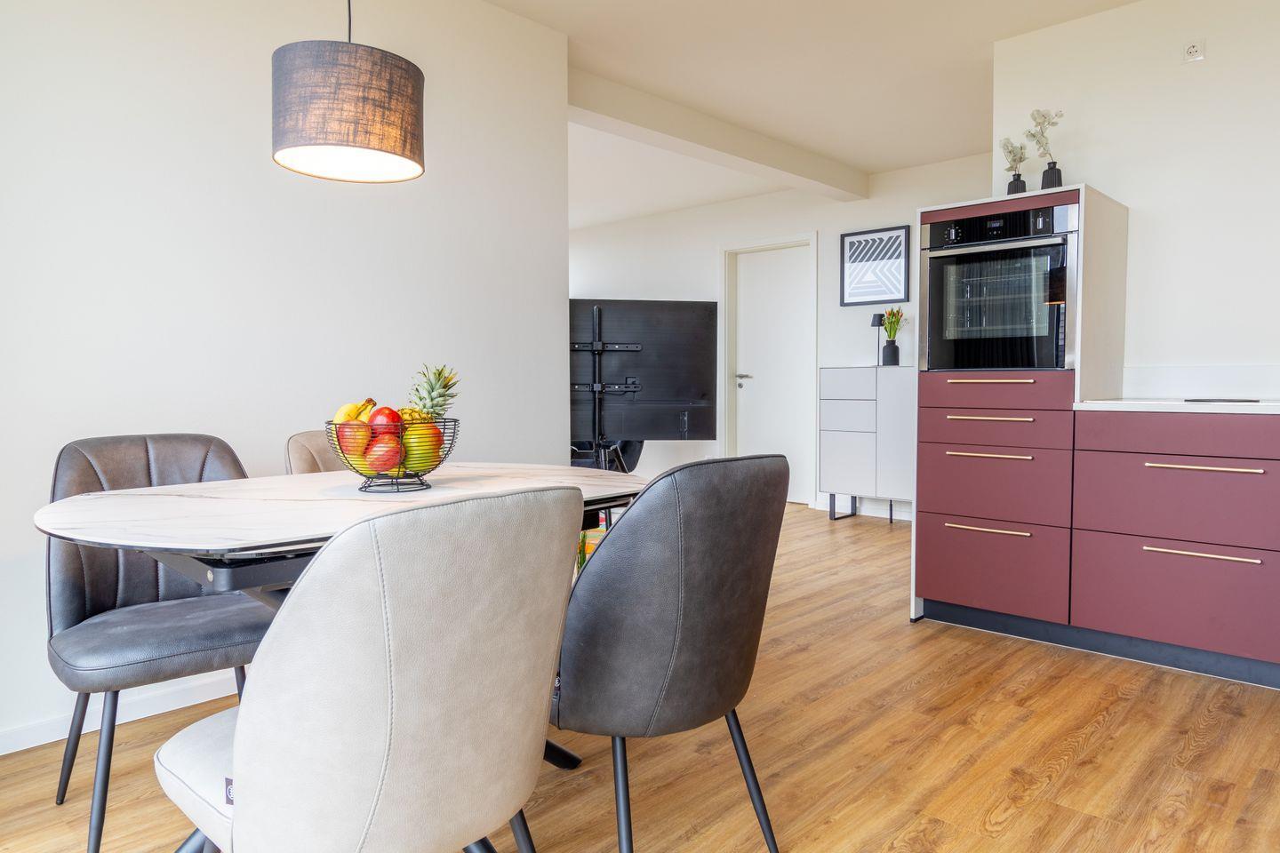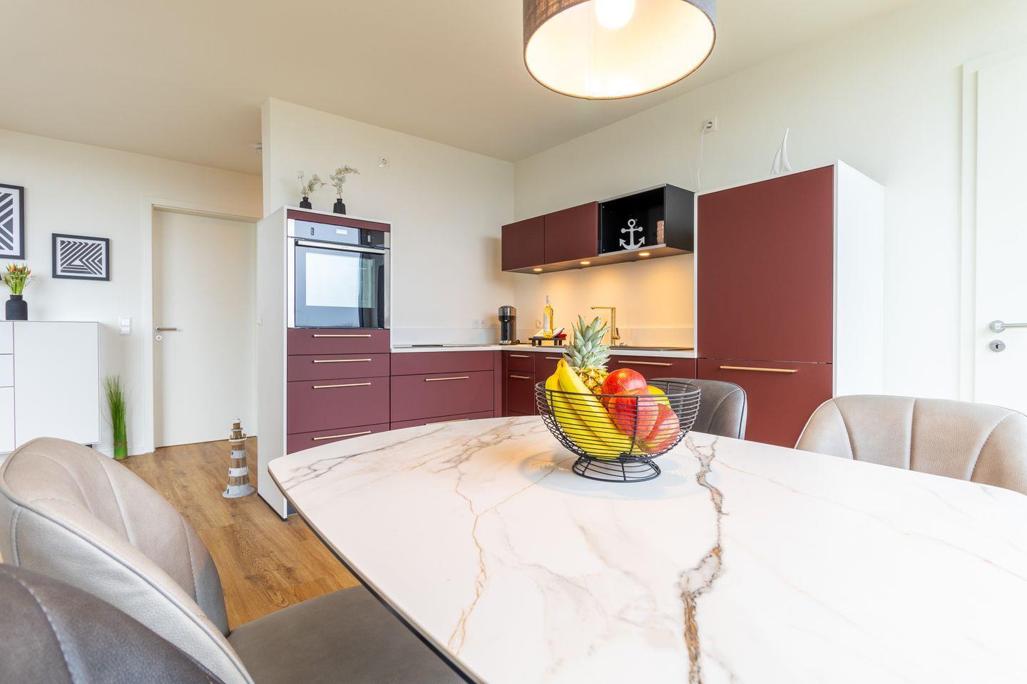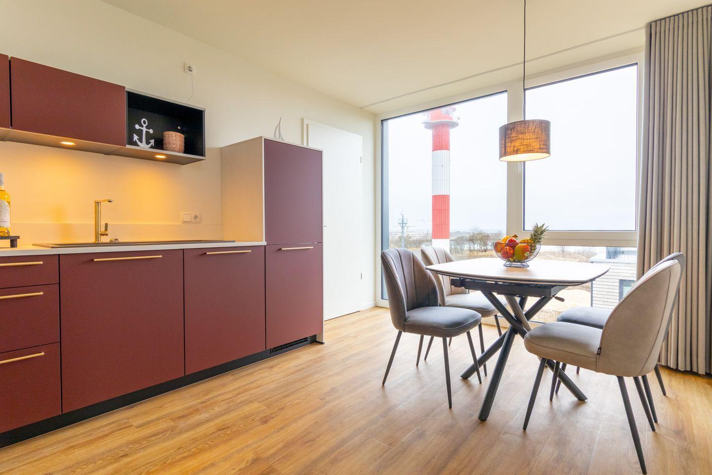 Der offen gestaltete Wohnbereich verbindet warmes Design mit großen Fensterflächen. Ein Smart-TV sorgt für Unterhaltung, während du vom gemütlichen Sofa oder vom Essplatz aus das Meer im Blick hast. Die voll ausgestattete Küche mit Ceran-Kochfeld, Backofen, Geschirrspüler und Kaffeemaschine lässt keine Wünsche offen – perfekt für entspannte Kochabende.