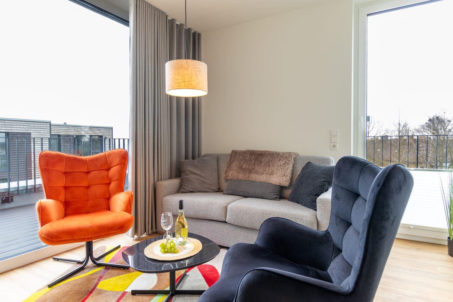 Im separaten Schlafzimmer erwarten dich ein komfortables Boxspringbett, bodentiefe Fenster, Verdunklungsmöglichkeiten und ein eigener Smart-TV. Für weitere Gäste oder Kinder steht im Wohnbereich ein bequemes Schlafsofa zur Verfügung, das Platz für zwei Kinder oder eine erwachsene Person bietet.