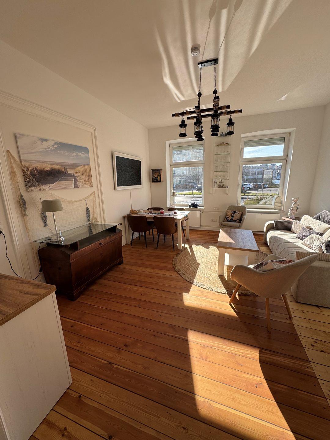Die Nachbarwohnung „Backbord“ bietet ebenfalls drei Schlafplätze und ist über eine abschließbare Zwischentür mit „Steuerbord“ verbunden. Auf Wunsch können beide Wohnungen gemeinsam angemietet werden – ideal, damit die ganze Familie im Urlaub ausreichend Platz findet.
