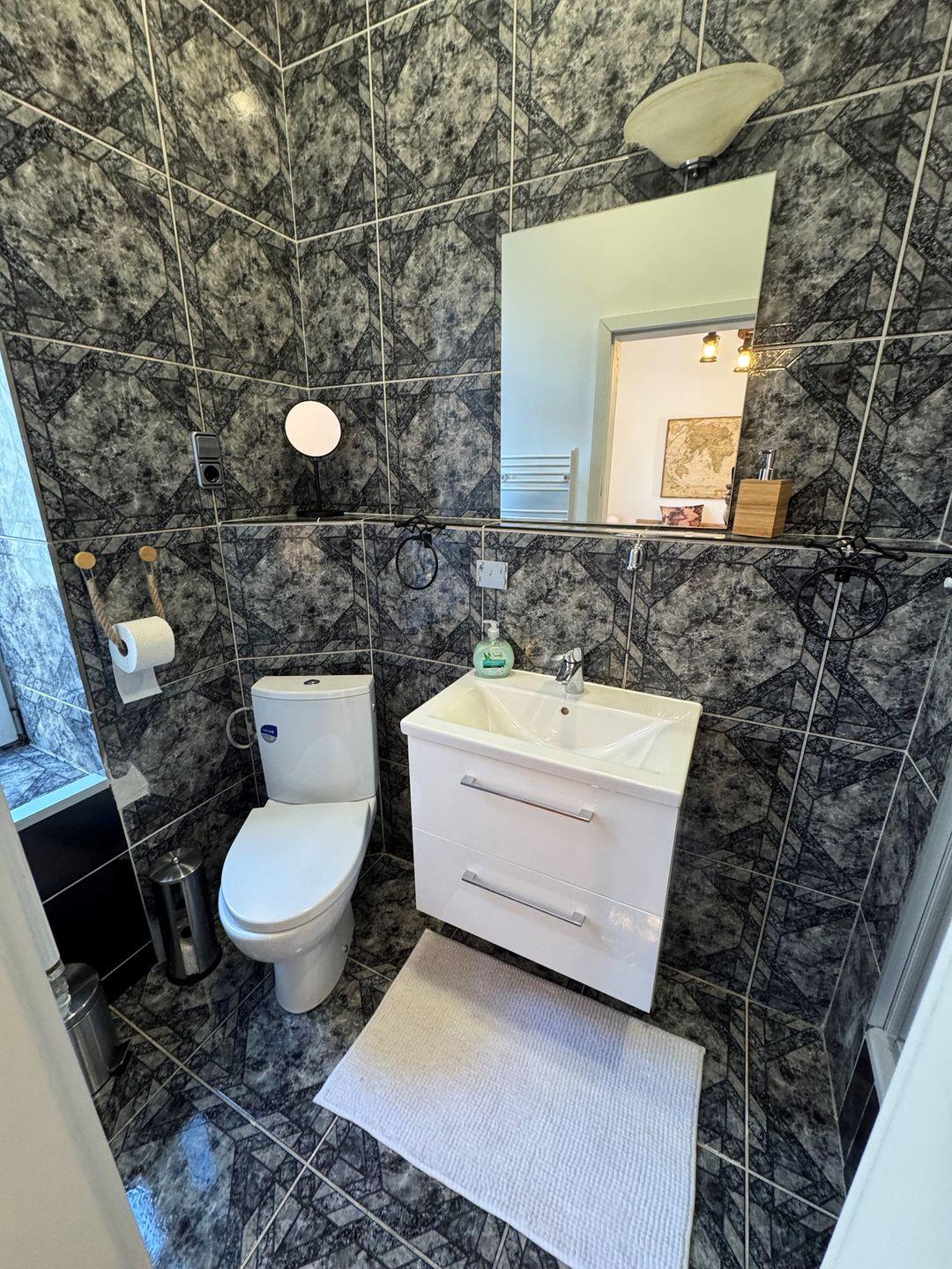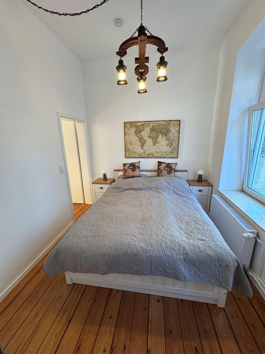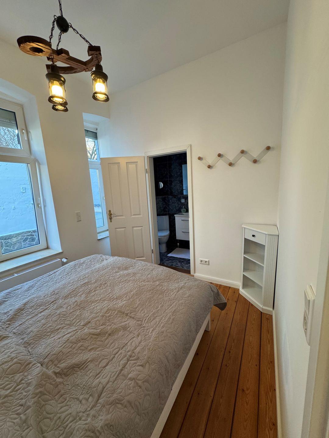 Das Schlafzimmer bietet Dir einen angenehmen Rückzugsort. Ein Doppelbett (160x200?cm), ein Kleiderschrank und eine Kommode sowie Rollläden sorgen für erholsame Nächte. Im Badezimmer, angrenzend an das Schlafzimmer, stehen Dir eine Dusche mit Duschtasse, Waschbecken, WC, Spiegel, Fenster und Haartrockner zur Verfügung. Ein Wäscheständer, ein Staubsauger, eine Garderobe und ein Schuhschrank runden die Ausstattung sinnvoll ab.